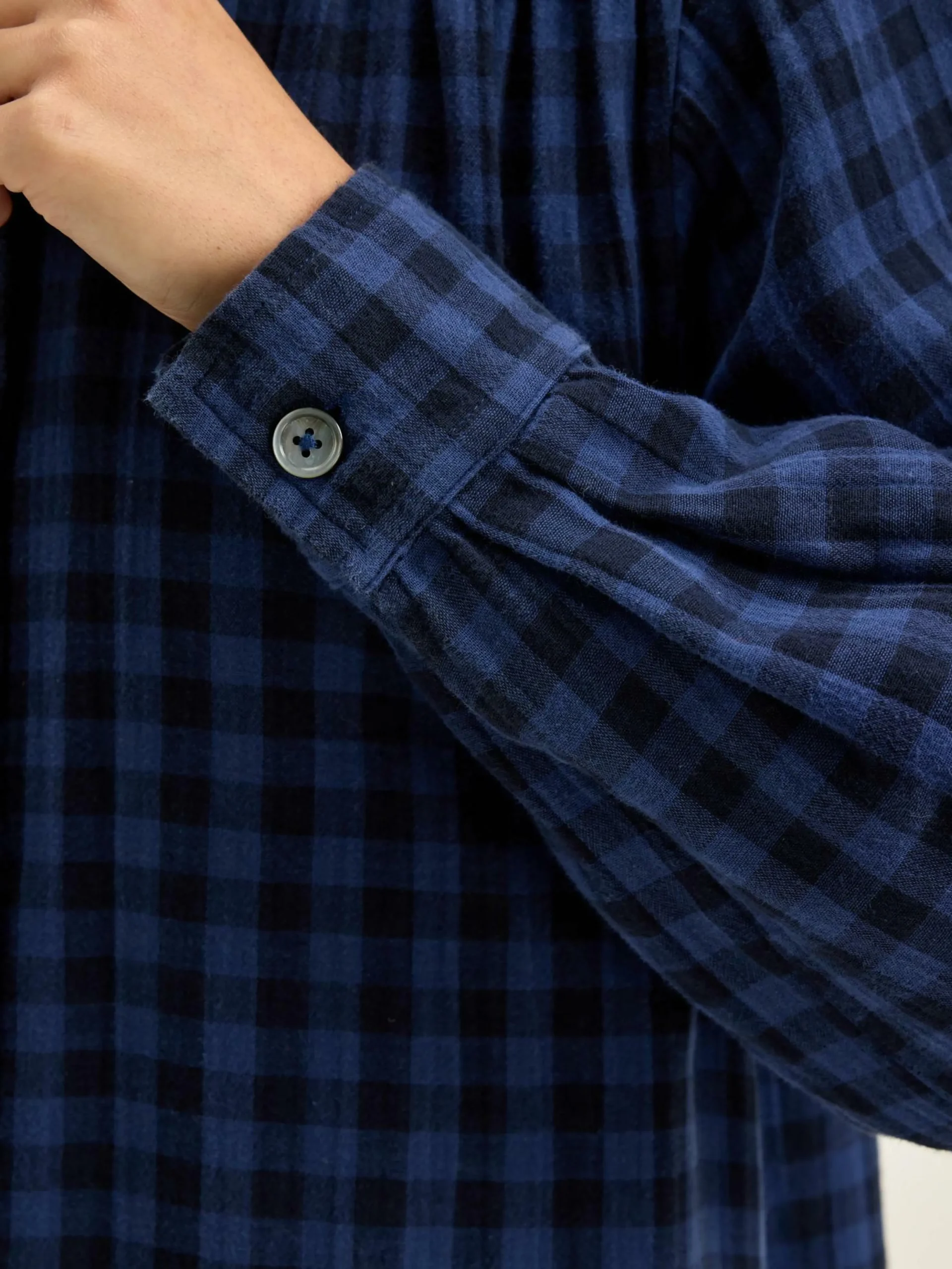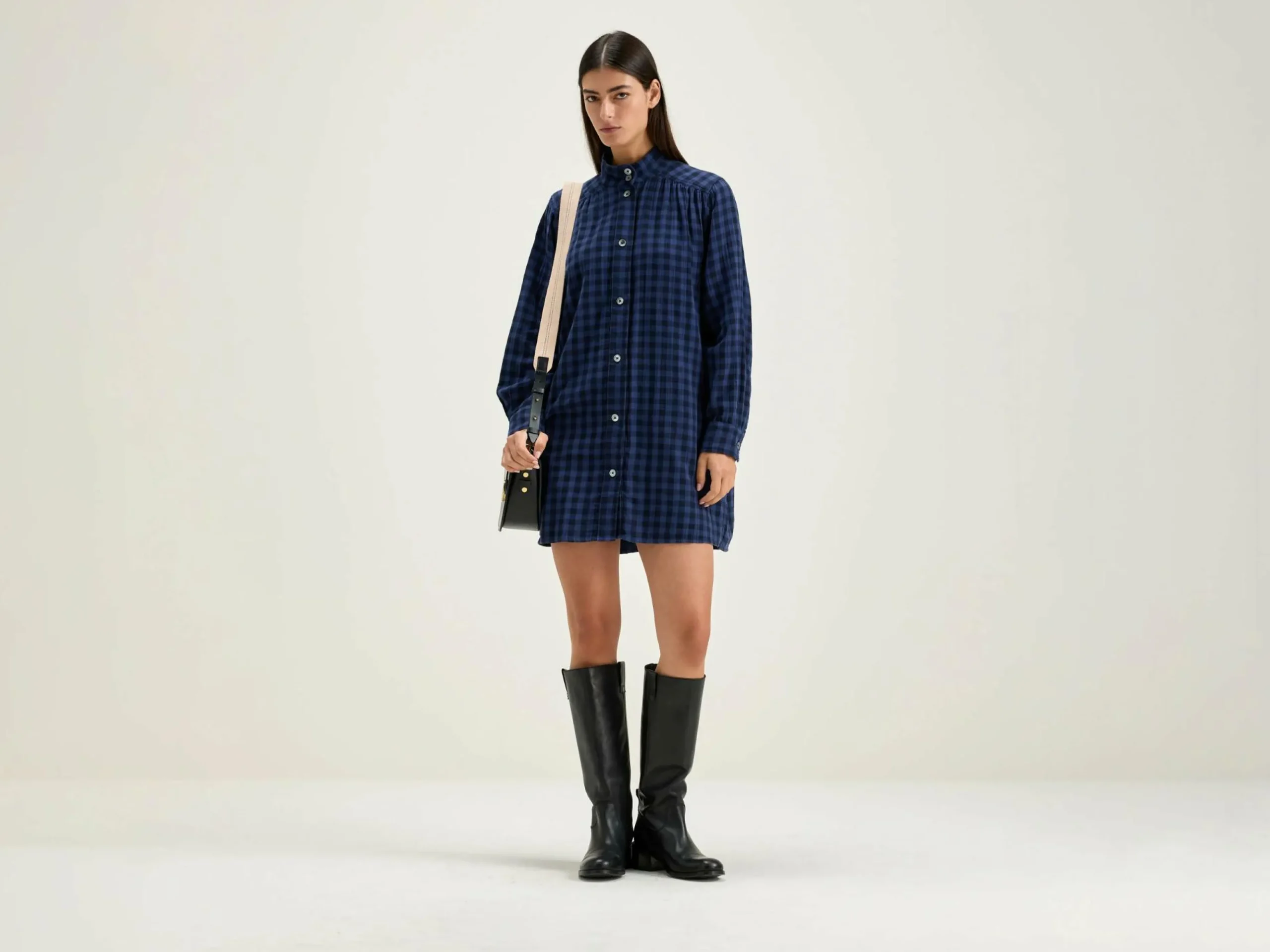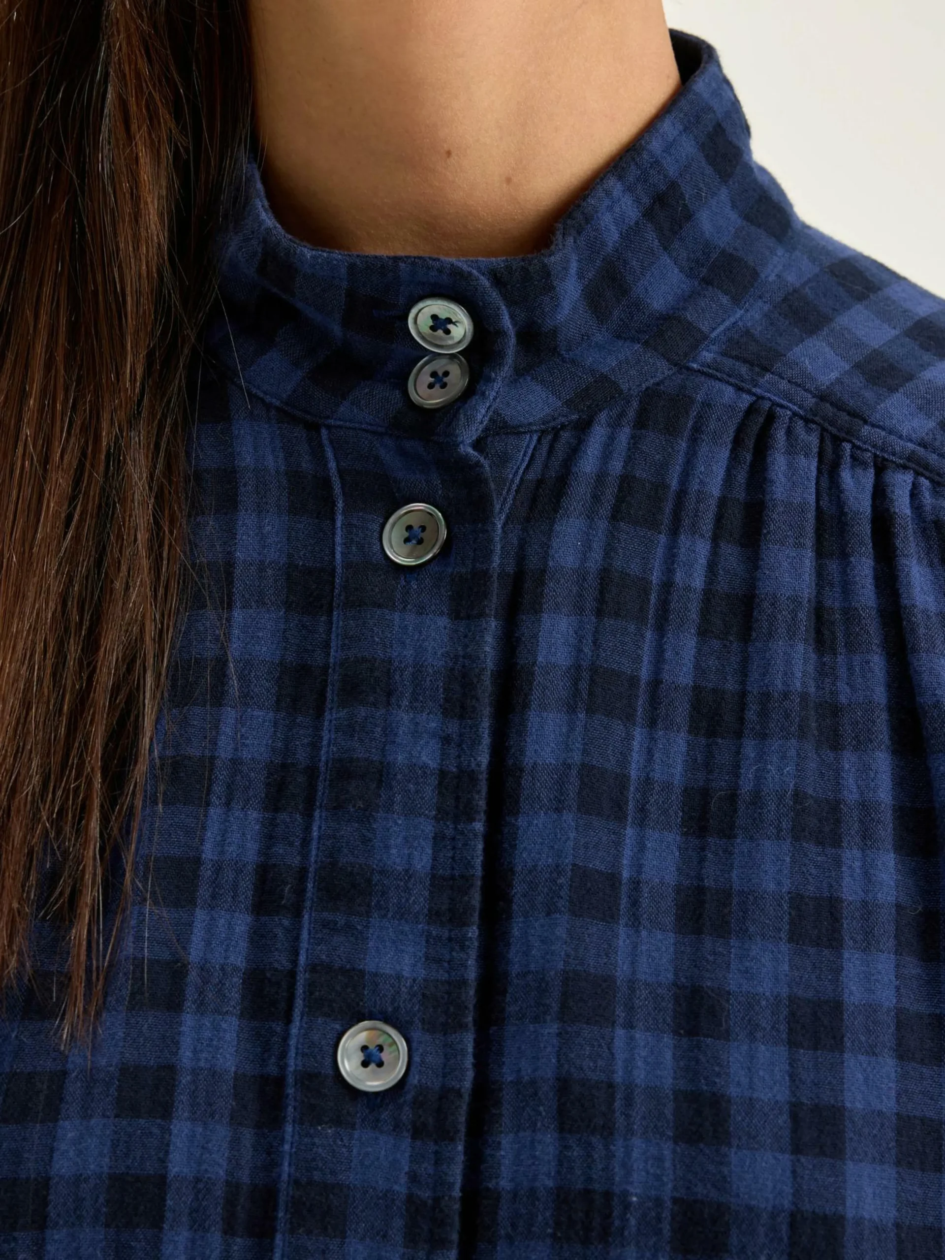 Robe chemise courte à col relevé et détails froncés en coton tubique à carreaux bleus.