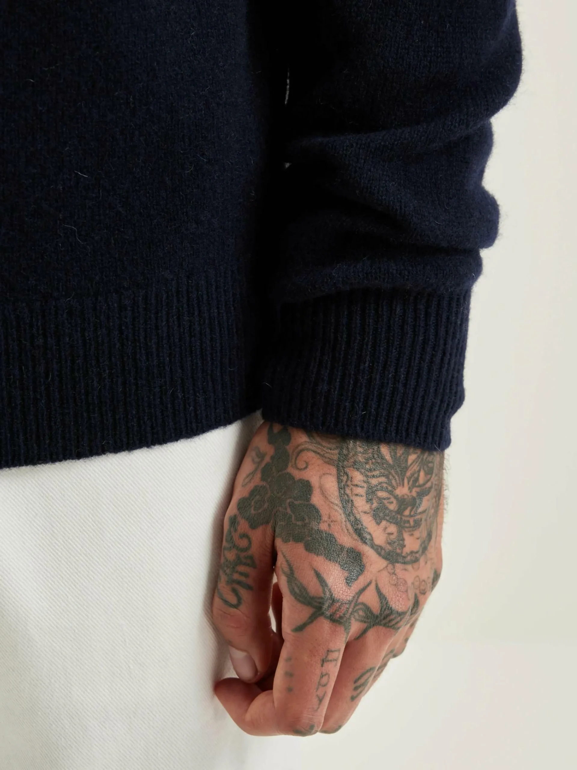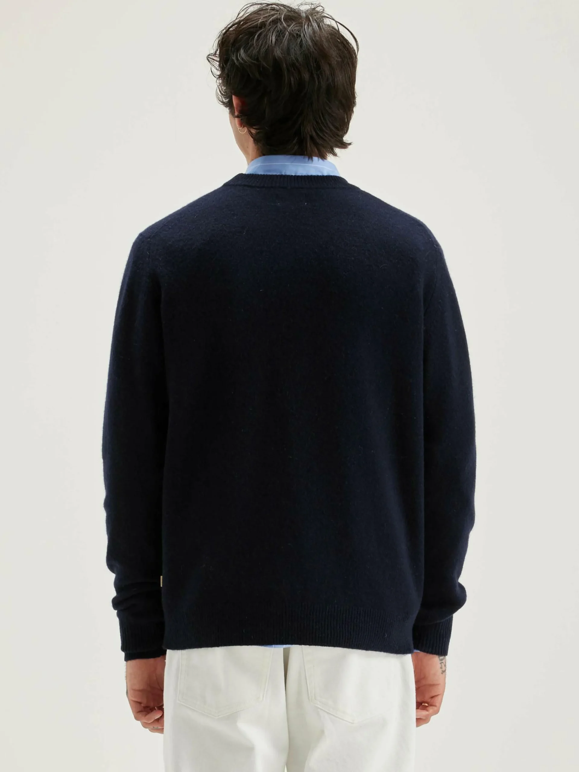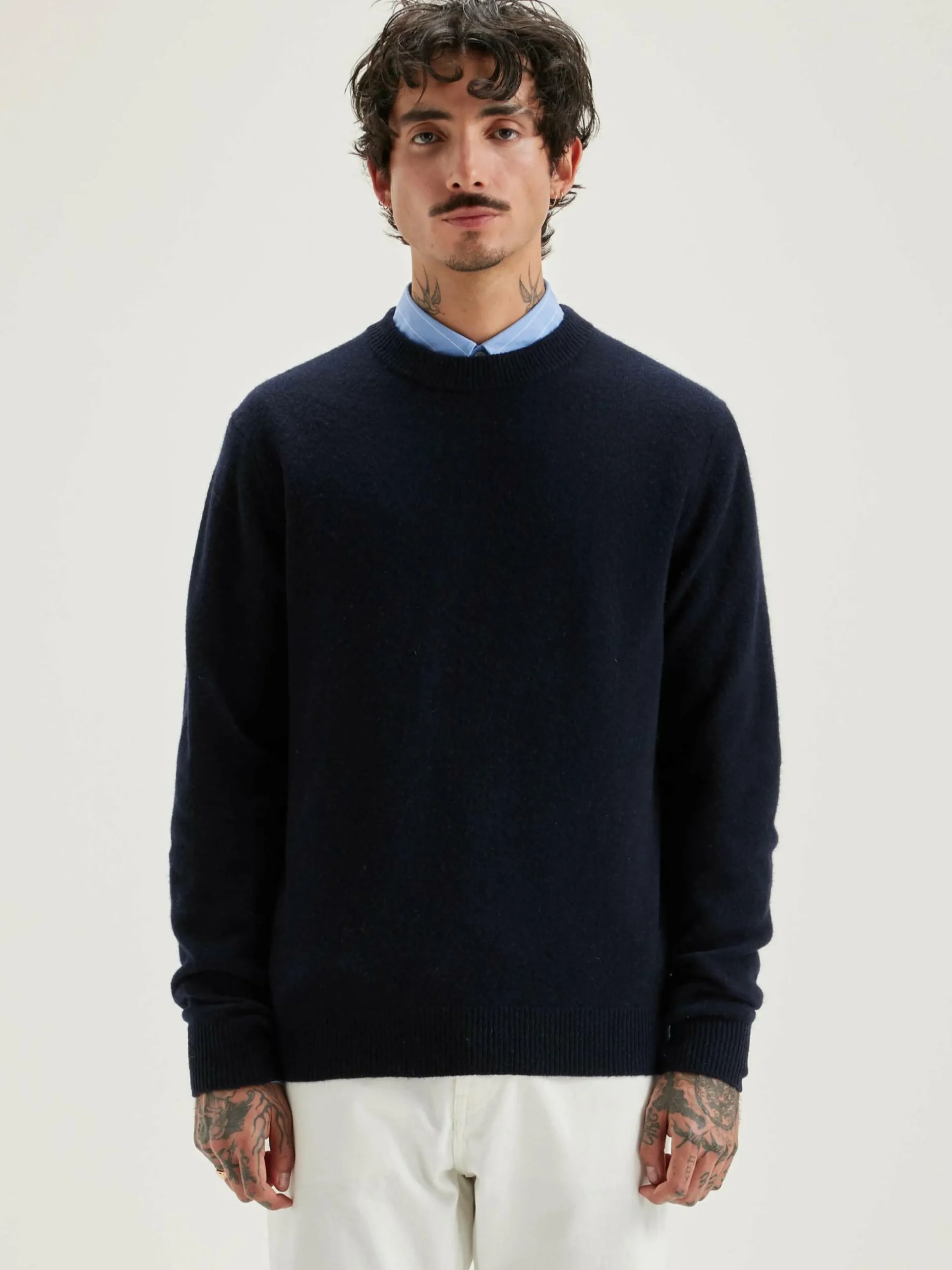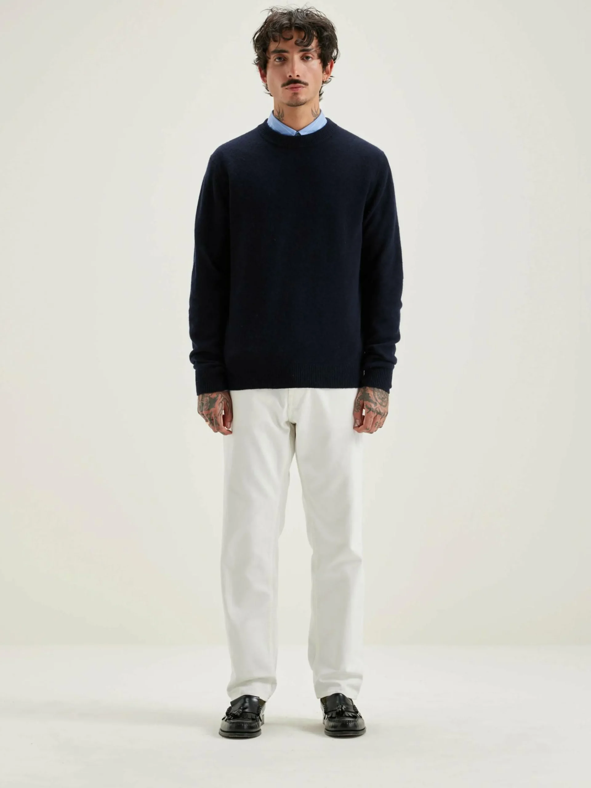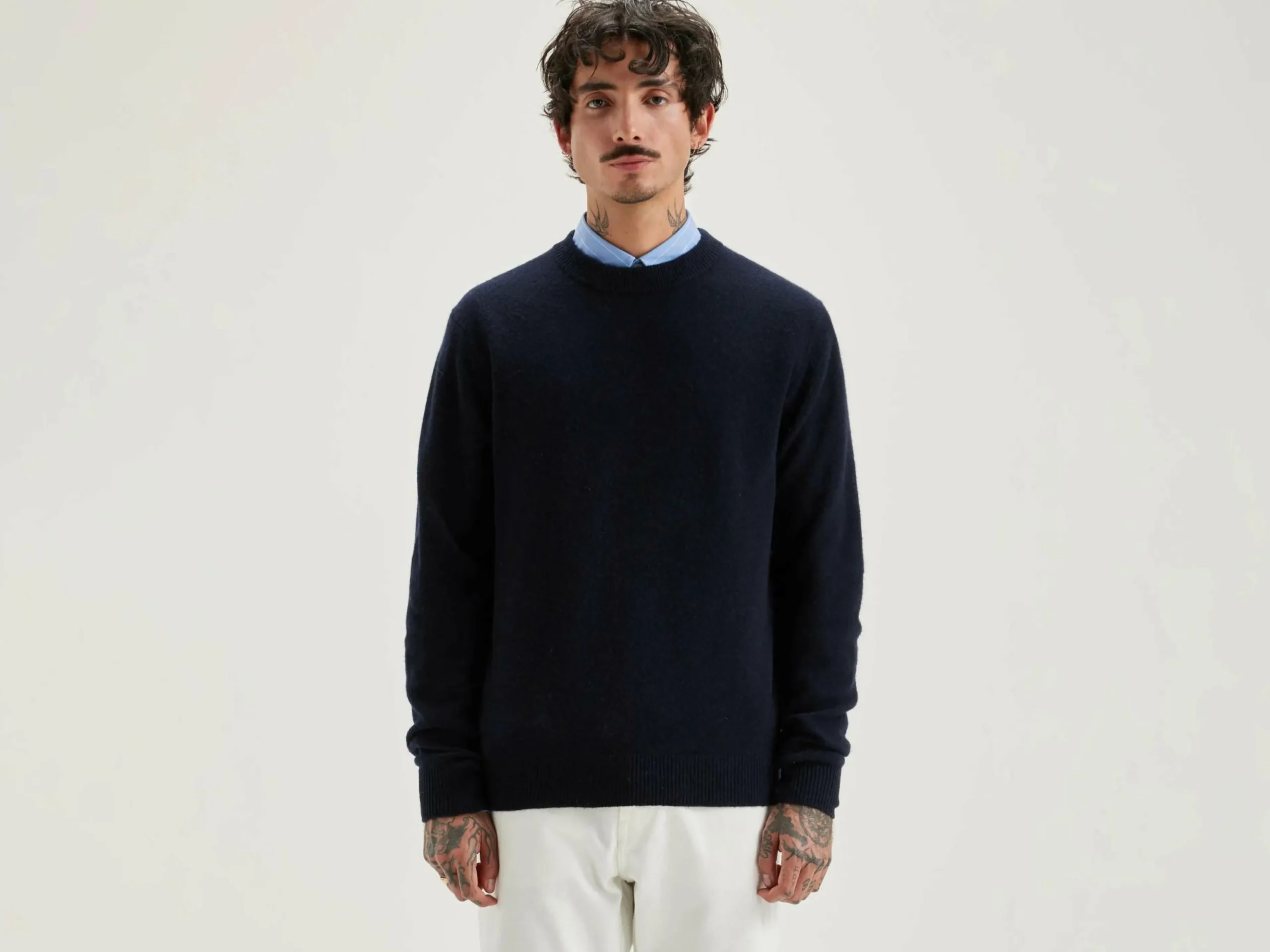 Pull classique à col ras du cou en laine mérinos bleu marine.