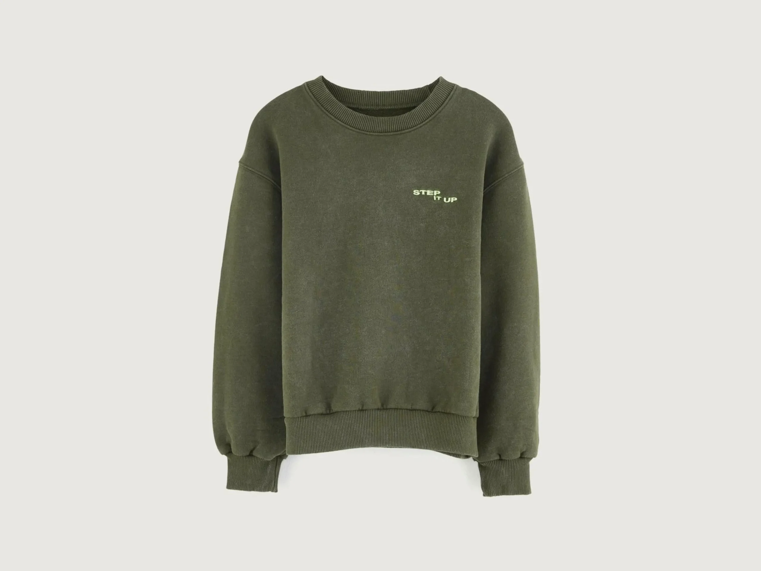 Sweatshirt décontracté à col rond en jersey brossé vert mousse avec imprimé « step it up » de Daniil Lavrovski.