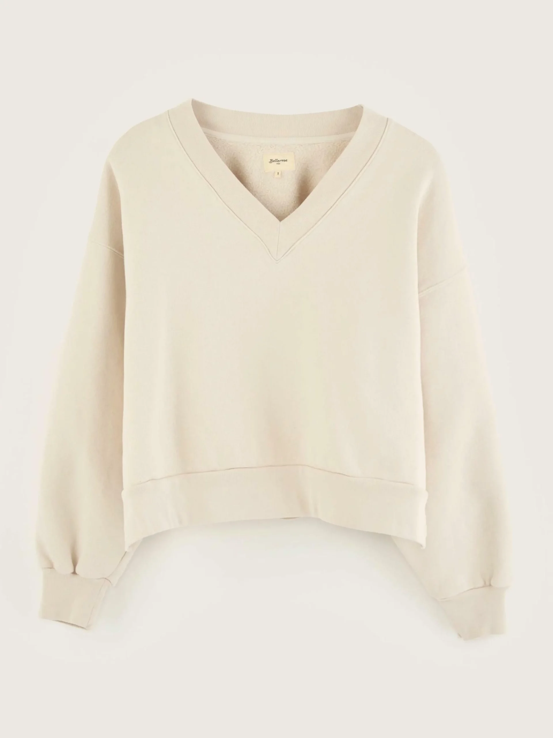 Sweatshirt écru à col V avec manches bouffantes et fentes latérales.