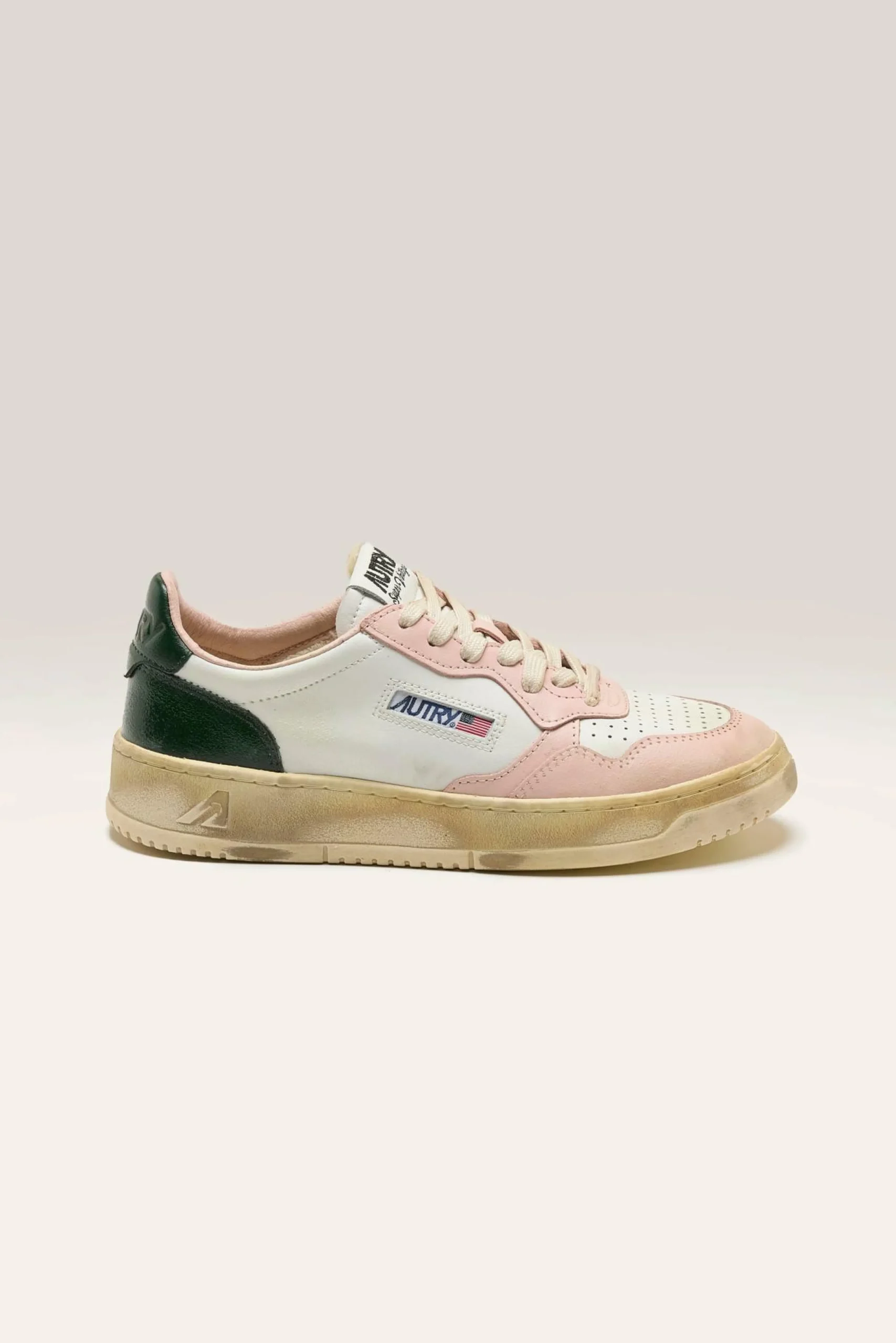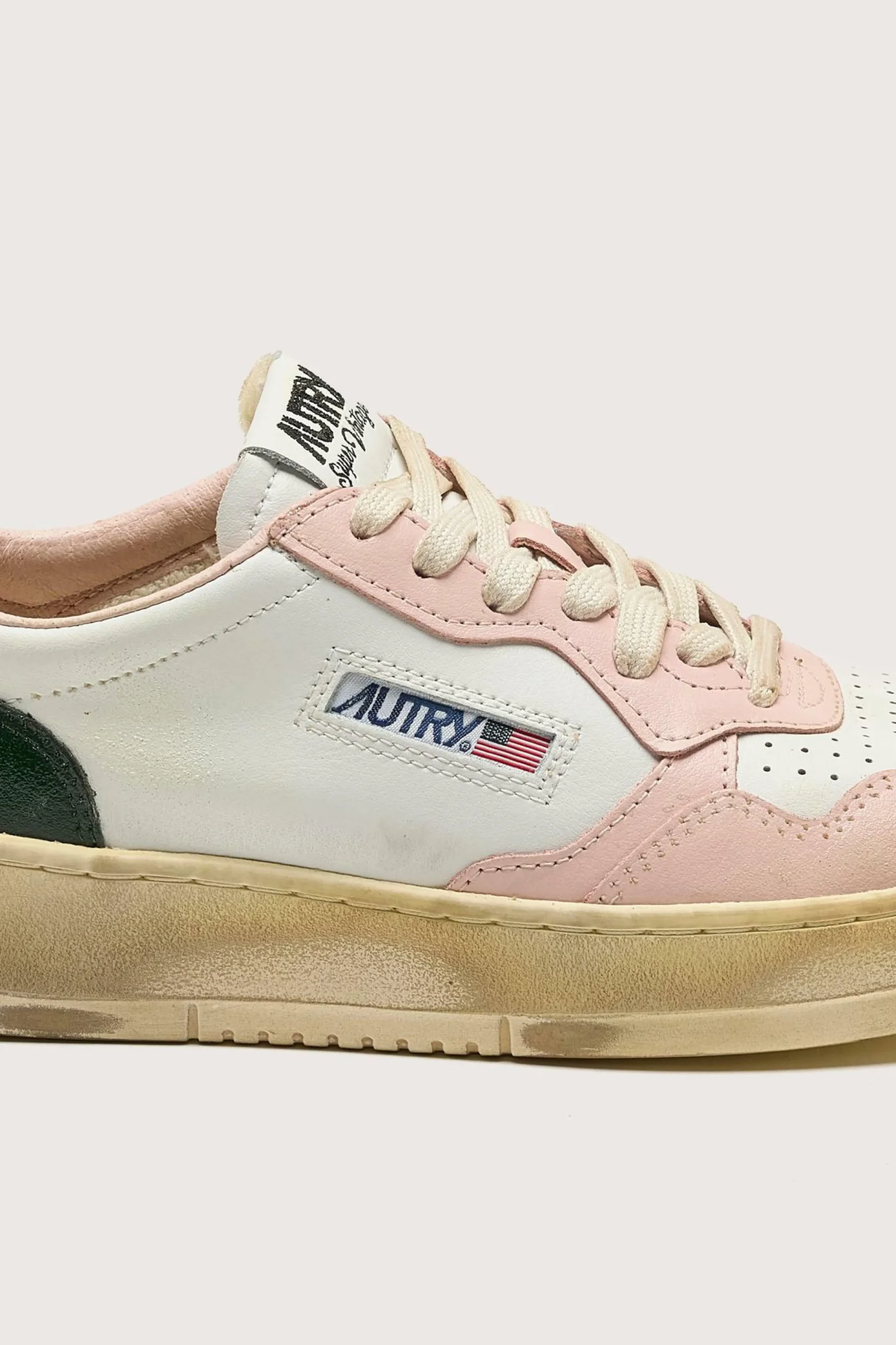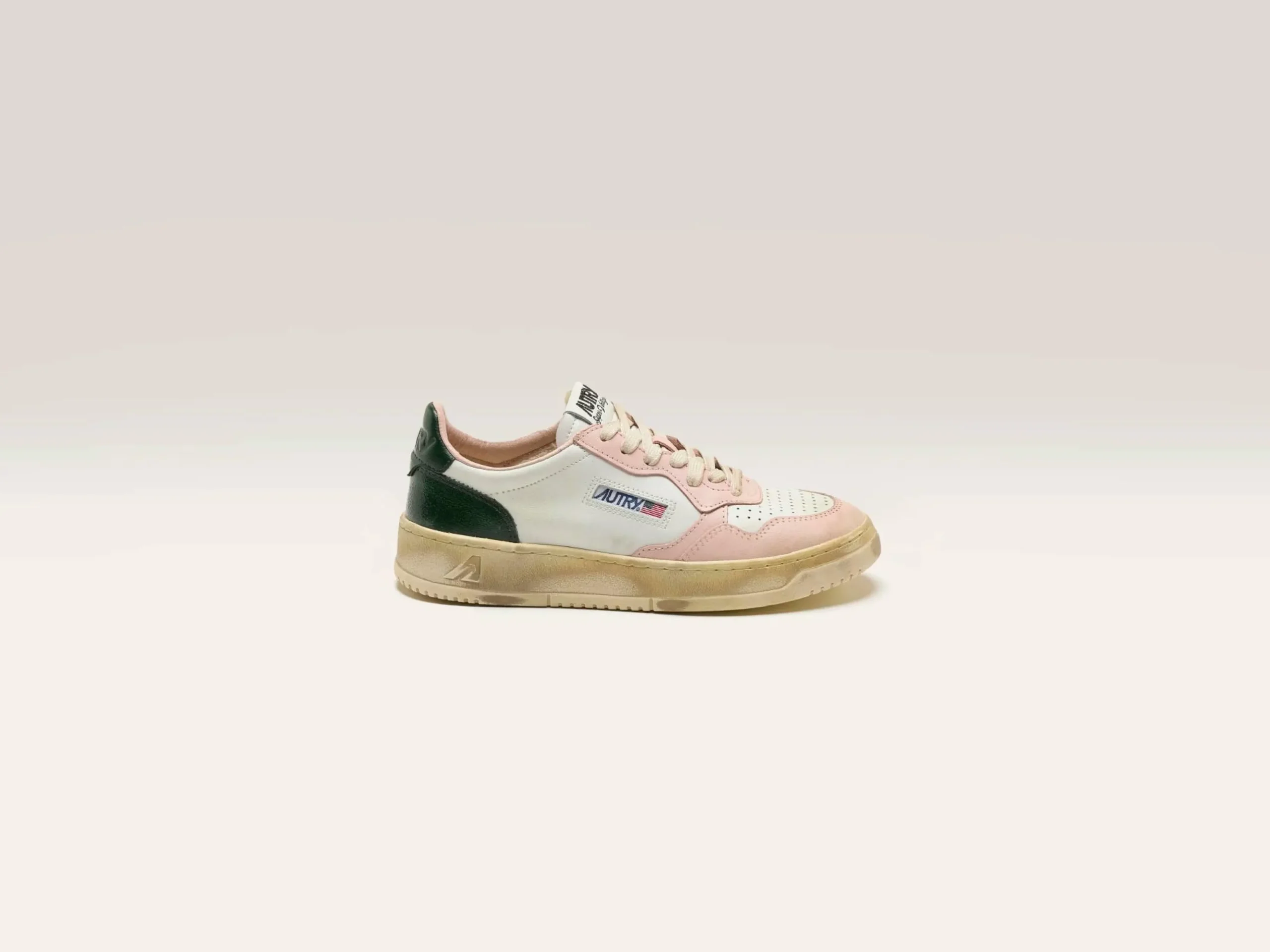 Les sneakers Autry Medalist Low Super Vintage présentent une tige en cuir et en suède blanc, avec un traitement artisanal dans des tons noirs et roses.