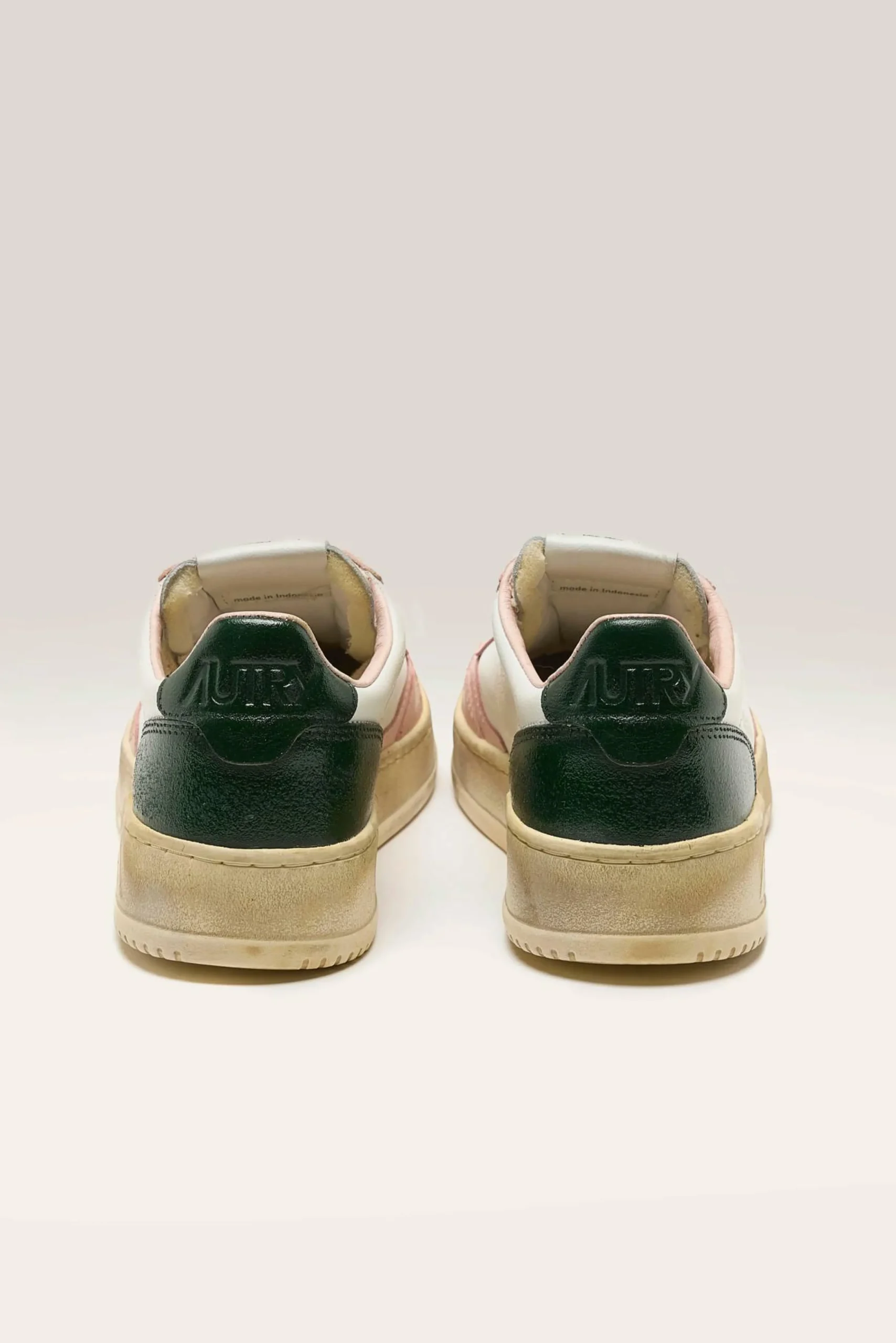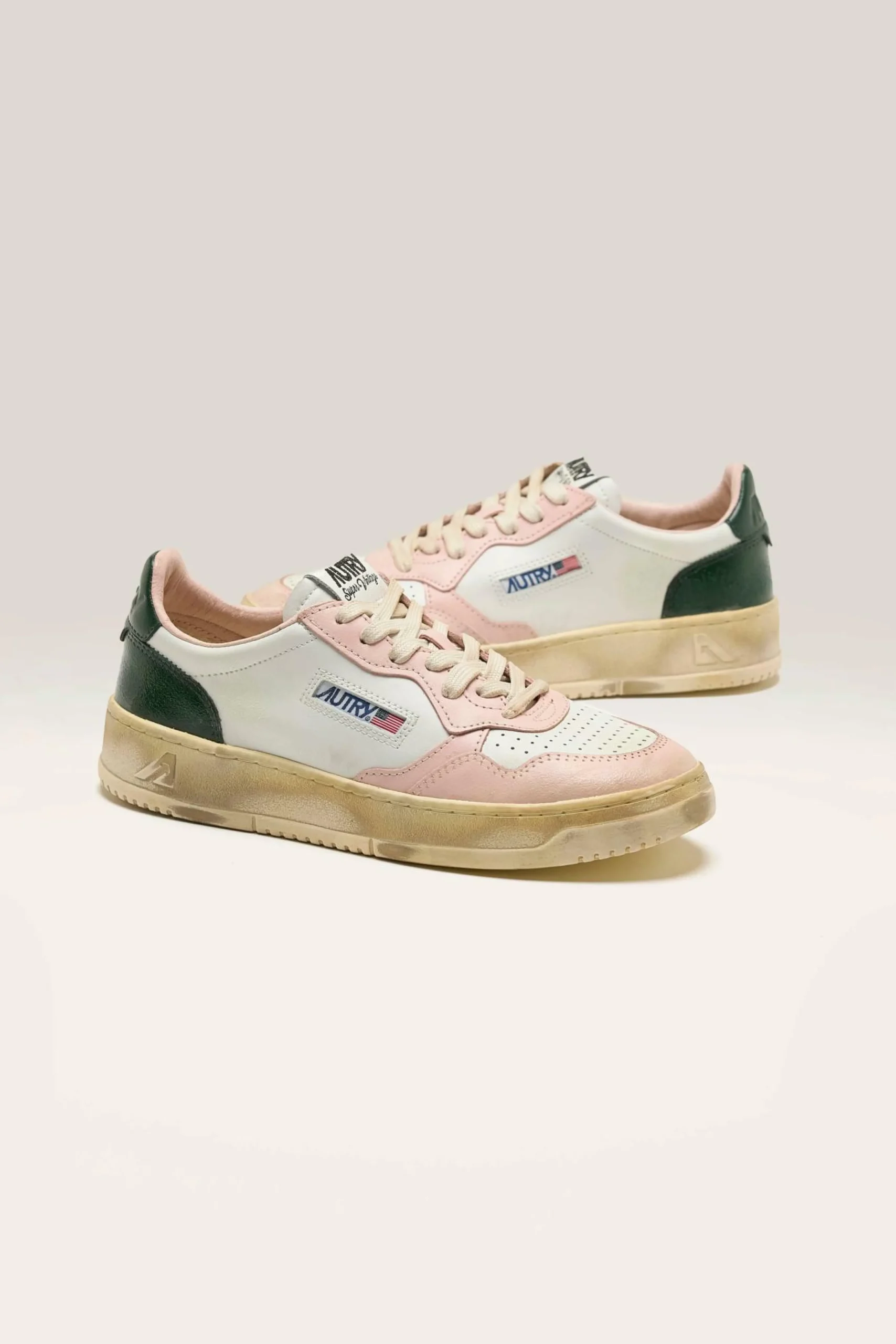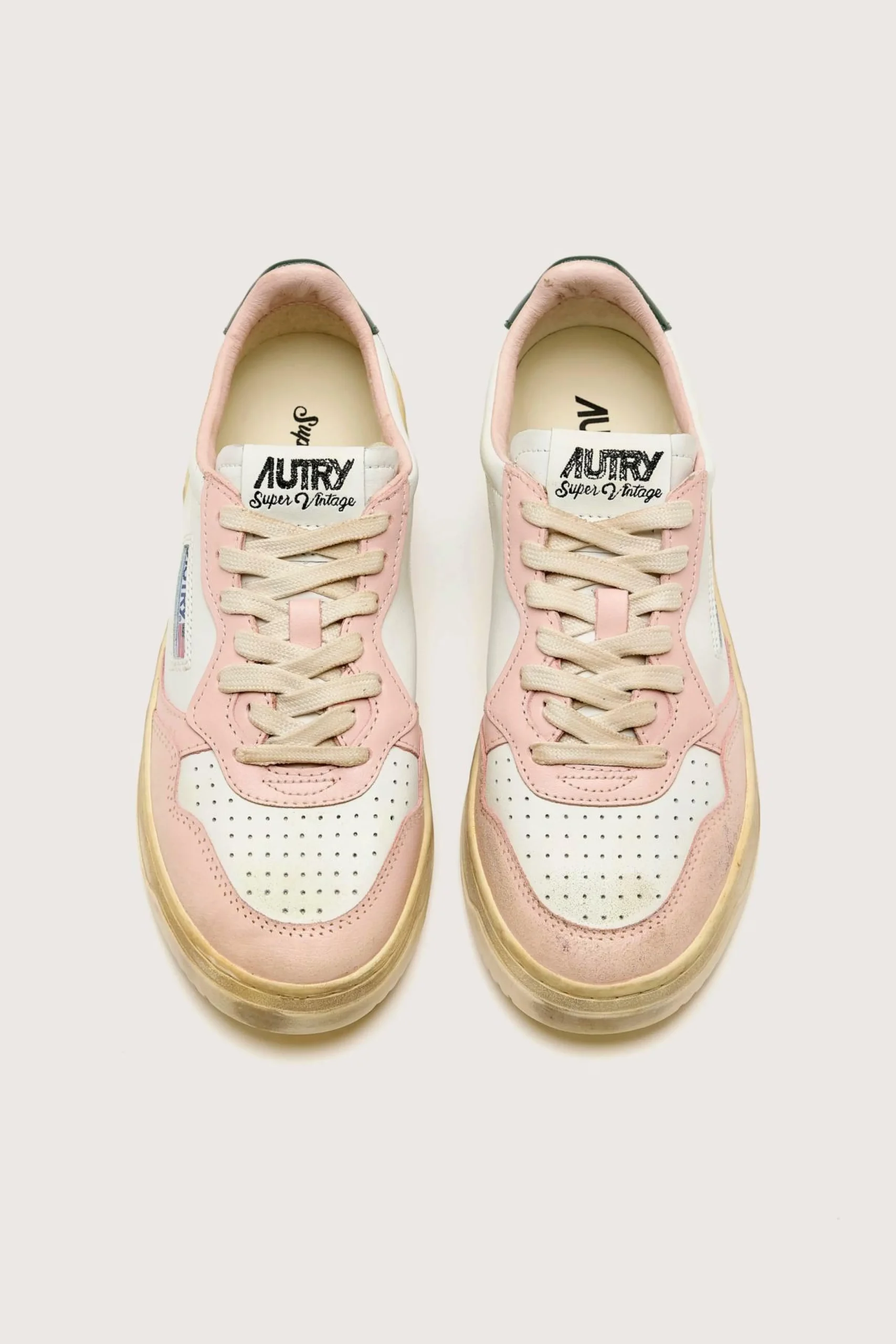 Les sneakers Autry Medalist Low Super Vintage présentent une tige en cuir et en suède blanc, avec un traitement artisanal dans des tons noirs et roses.