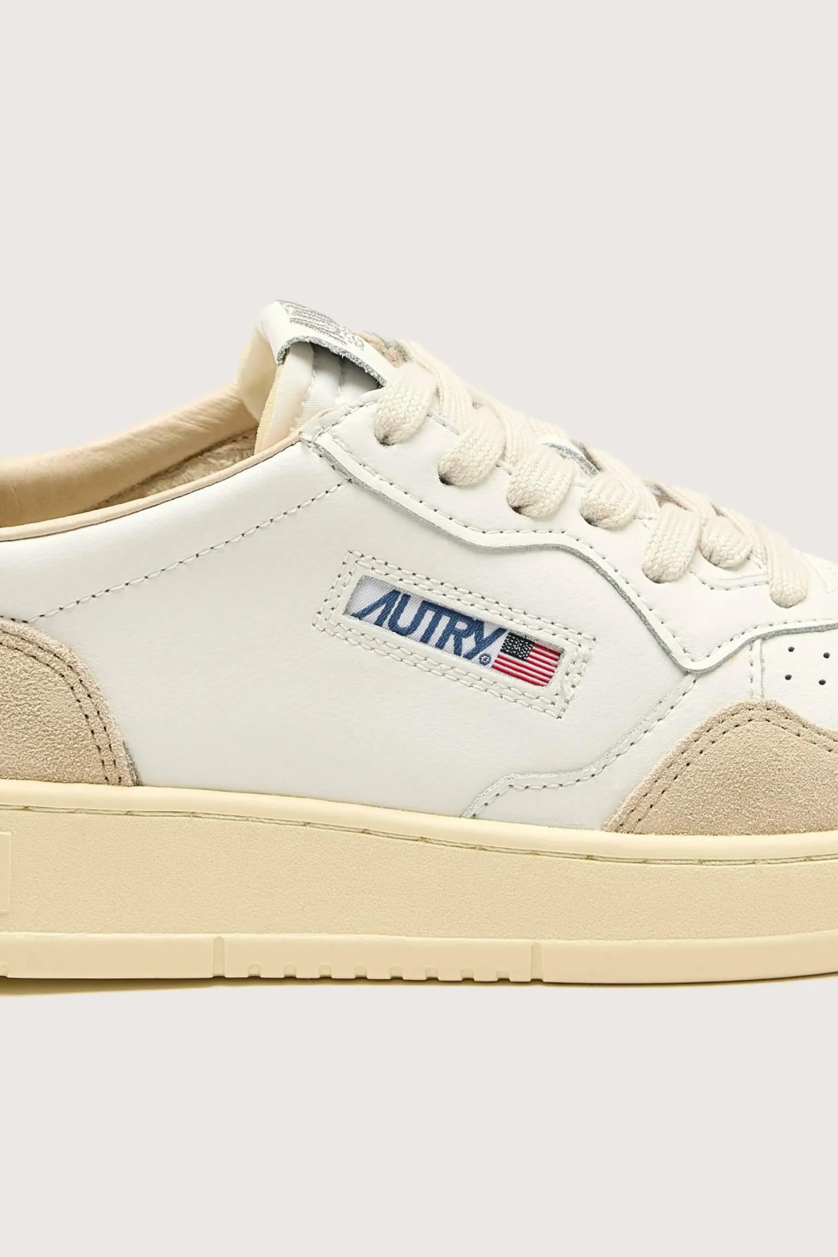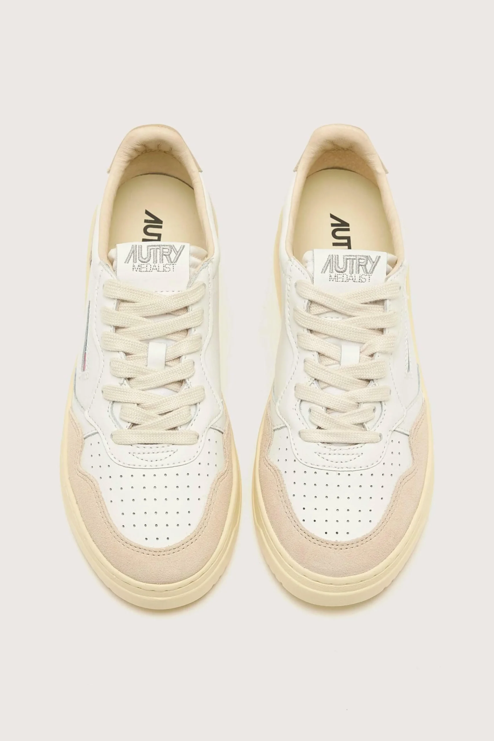 Les sneakers Autry Medalist Low présentent une tige en cuir blanc souple, des empiècements en suède doux et un bout perforé.