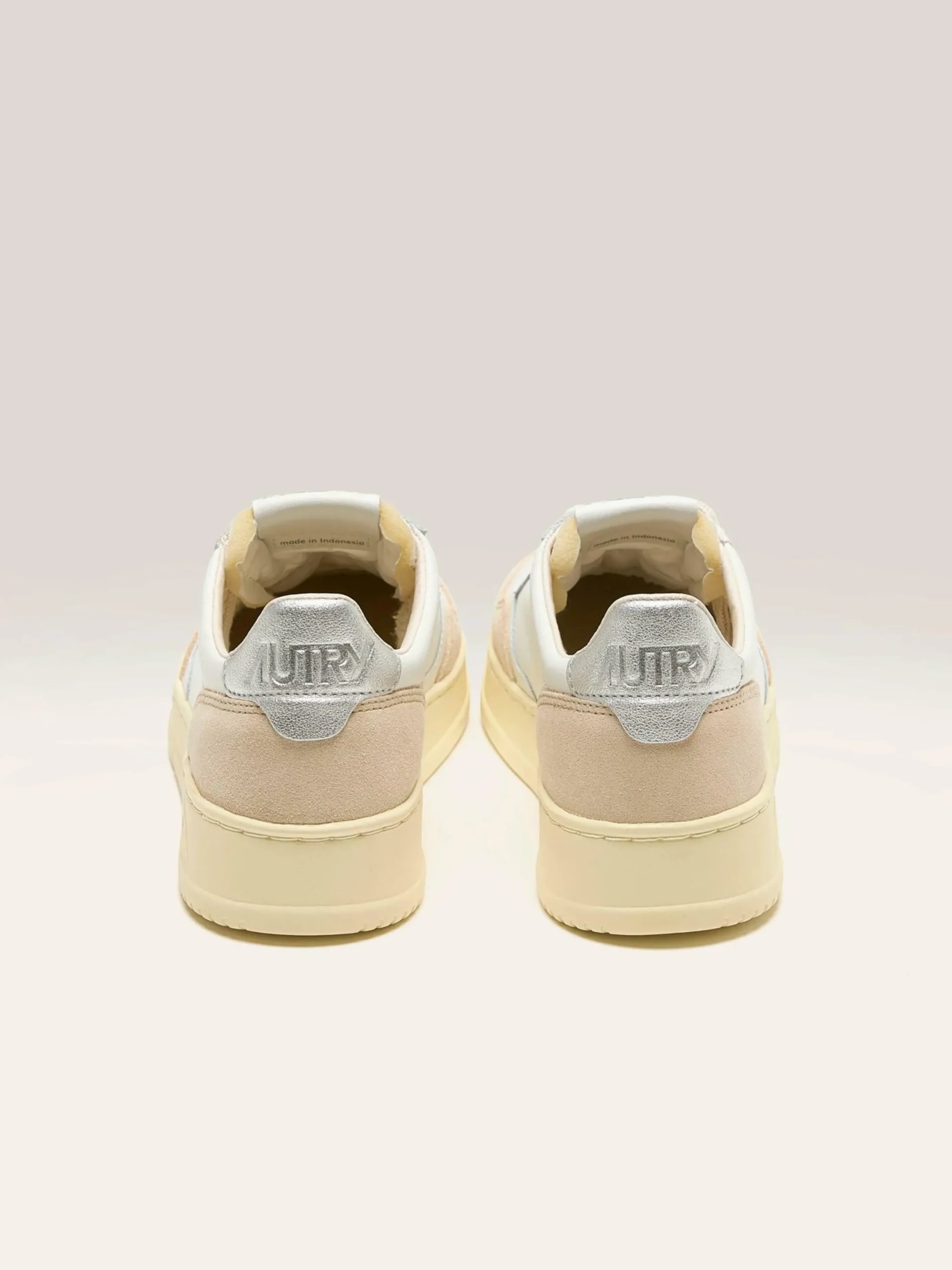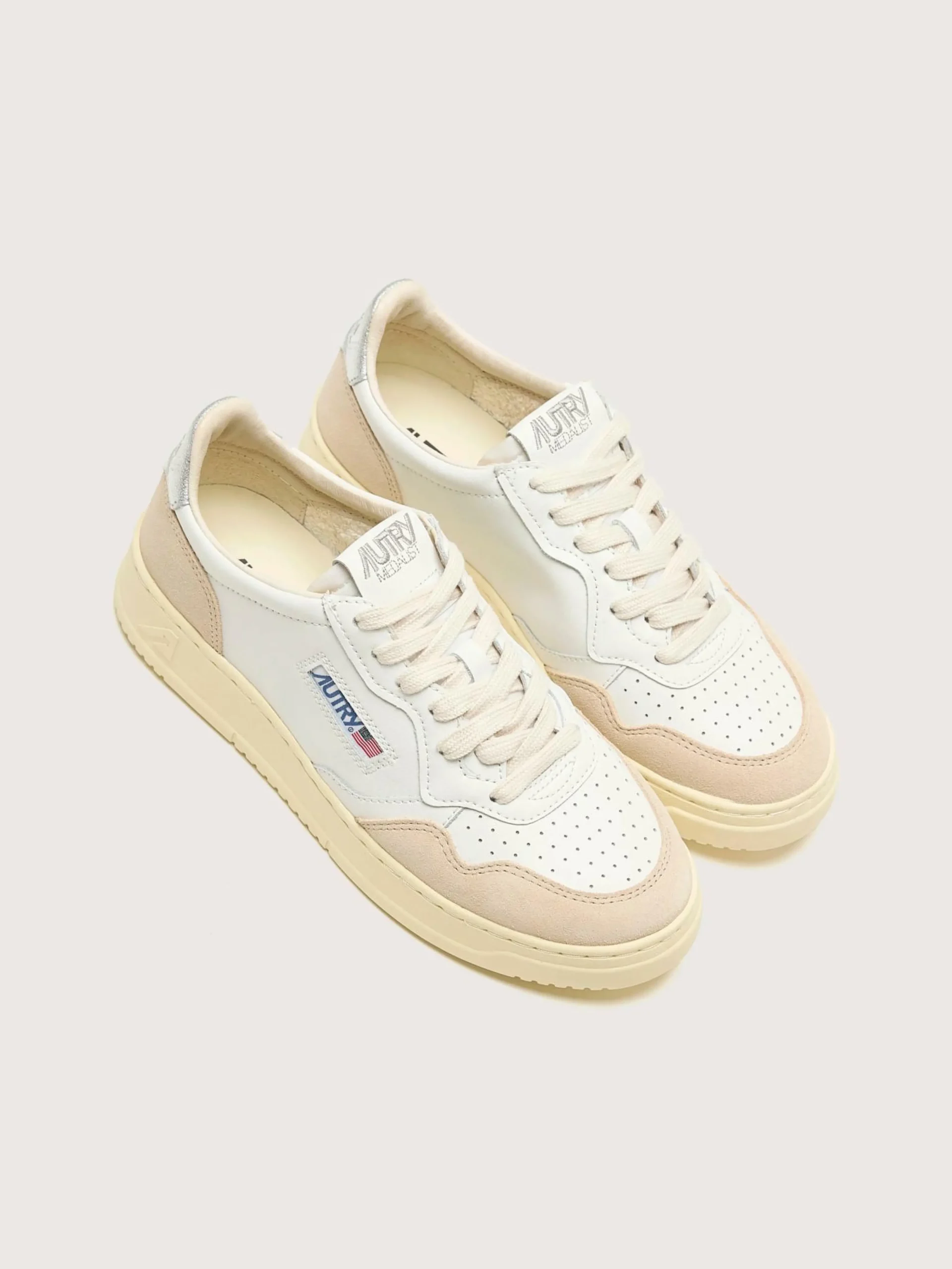Les sneakers Autry Medalist Low présentent une tige en cuir blanc souple avec des empiècements en suède, un bout perforé et une languette de talon en cuir argenté.