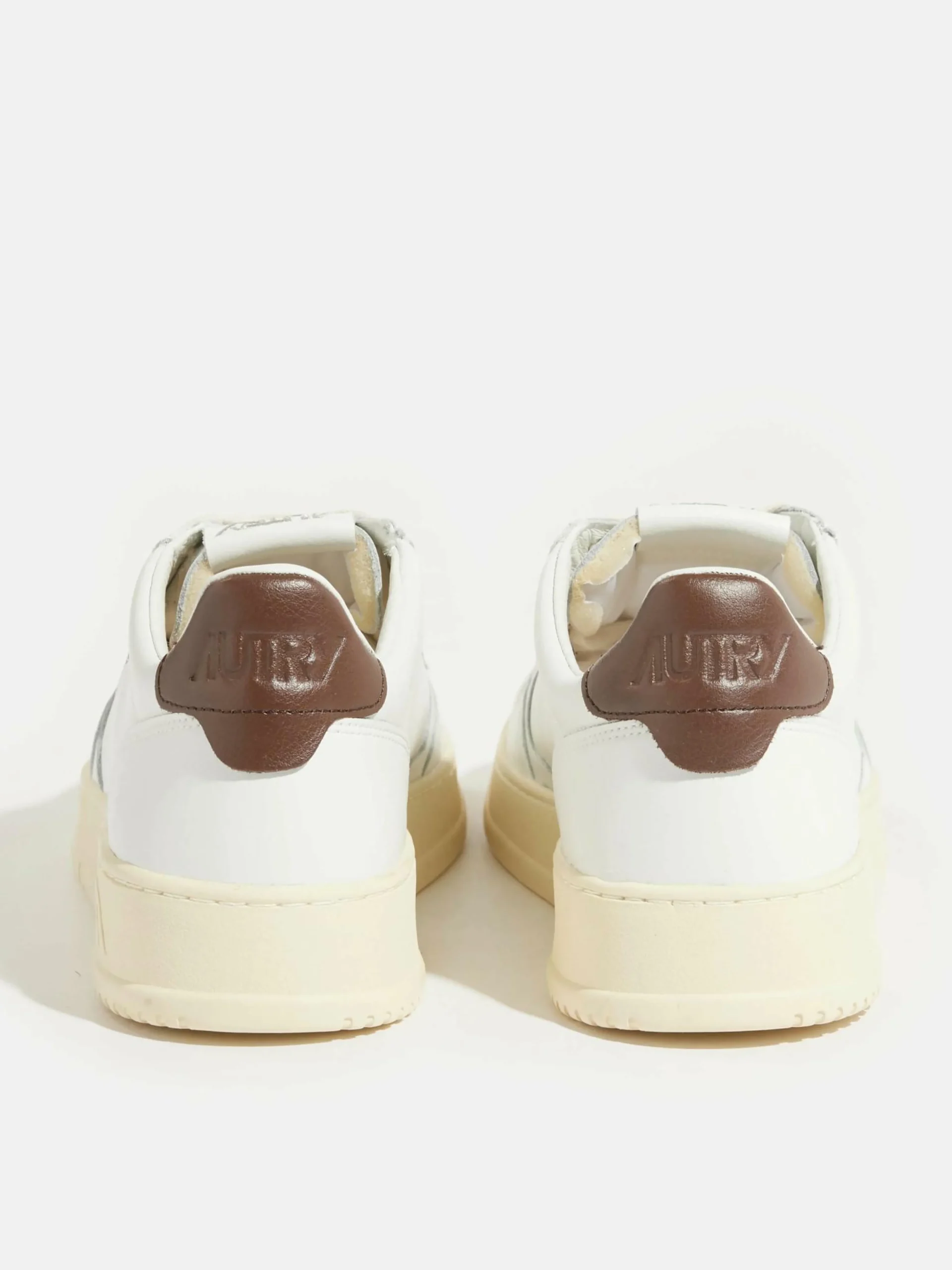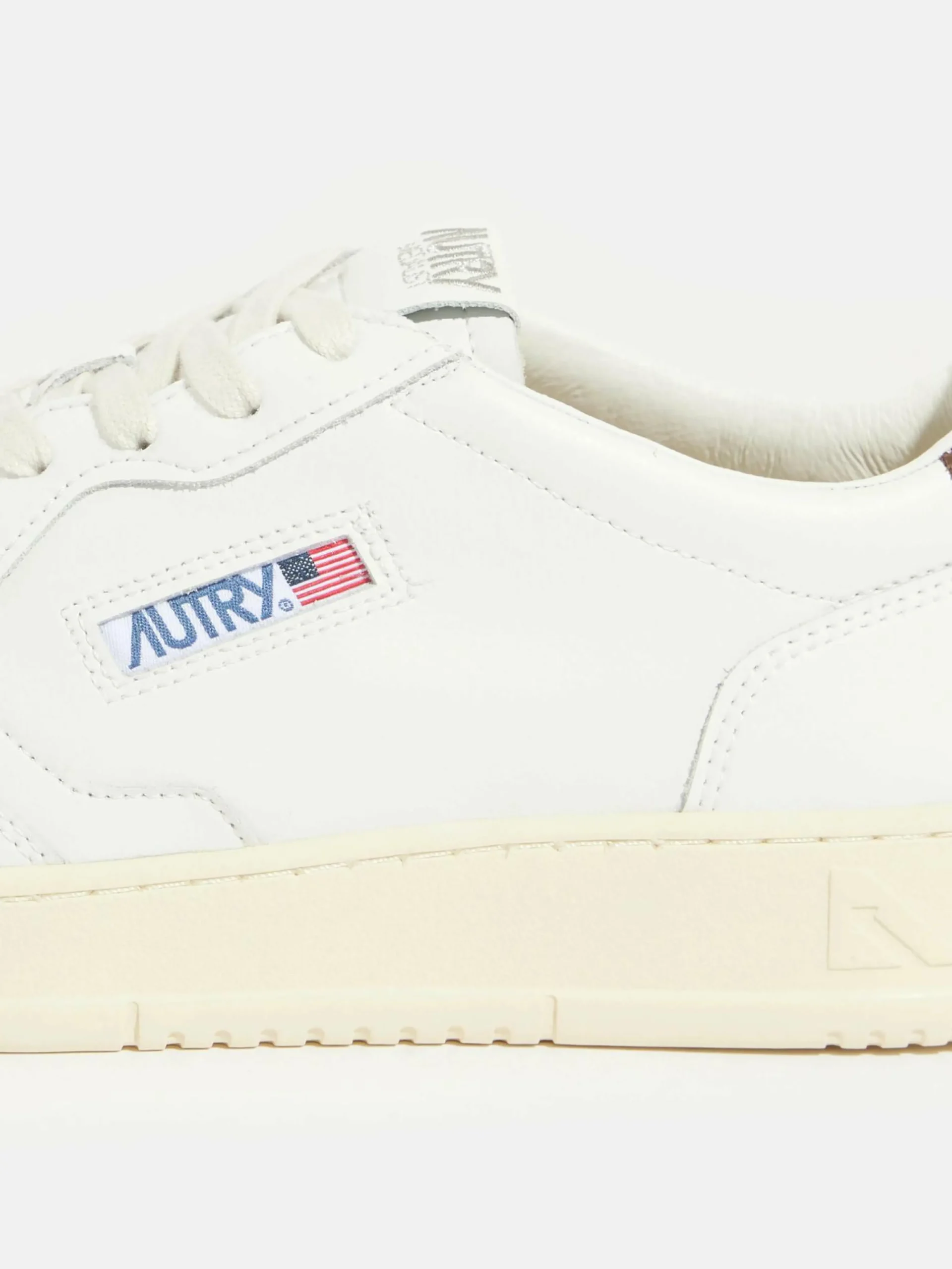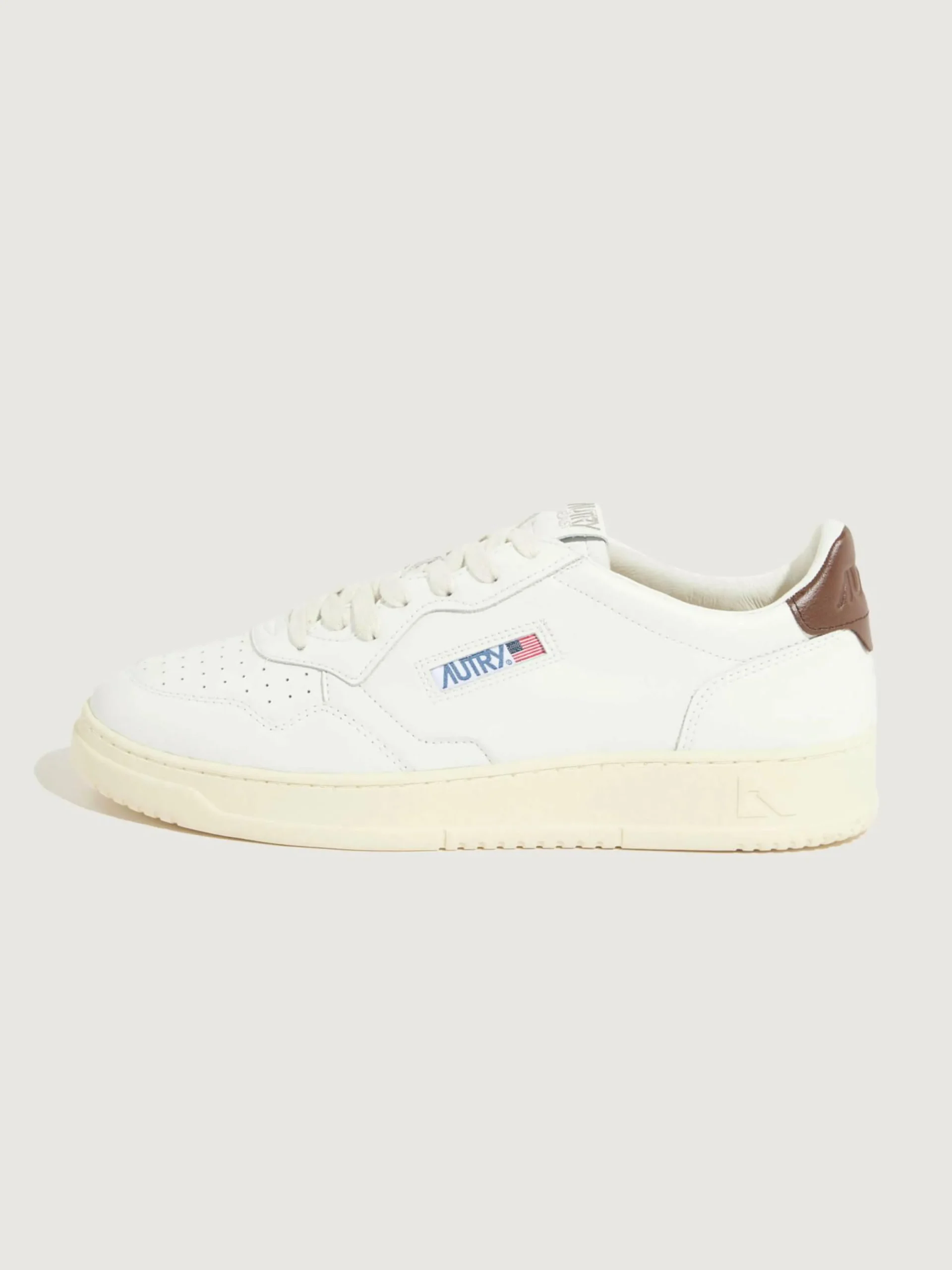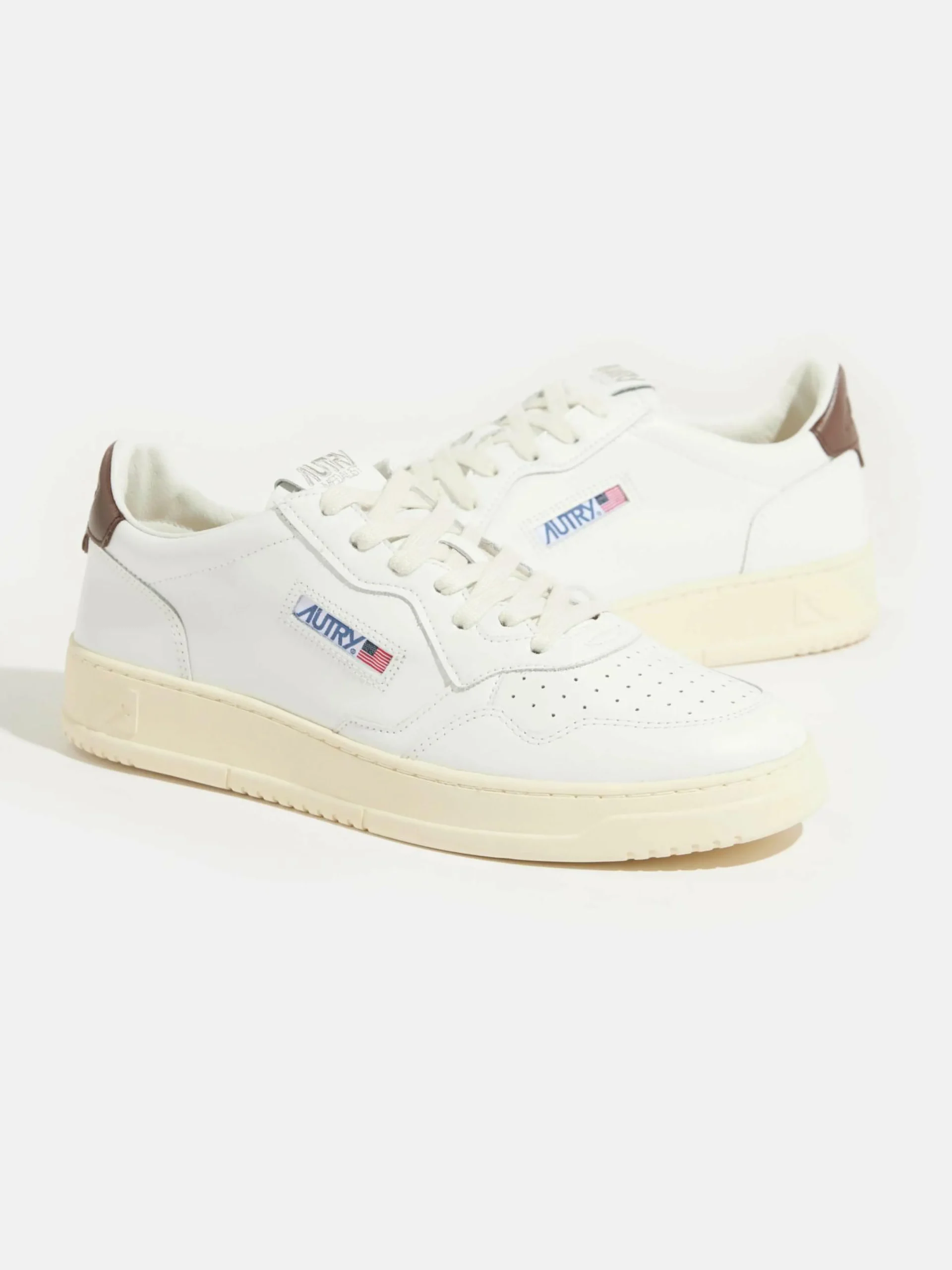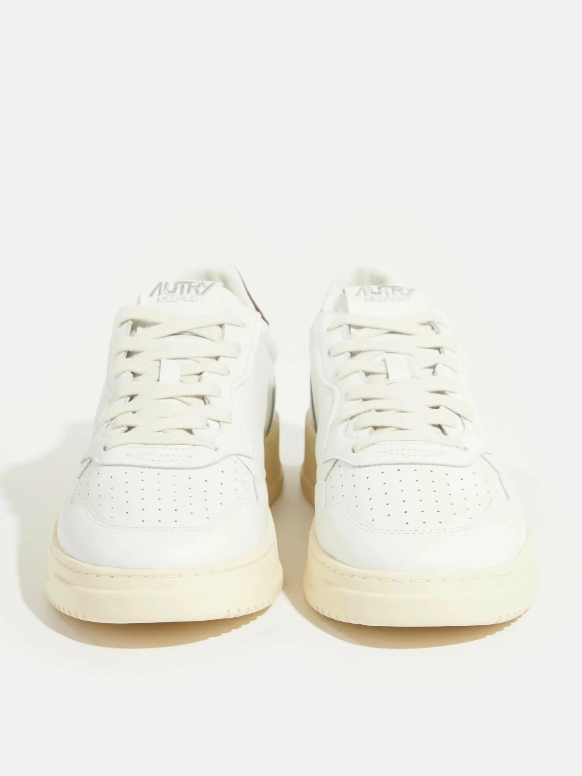 Les sneakers Autry Medalist Low possèdent une tige en cuir blanc naturel et souple, un bout perforé et une languette de talon en cuir marron.