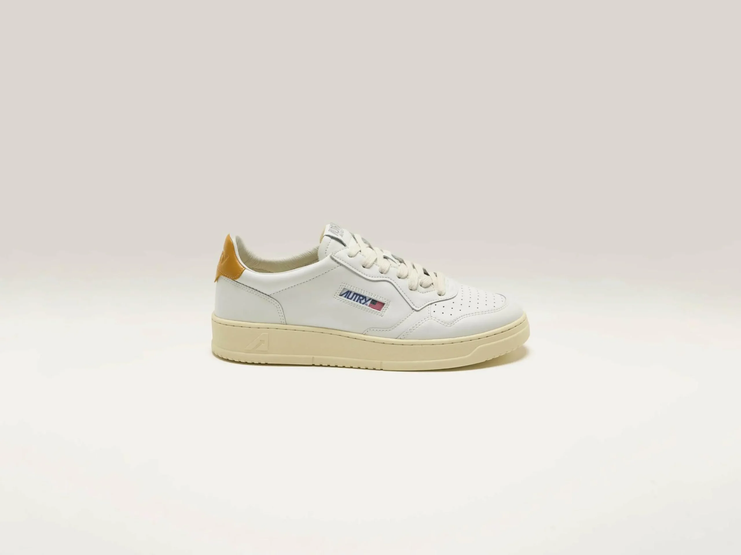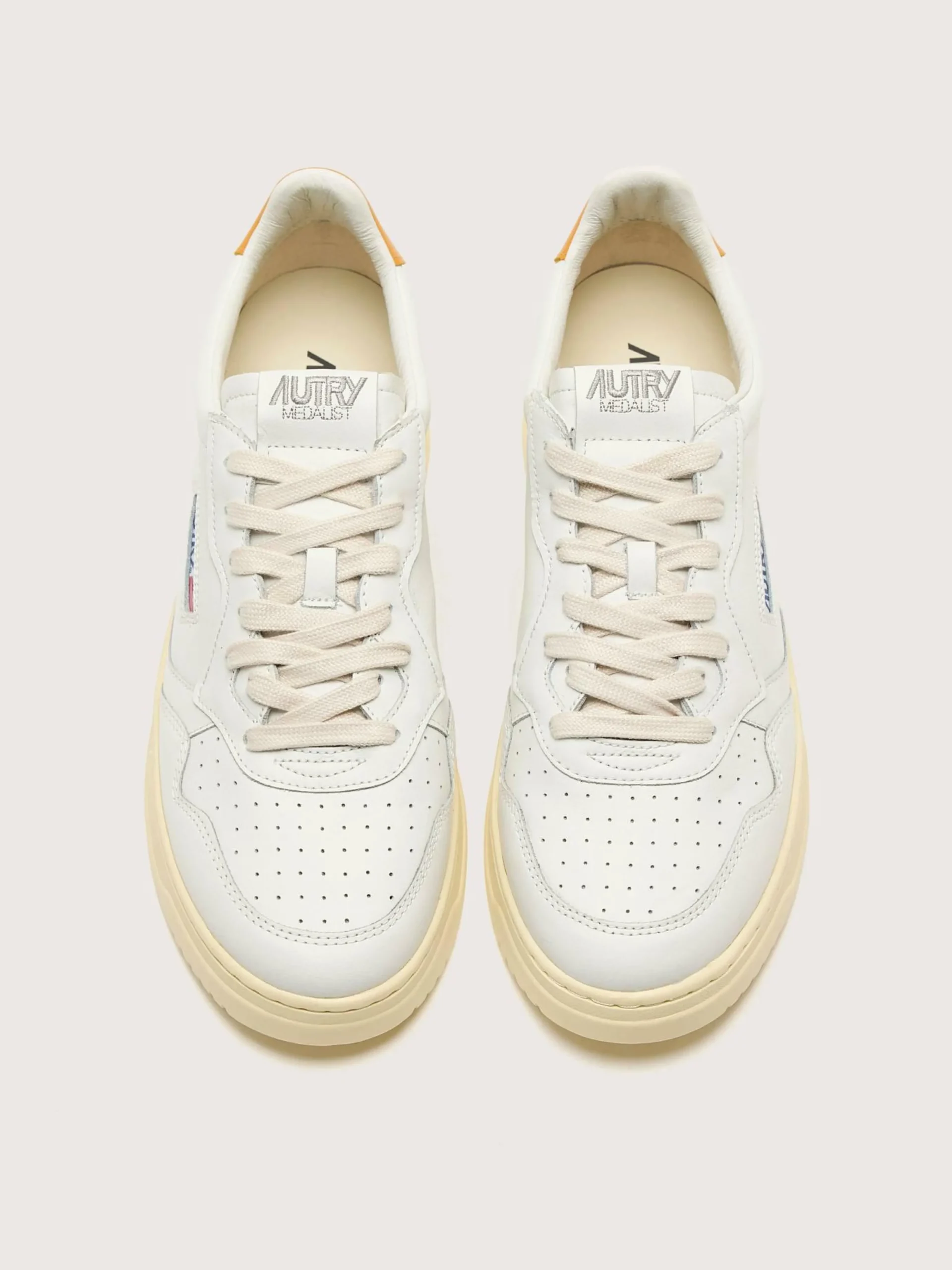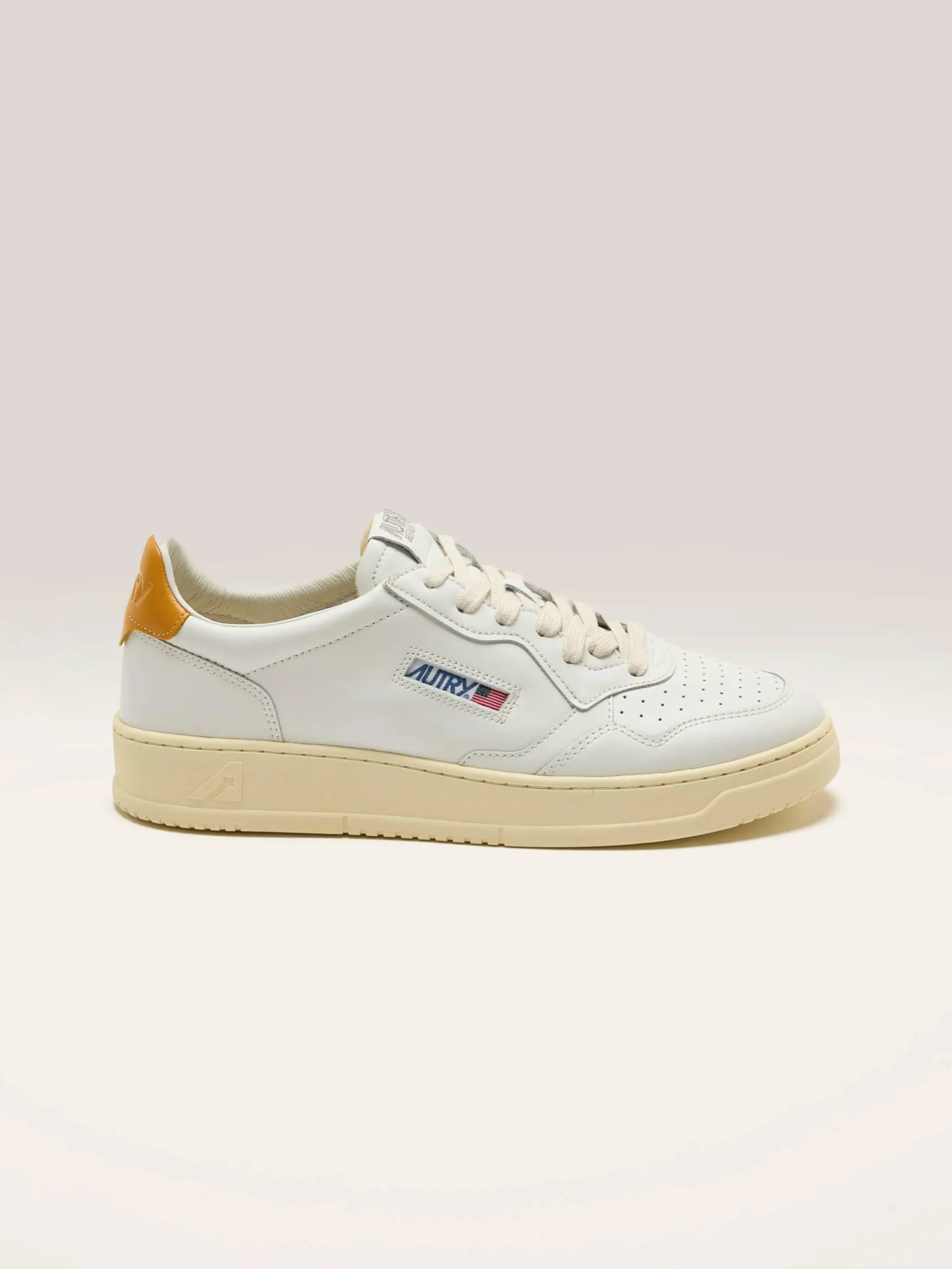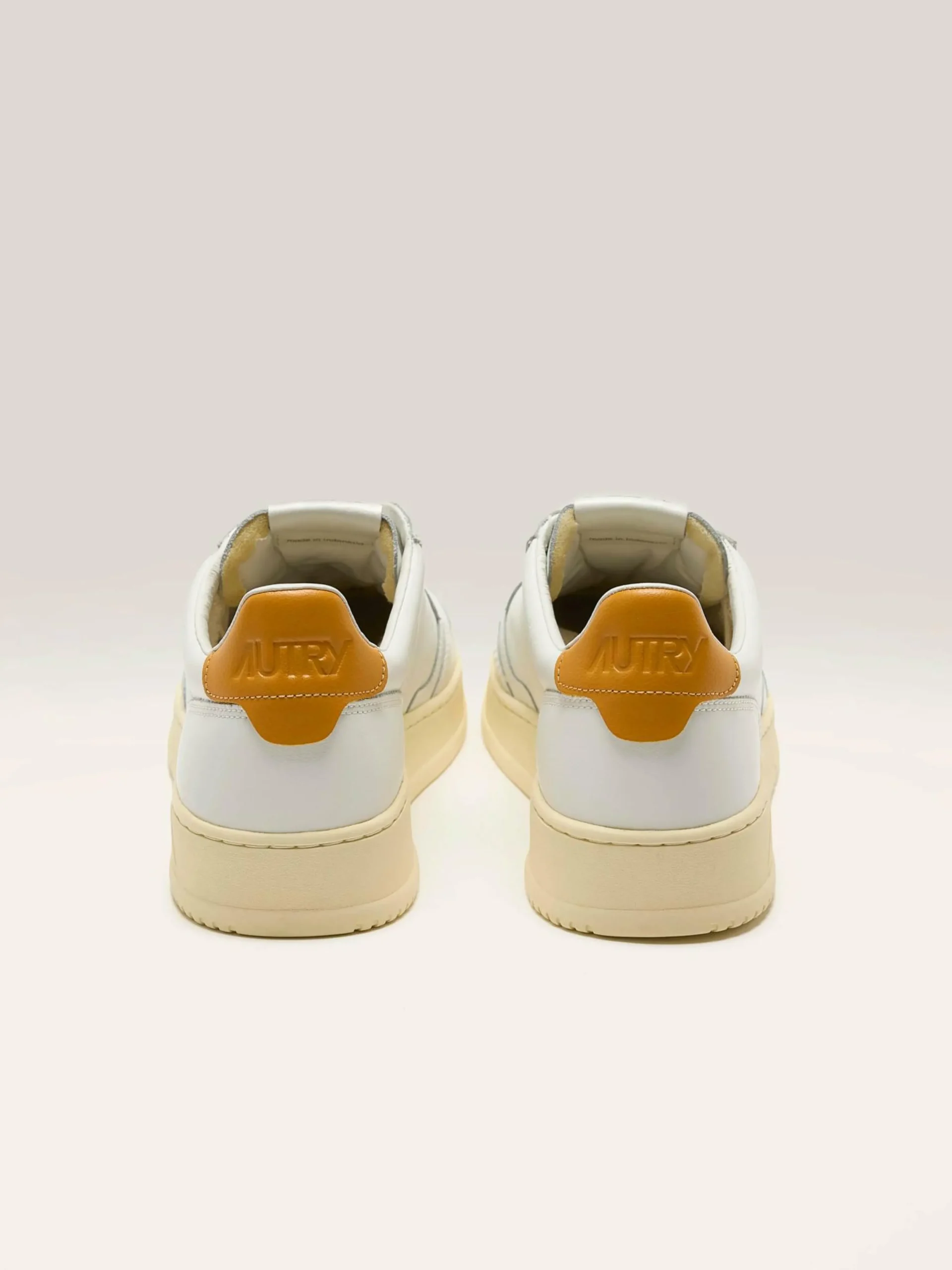 Les sneakers Autry Medalist Low présentent une silhouette sportive en cuir blanc avec une languette de talon en cuir couleur miel, créant un contraste dynamique.