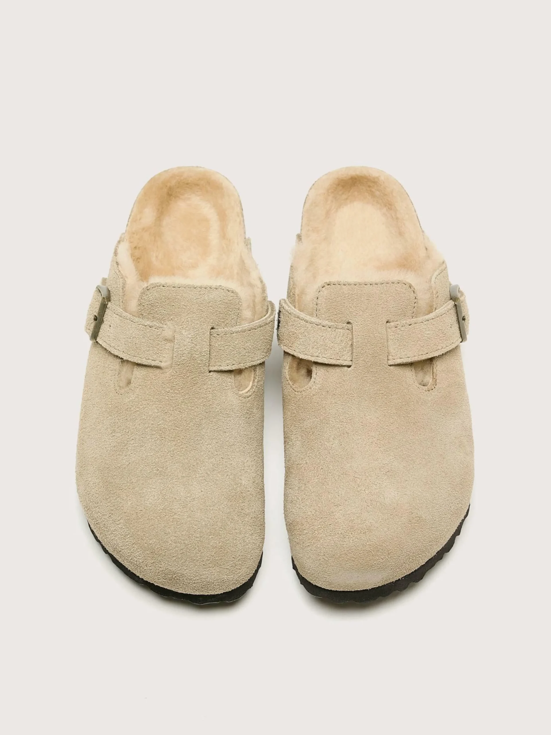 Les sabots fourrés Birkenstock Boston Shearling présentent un dessus en suède de qualité supérieure doublée de fourrure et une semelle doublée également de fourrure.