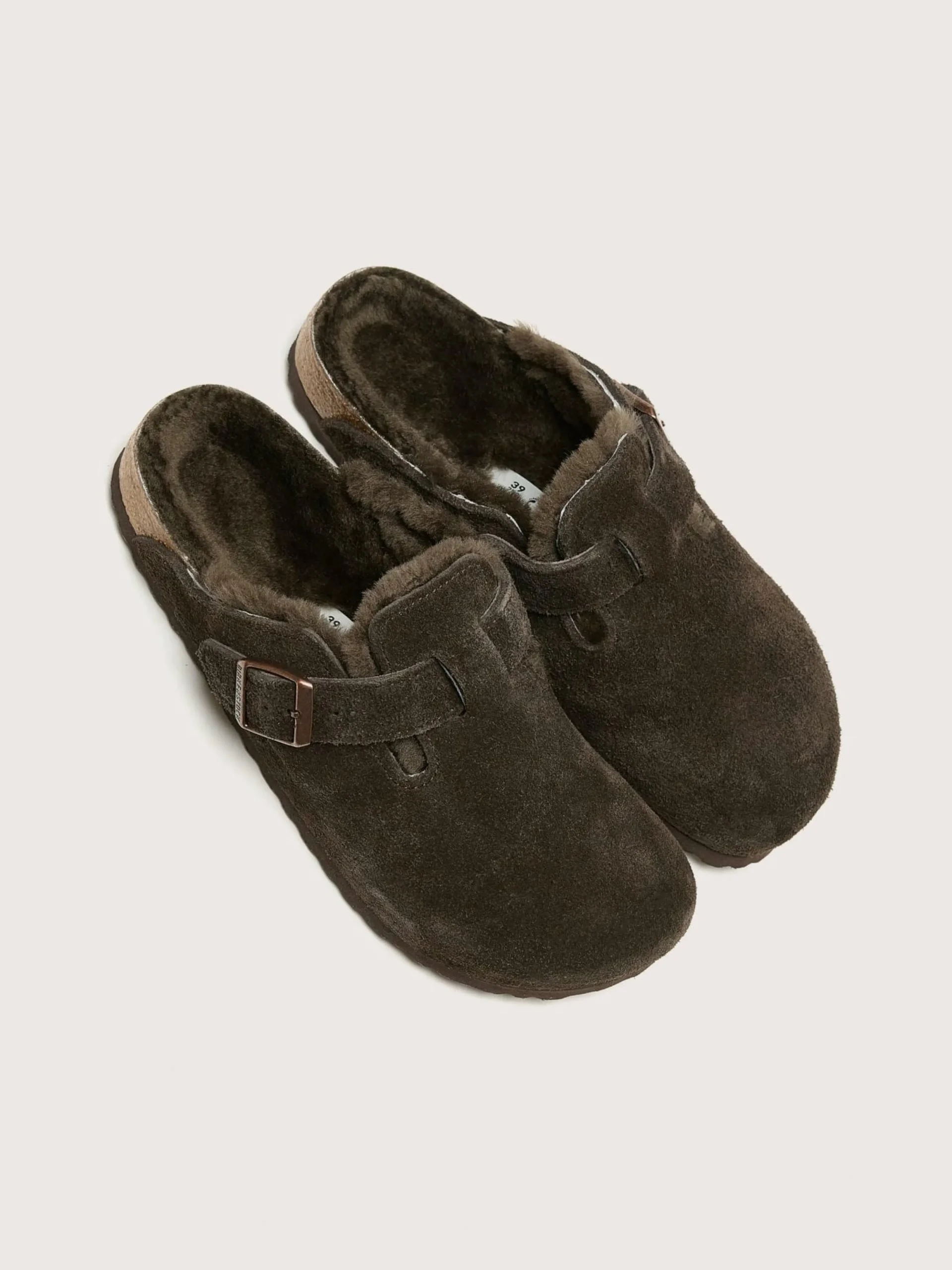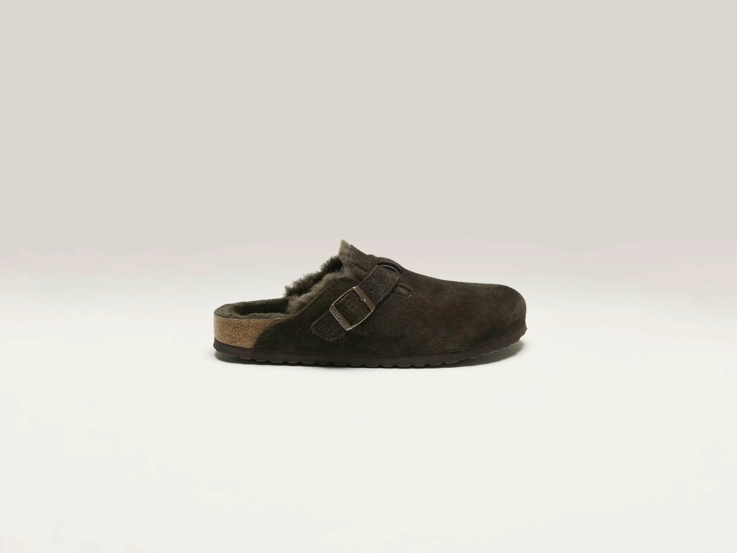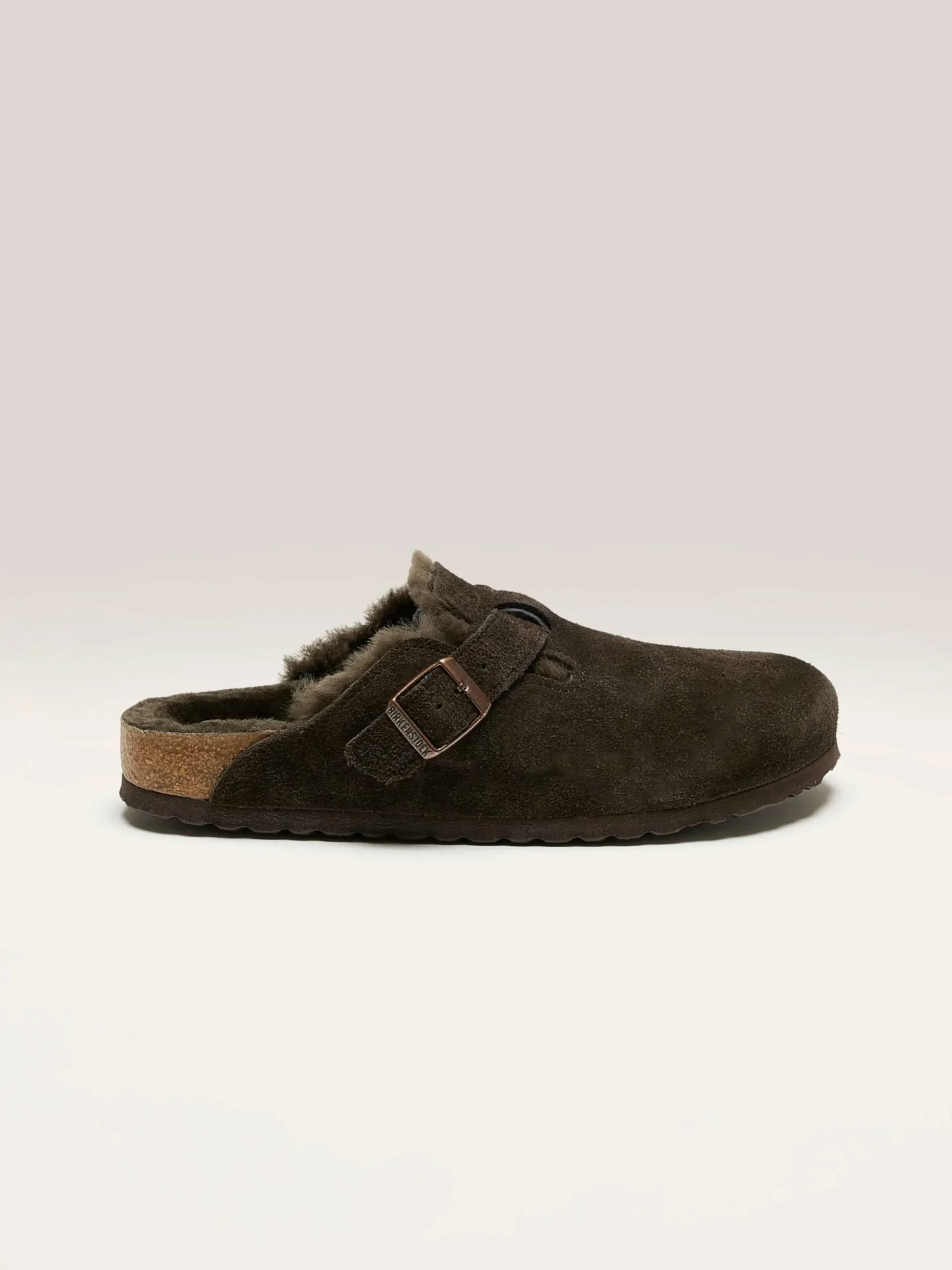 Les sabots fourrés Birkenstock Boston Shearling présentent un dessus en suède de qualité supérieure doublée de fourrure et une semelle doublée également de fourrure.