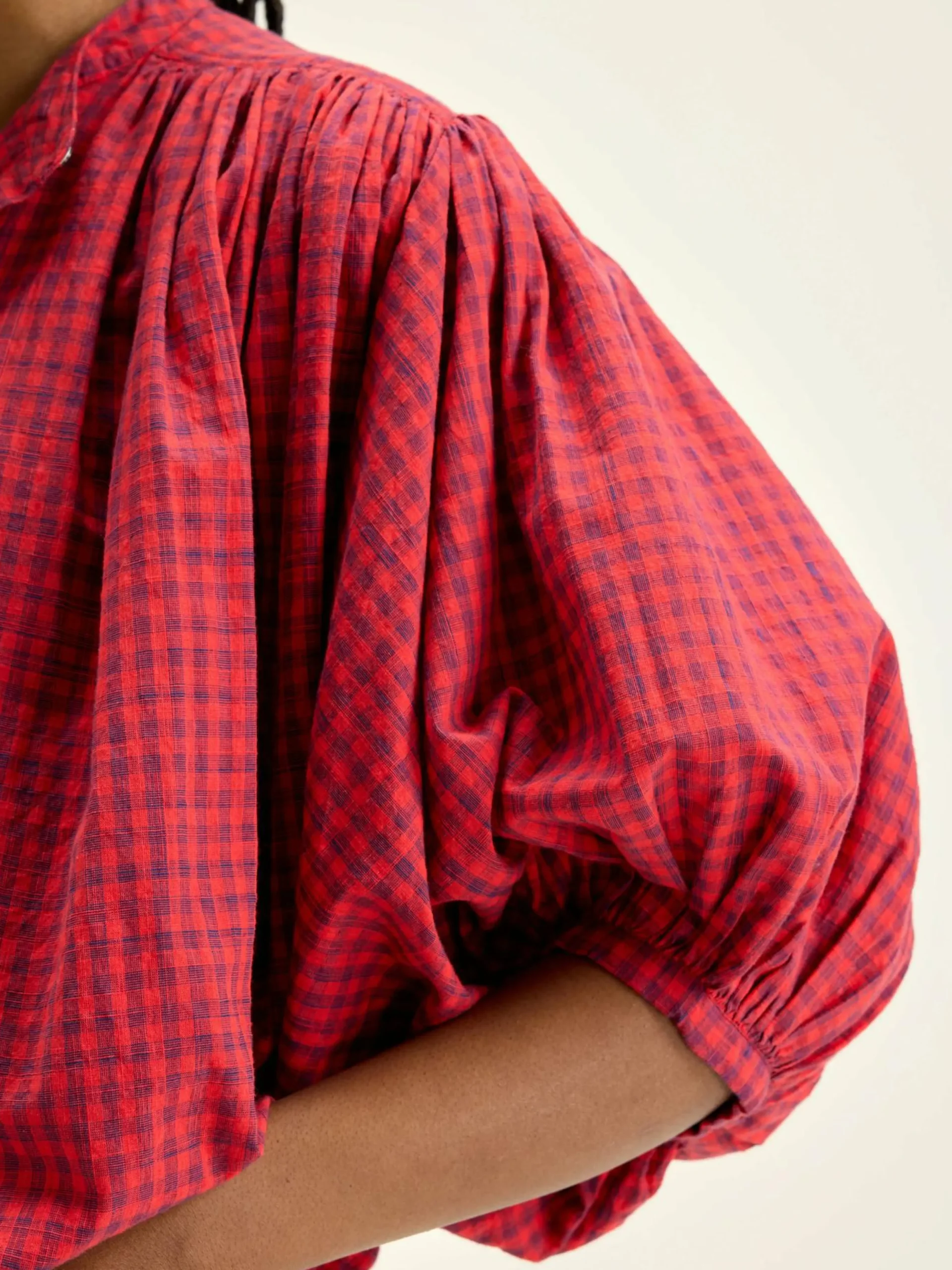 Blouse oversize avec détails froncé en coton vichy rouge et bleu texturé.