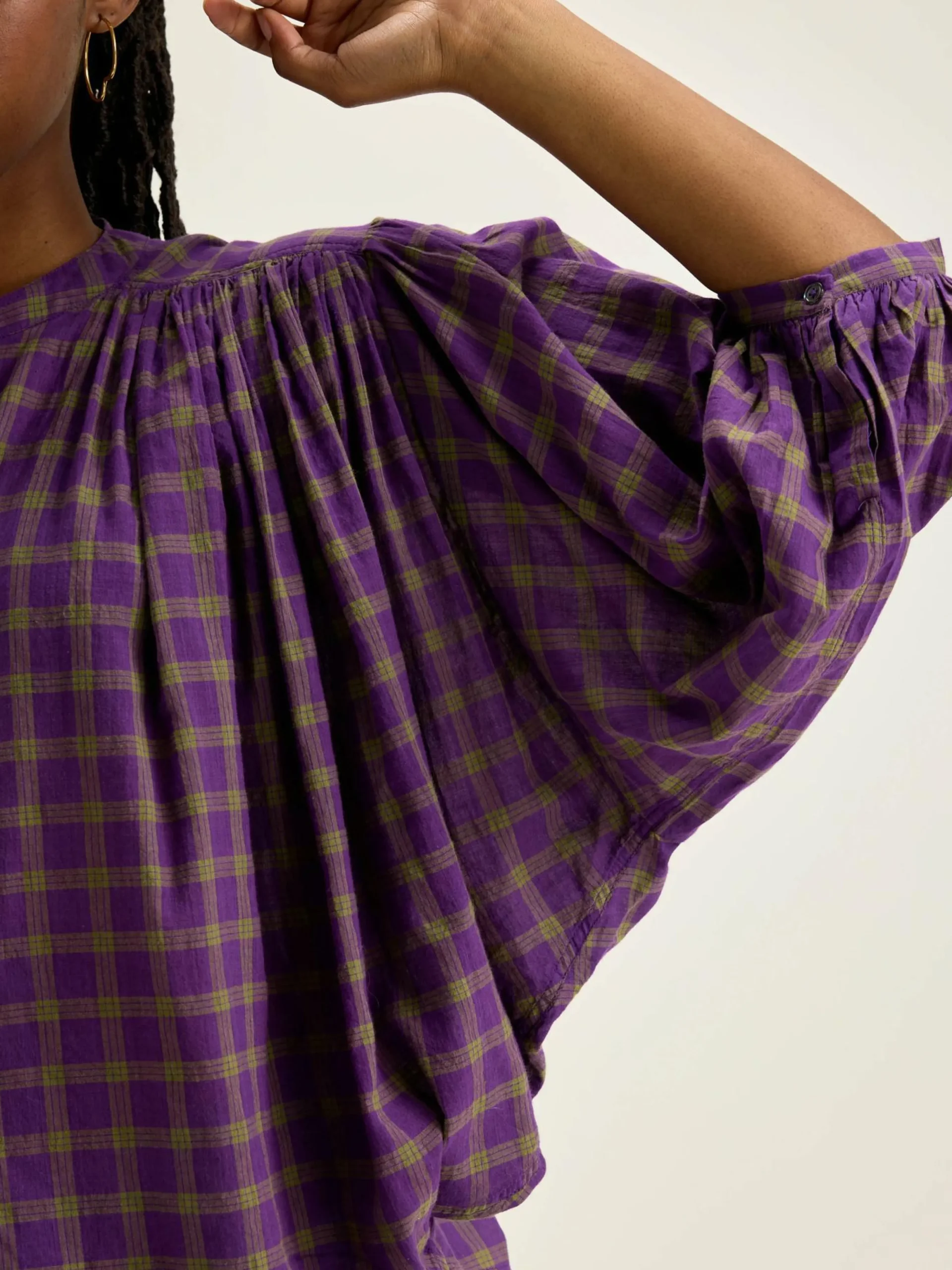 Blouse oversize avec détails froncé en coton à carreaux violets.