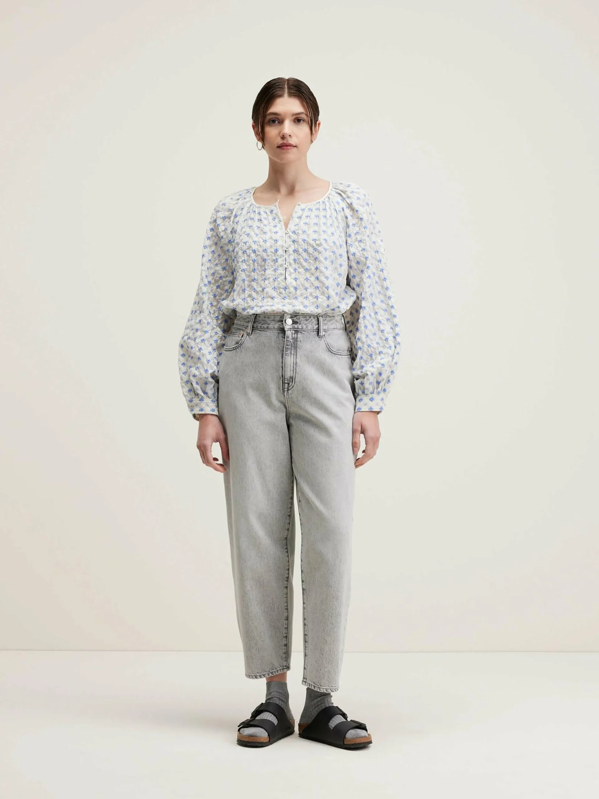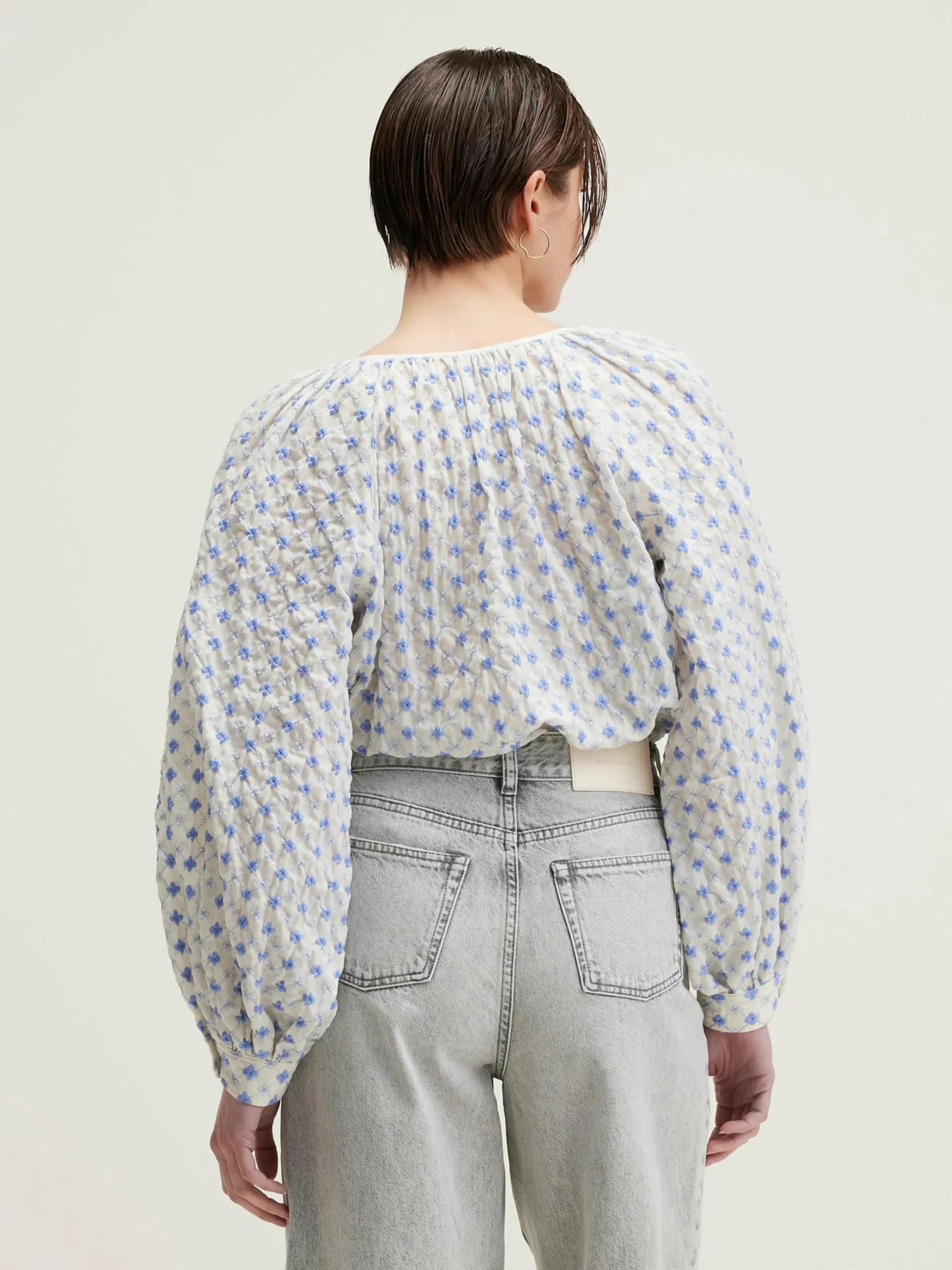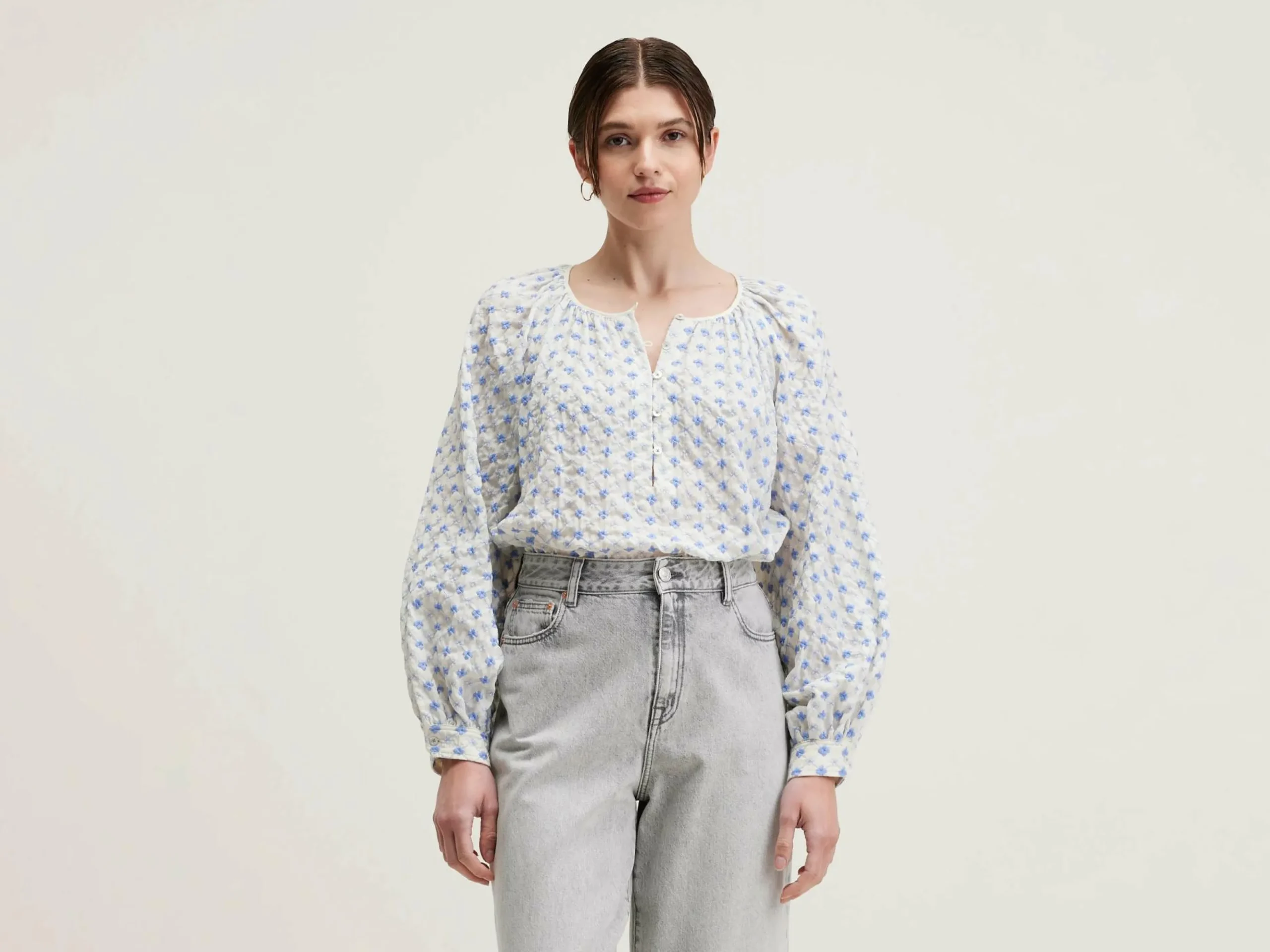 Blouse romantique, volume ample, encolure gansée et boutonnée, entiêrement brodée de fleurs bleues.