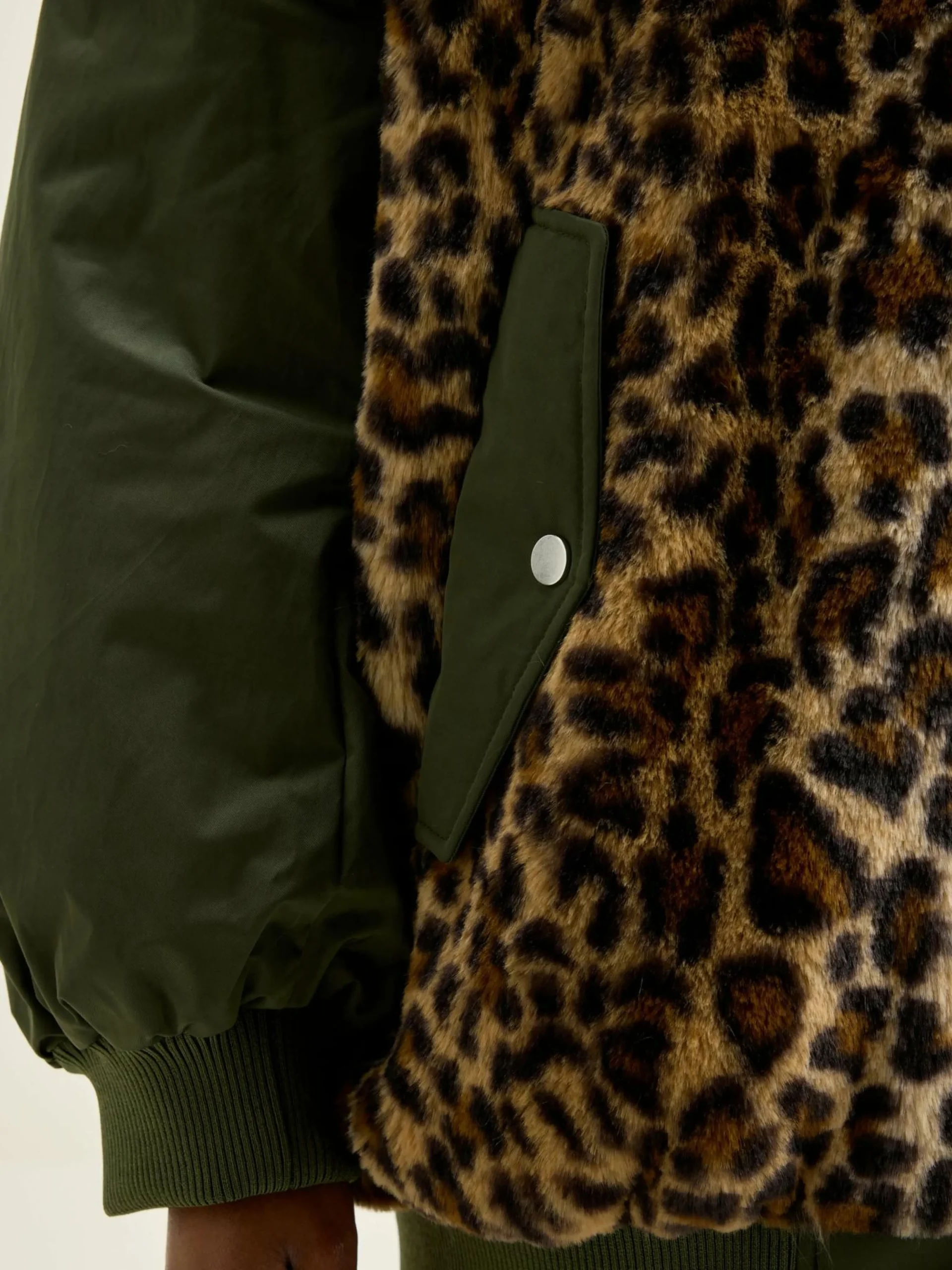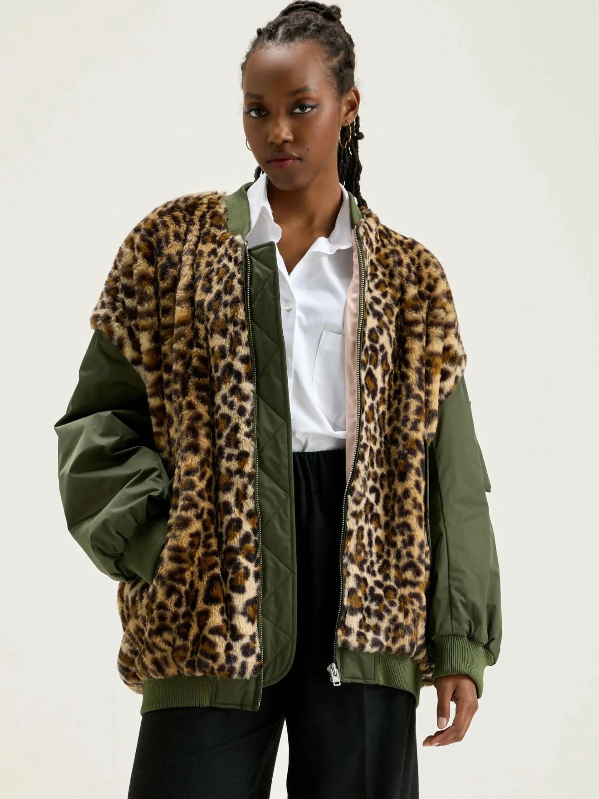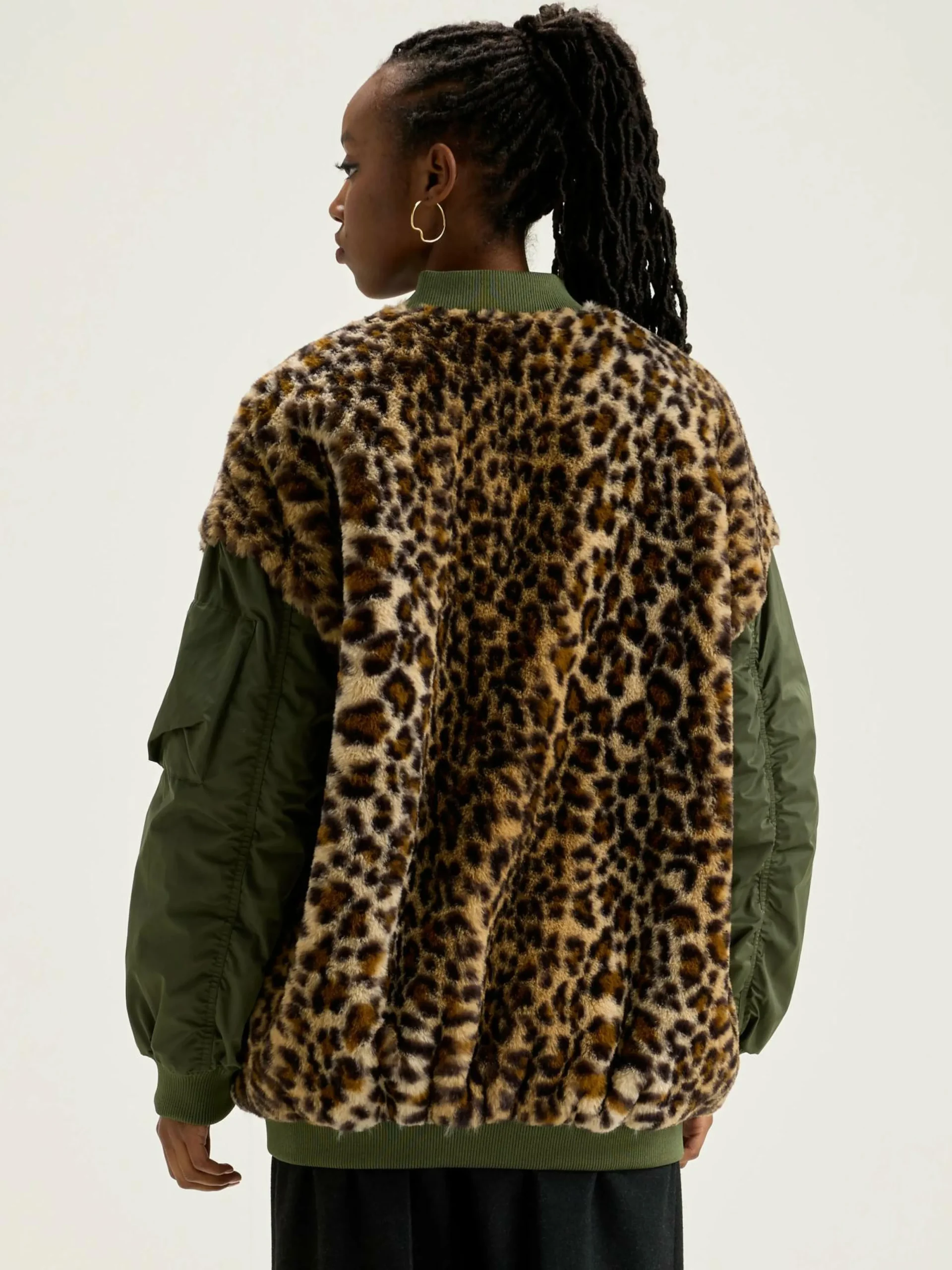 Bomber oversize en fausse fourrure imprimé léopard sur le devant et le dos et manches en toile kaki satinée.