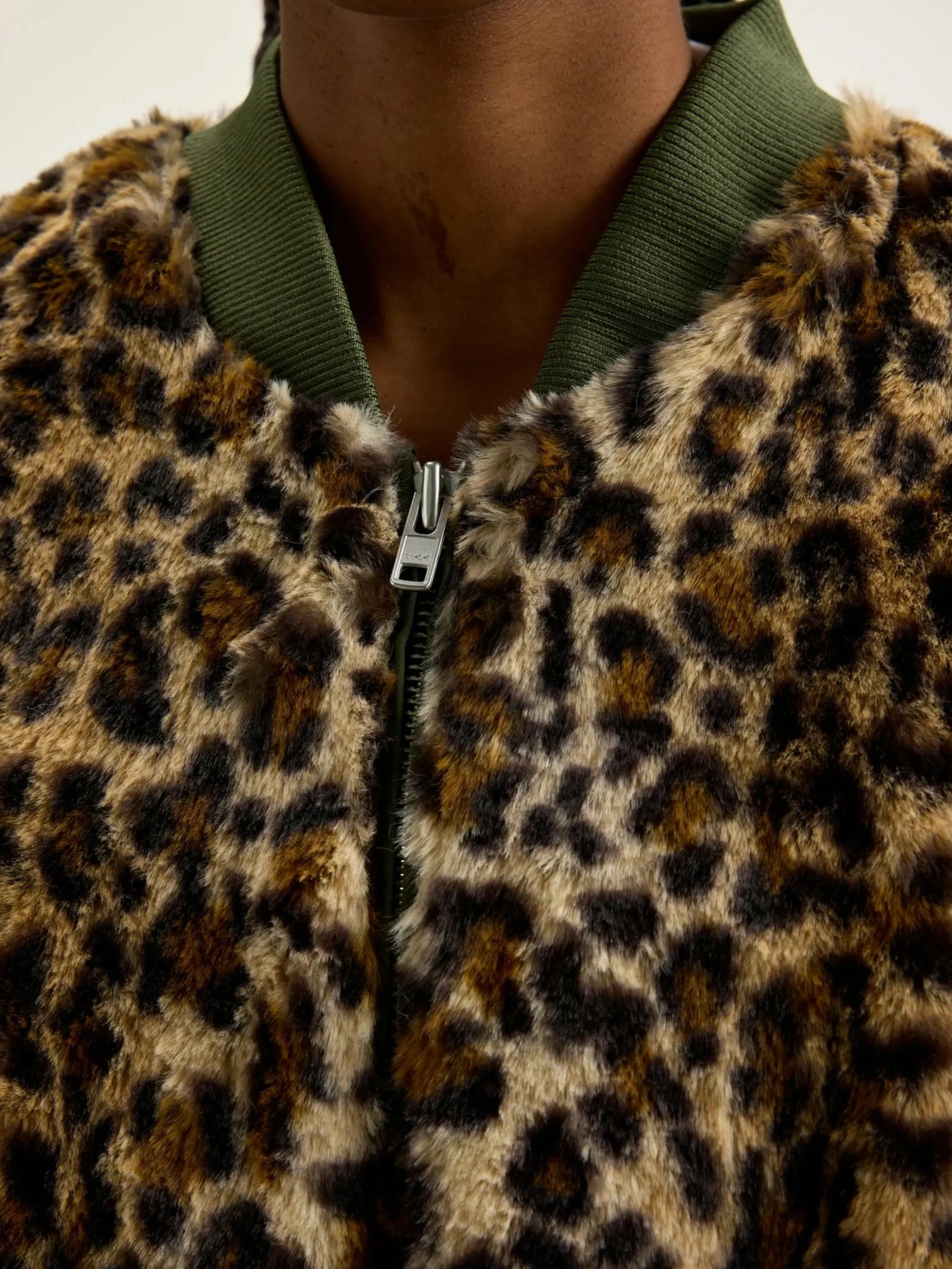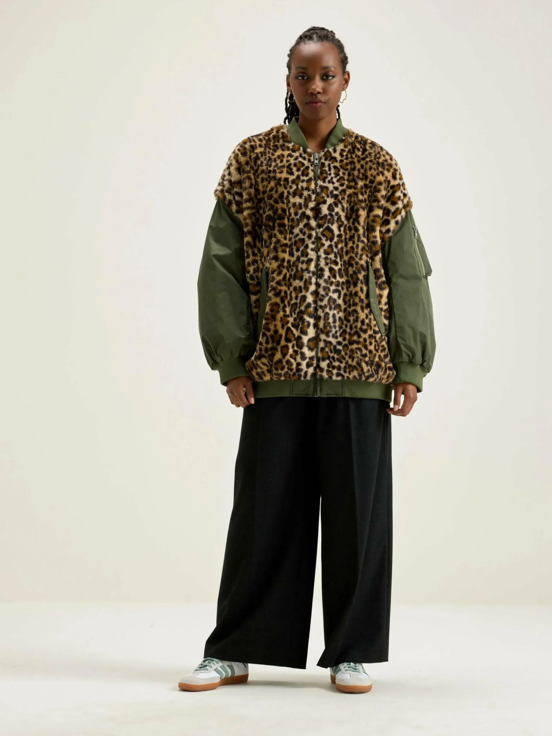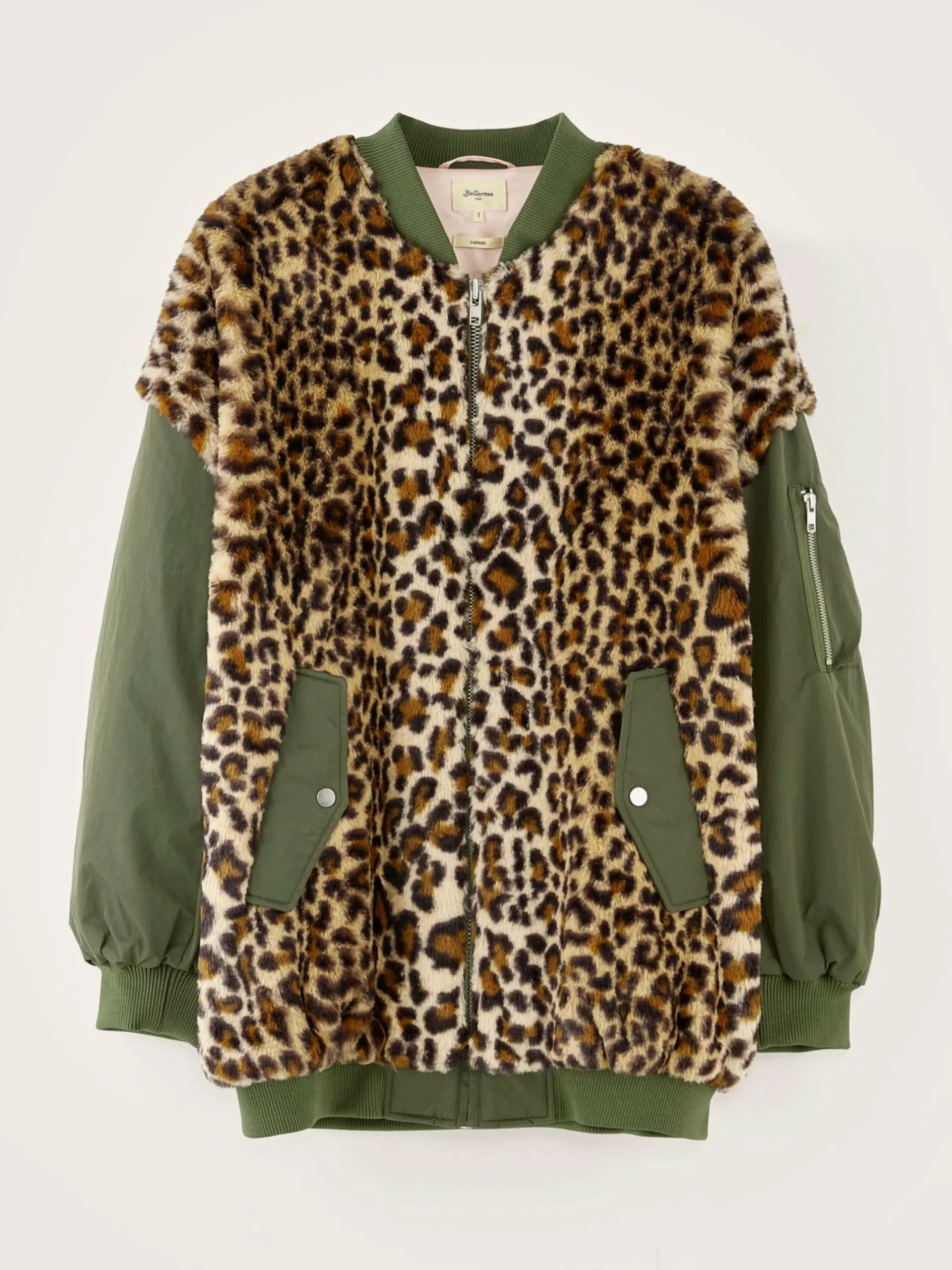 Bomber oversize en fausse fourrure imprimé léopard sur le devant et le dos et manches en toile kaki satinée.