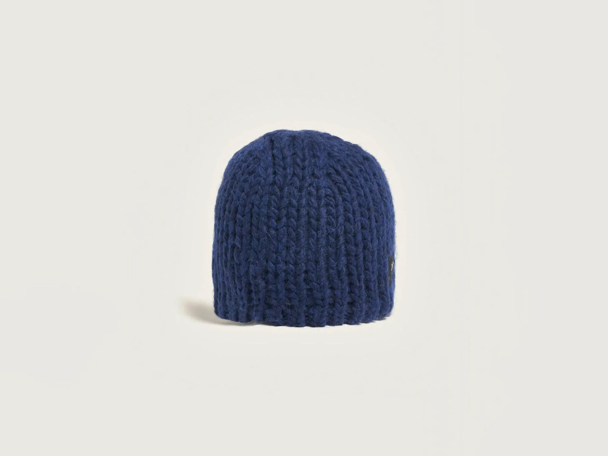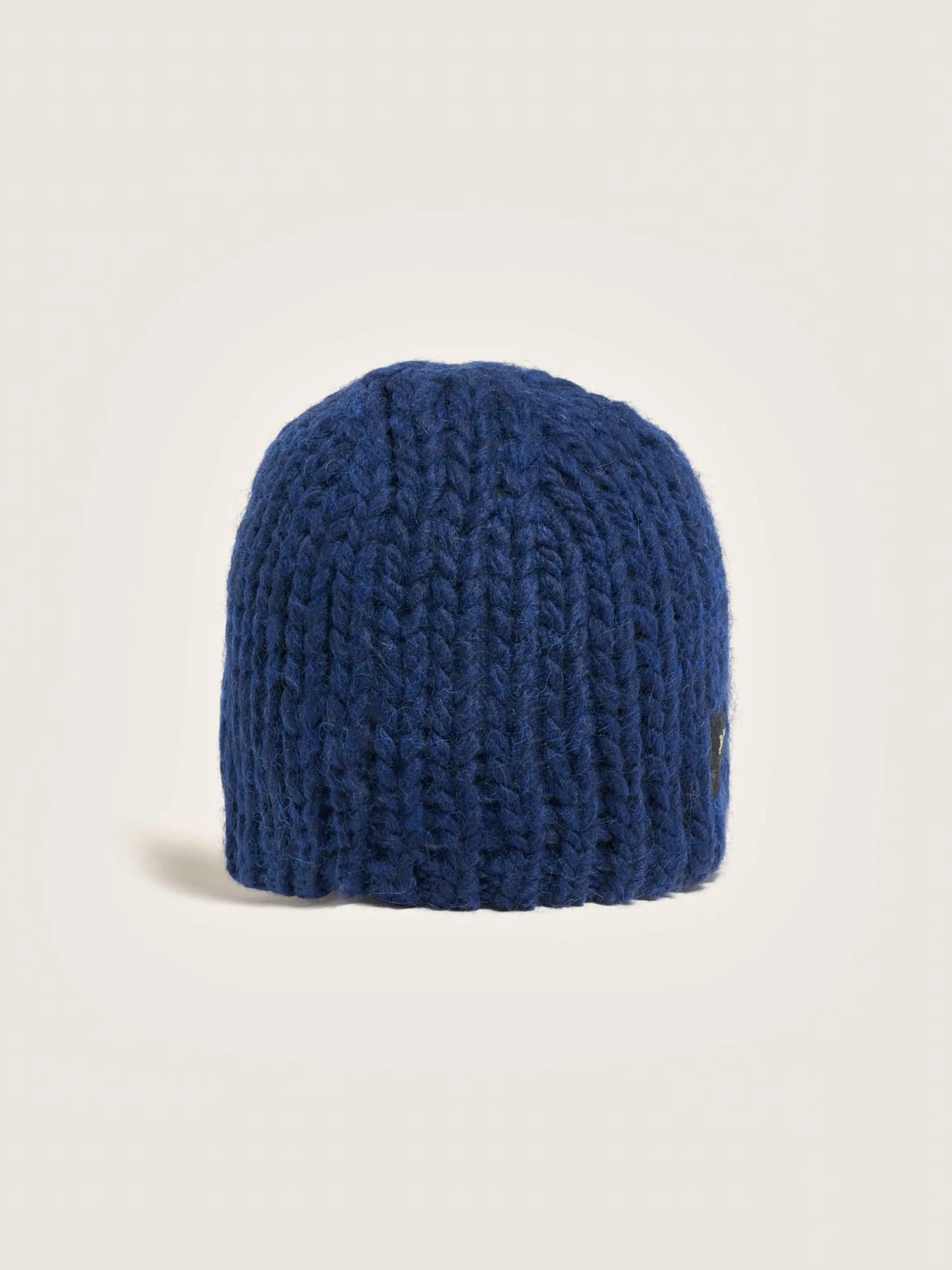 Bonnet tricoté en fil épais bleu cobalt, avec étiquette Bellerose sur l’avant.