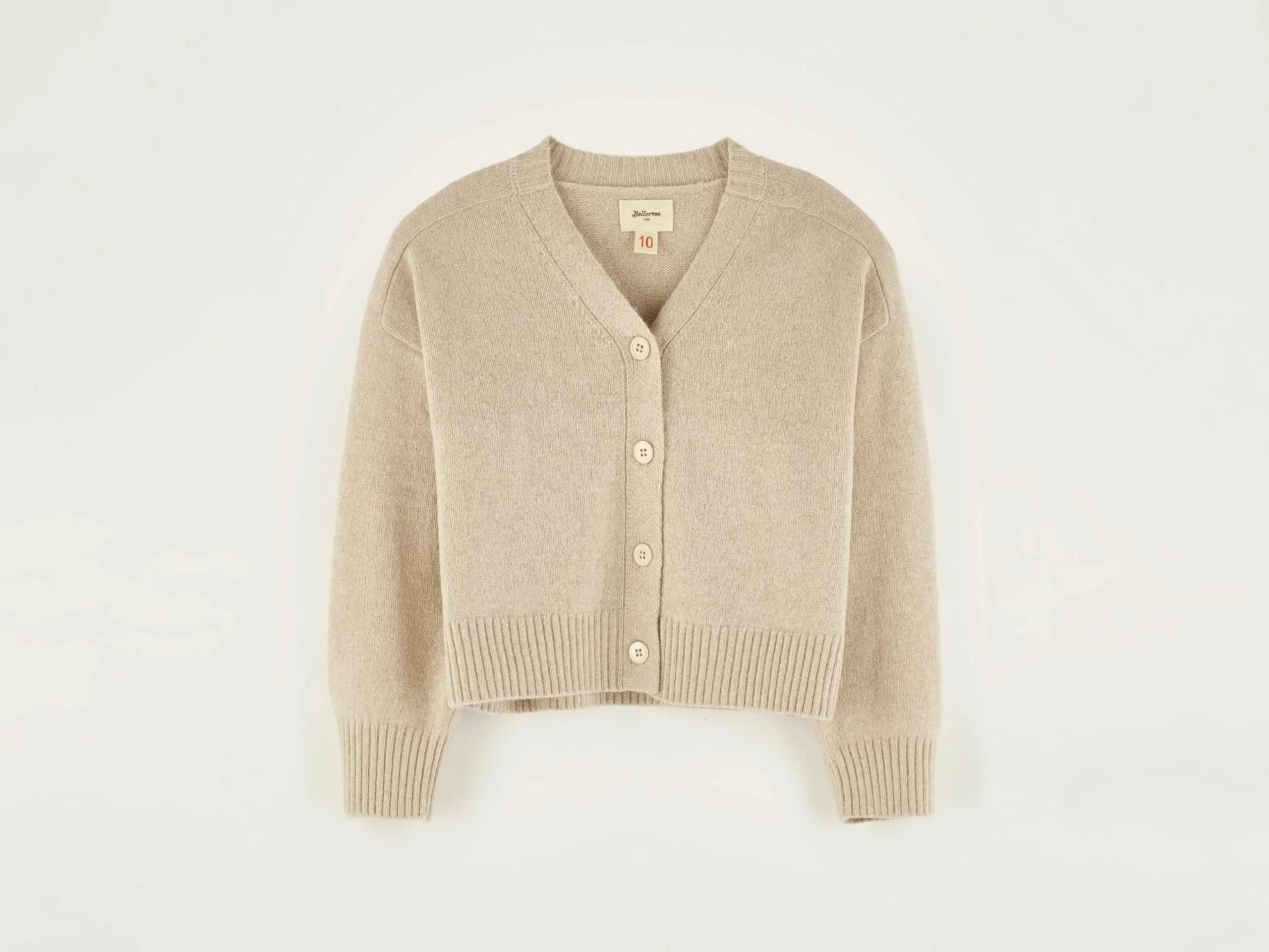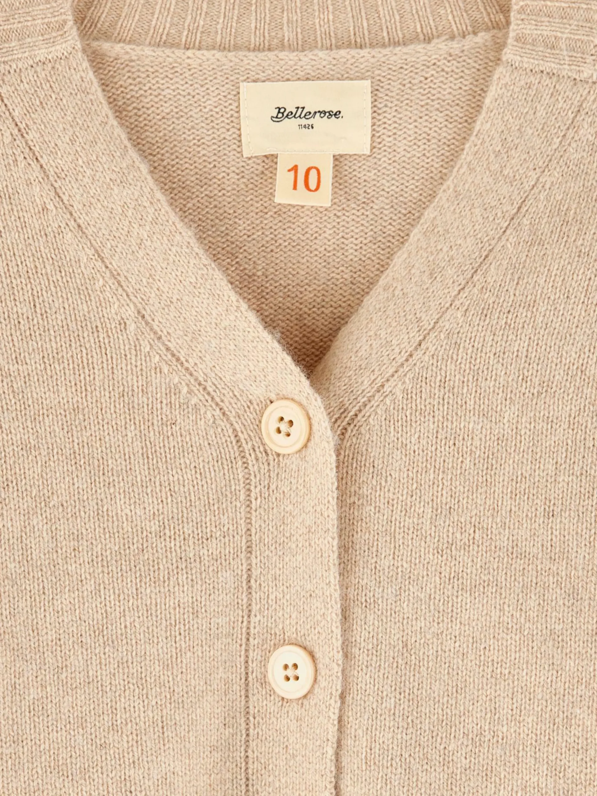 Gilet oversize beige à col V en laine mérinos superfine mélangée.