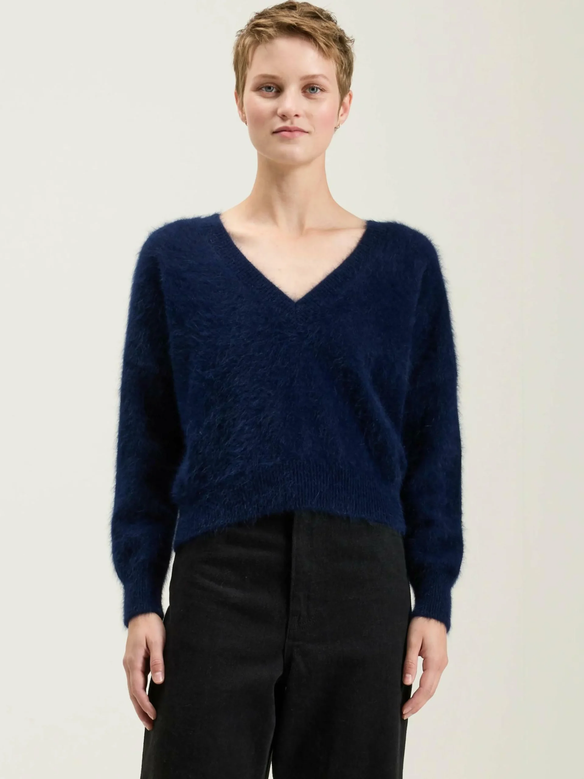 Pull bleu marine en angora mélangé, col en V et réversible.