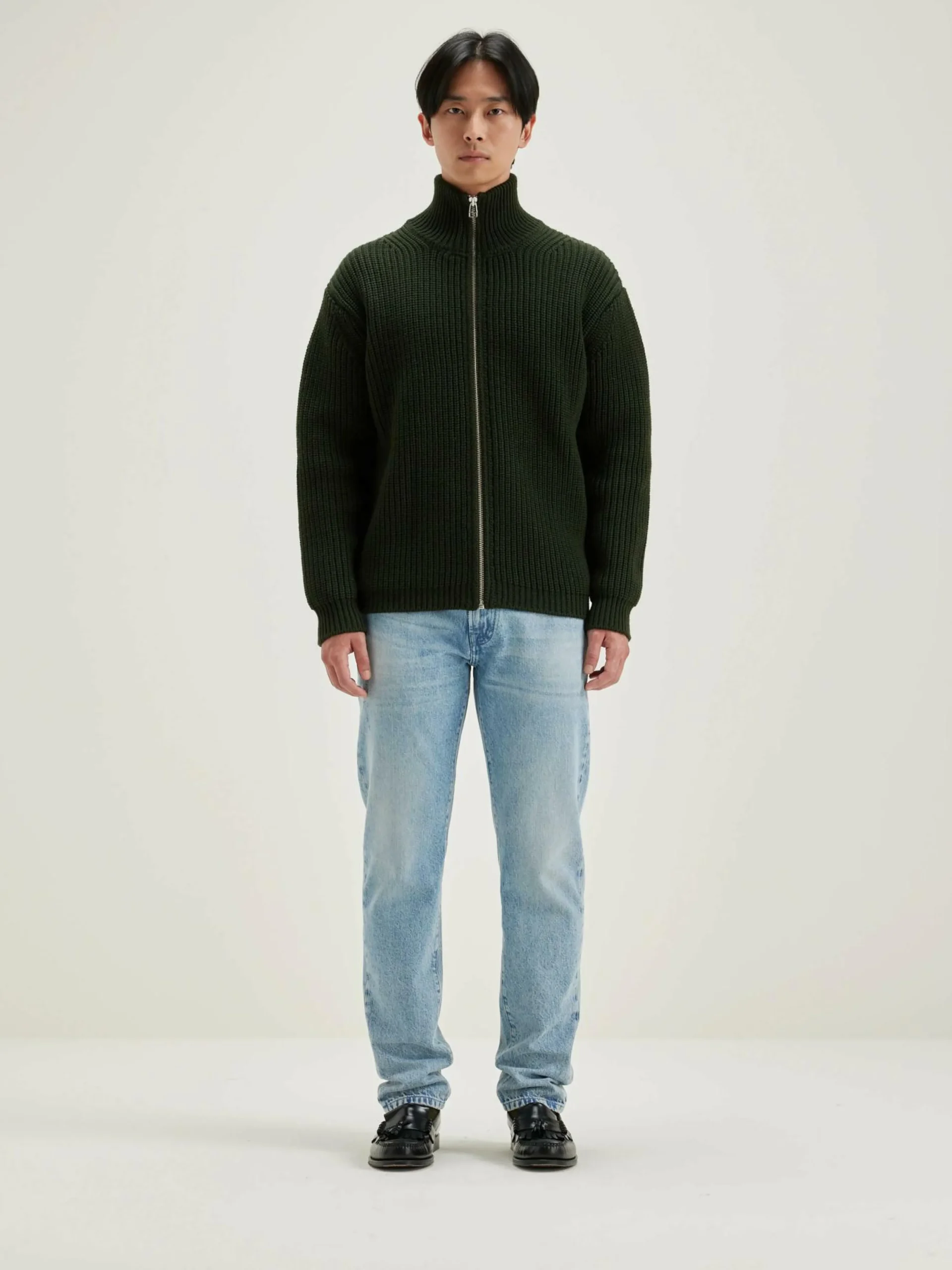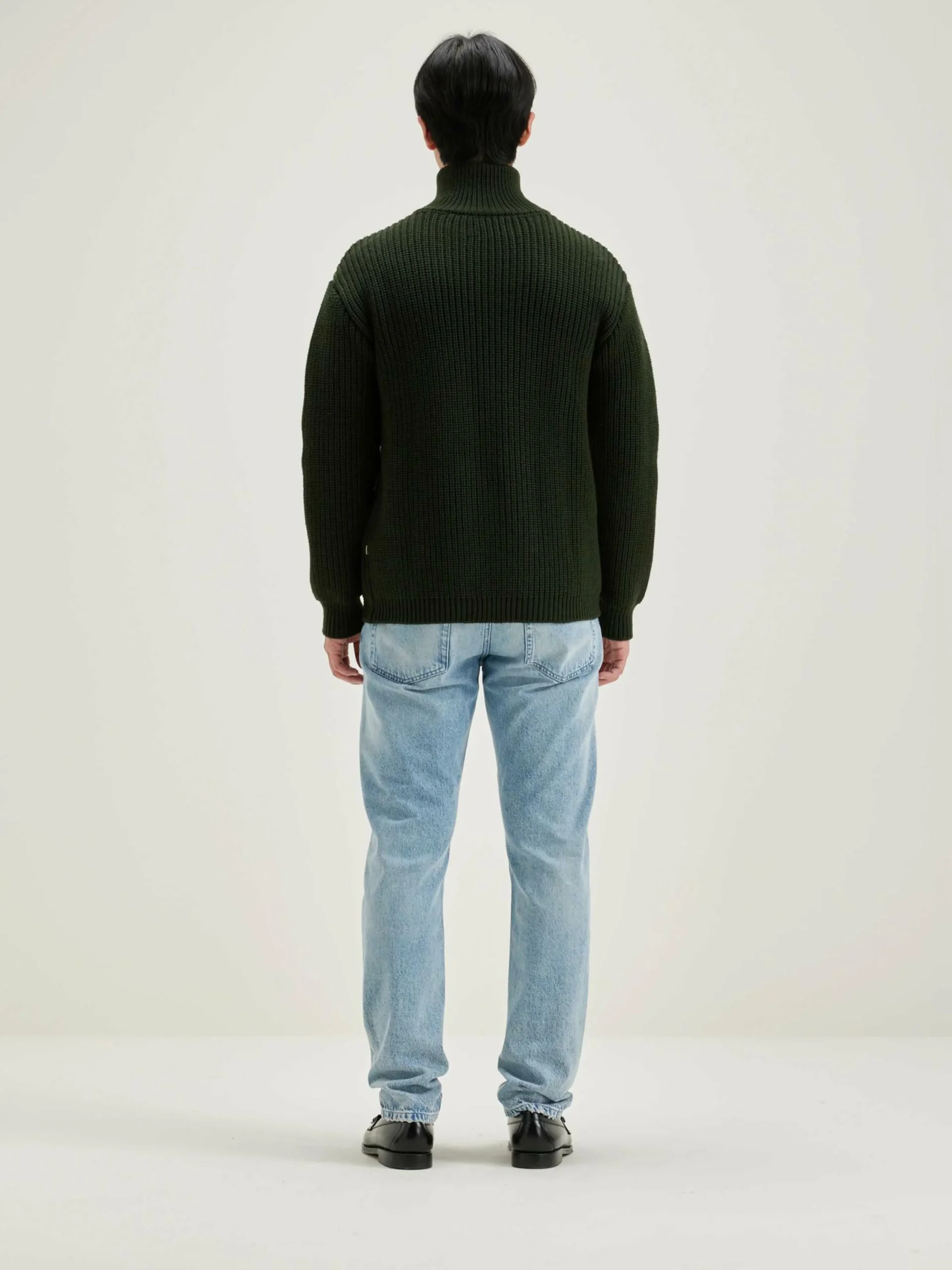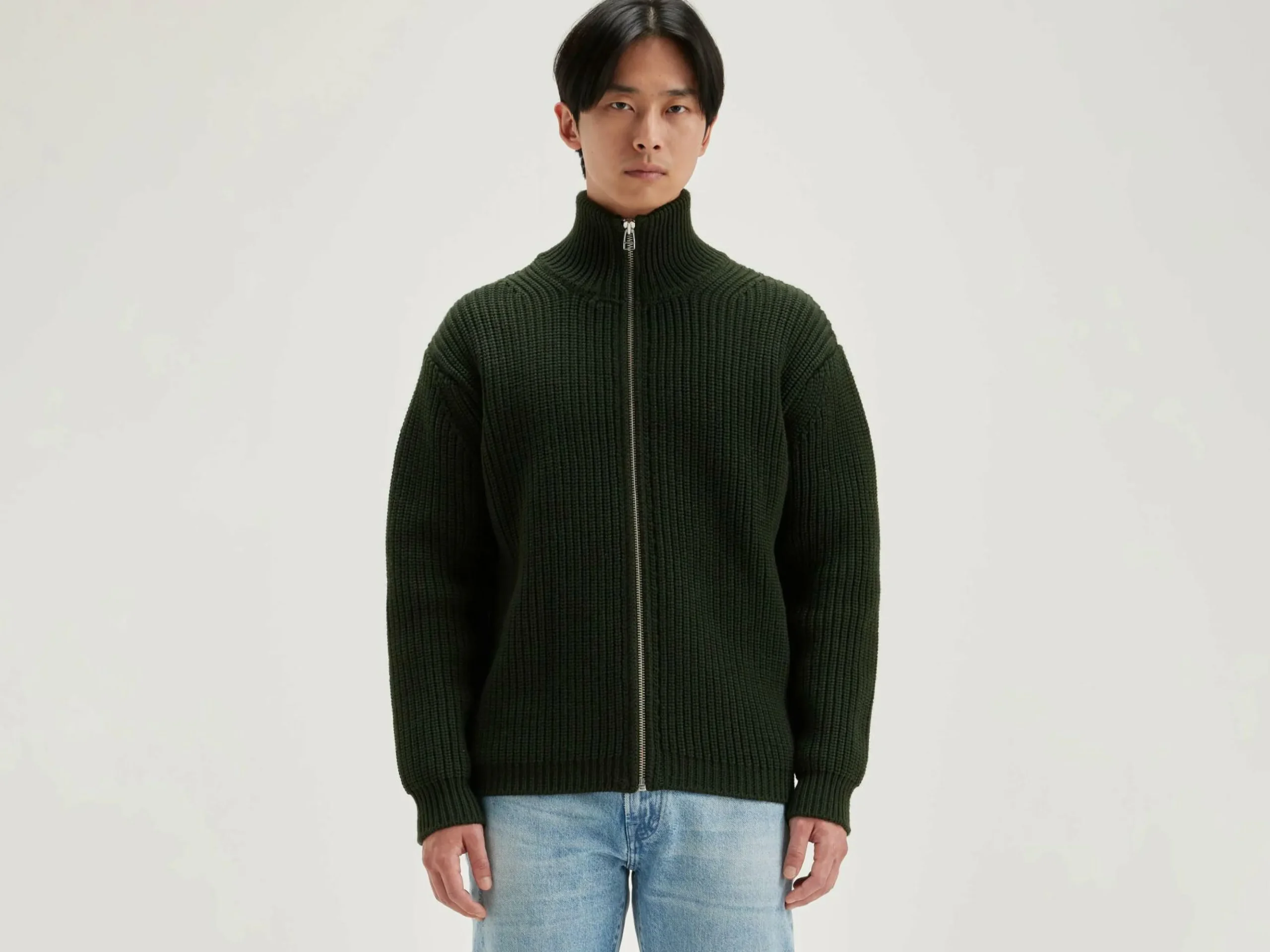 Cardigan décontracté en laine épaisse vert olive.