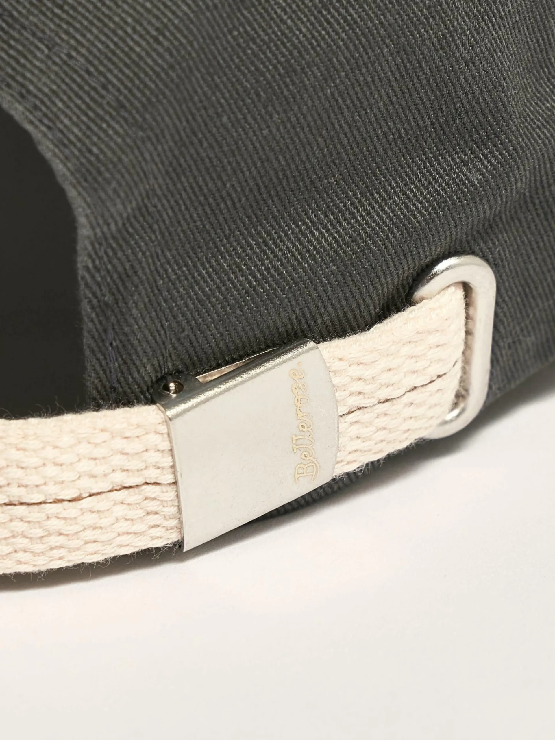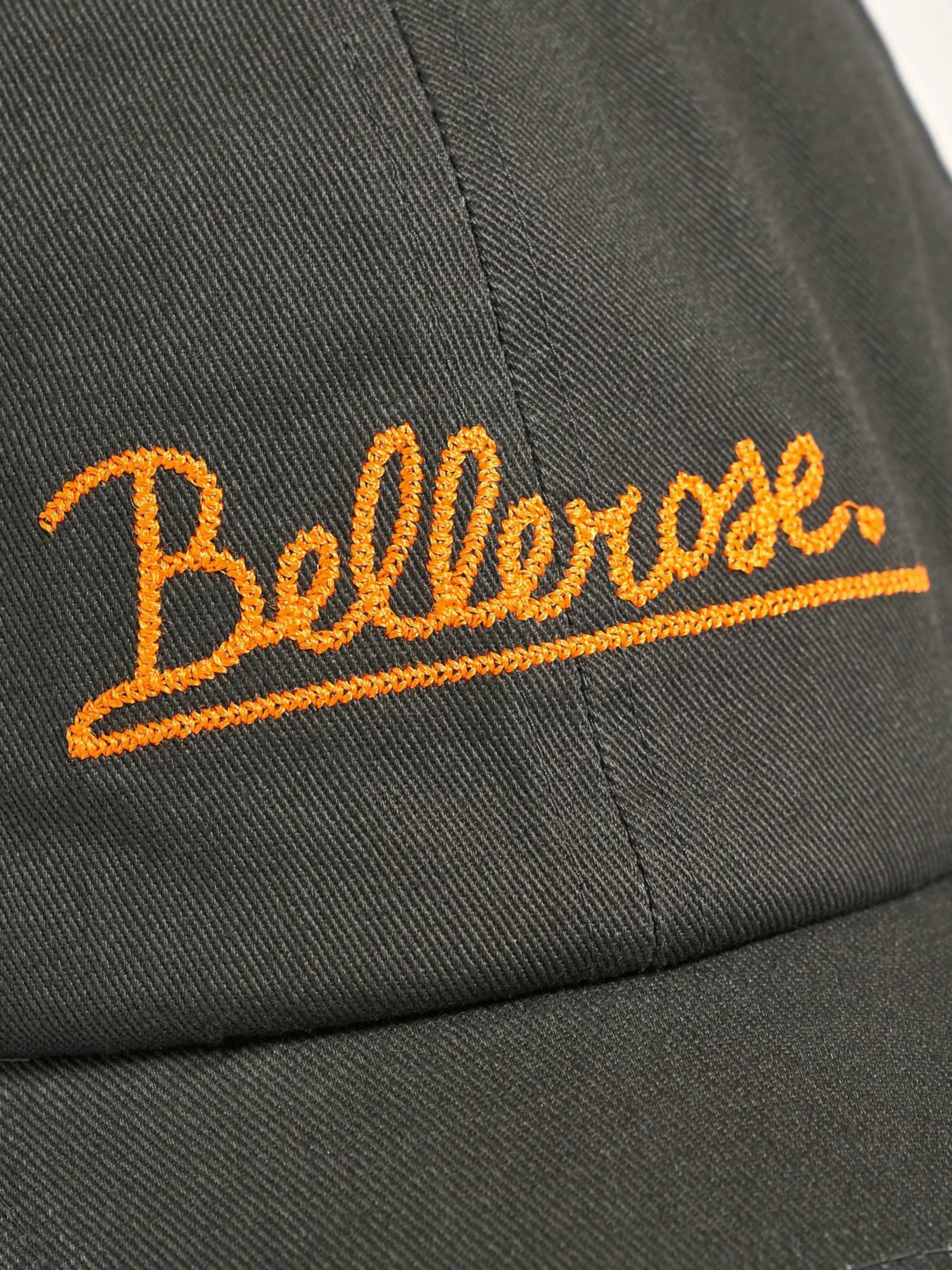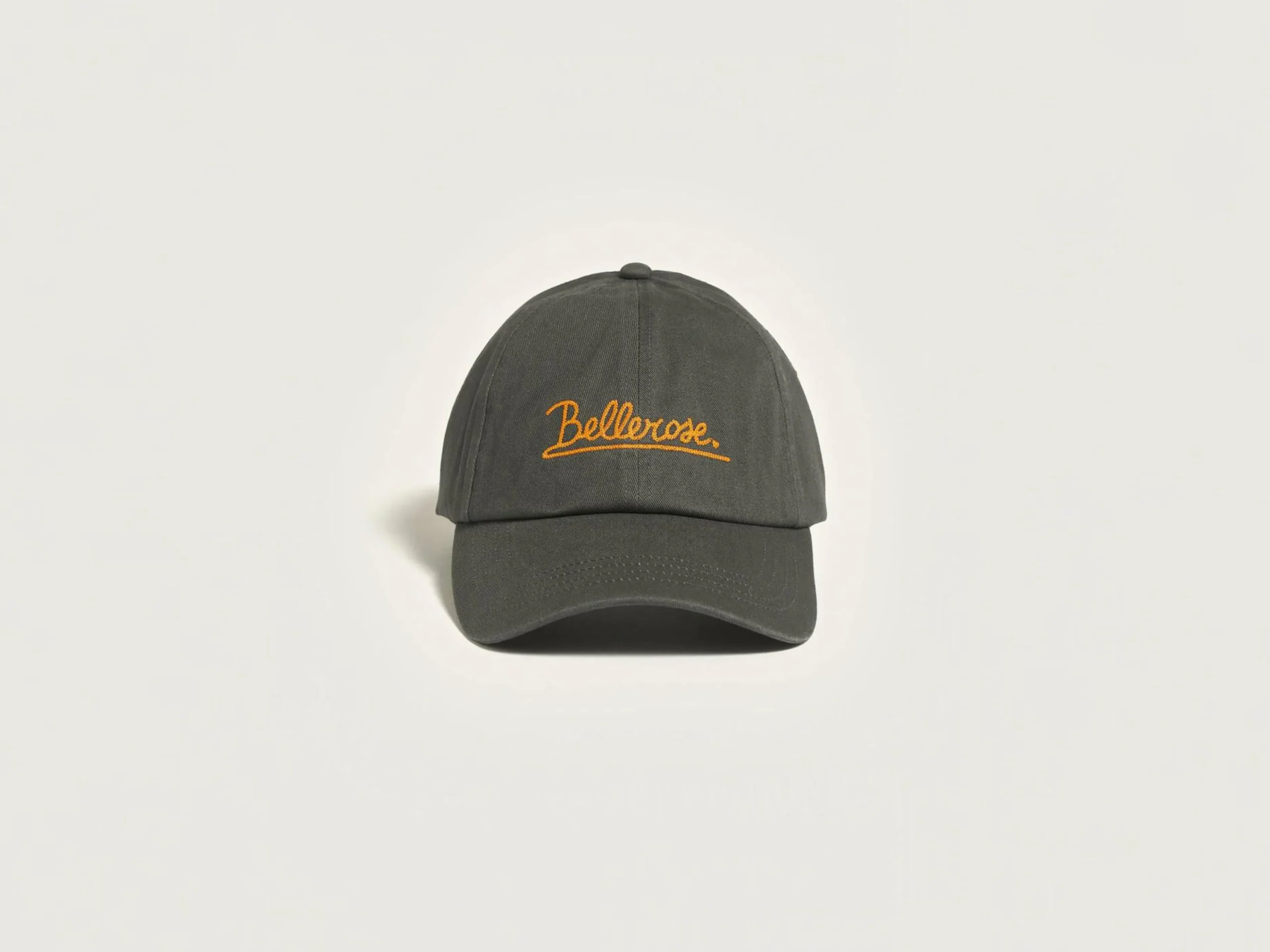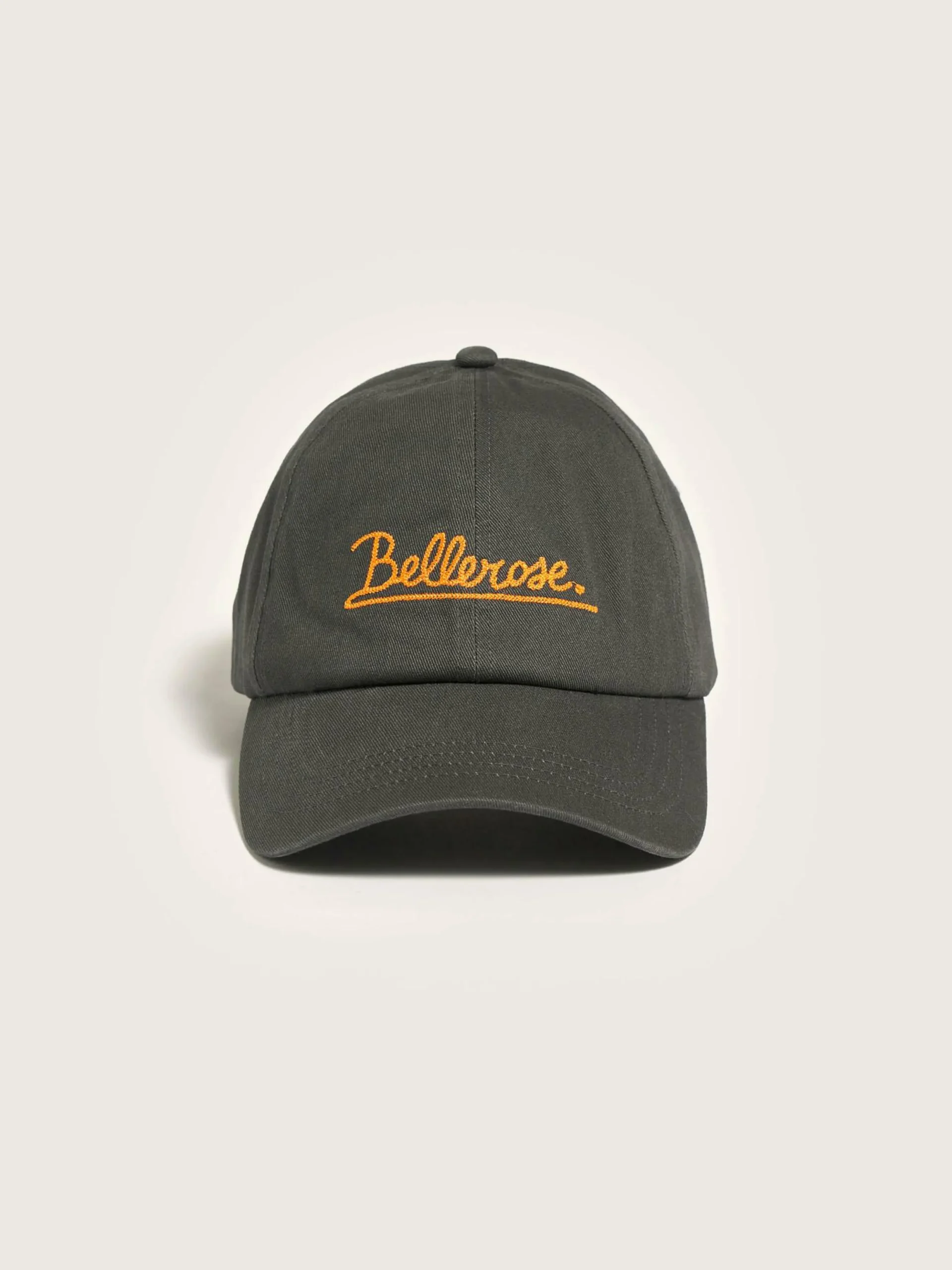 Casquette classique à 6 panneaux en coton gris avec broderie Bellerose orange à l’avant.