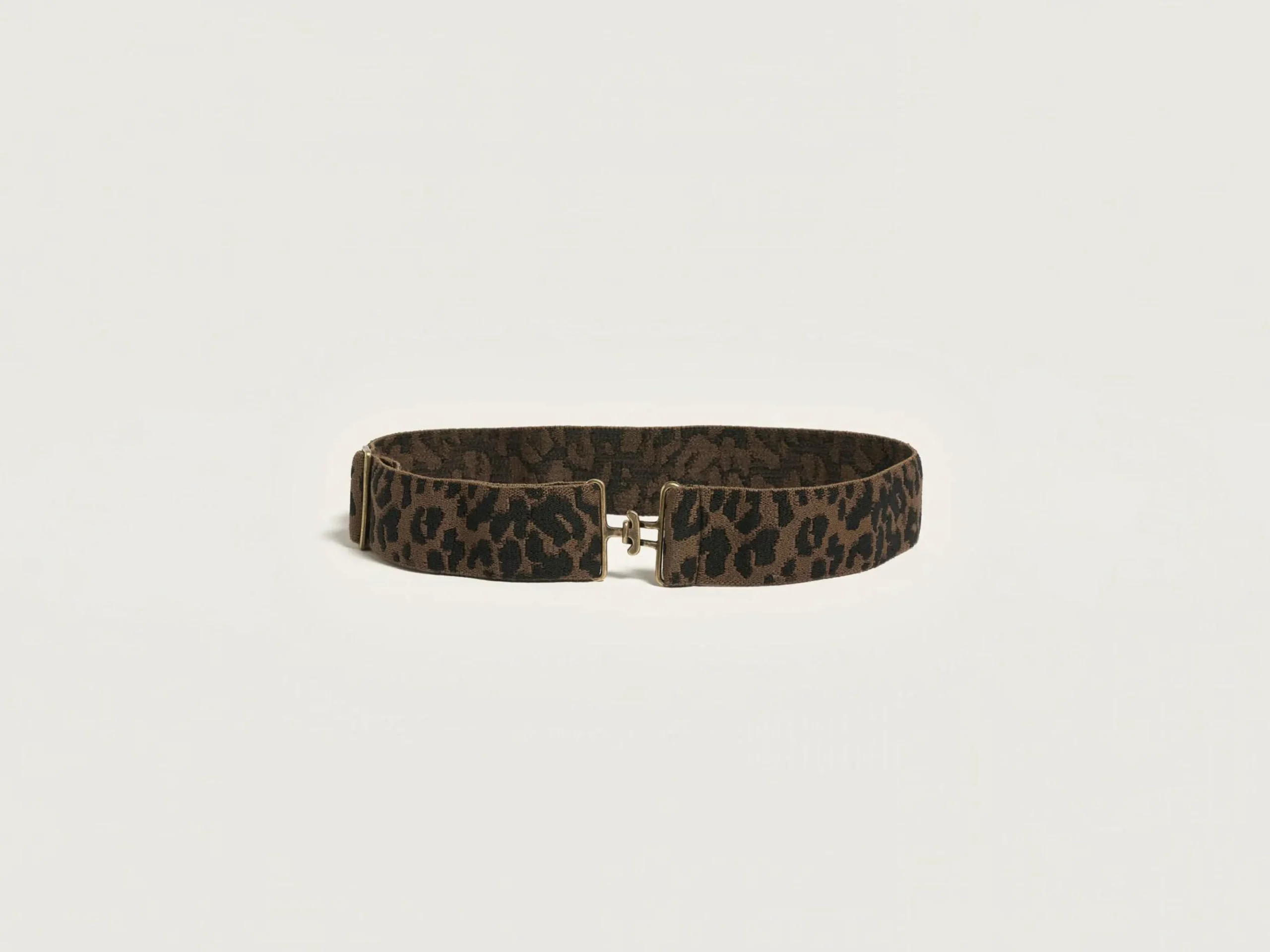 Ceinture élastique imprimée léopard avec boucle en laiton veilli.
