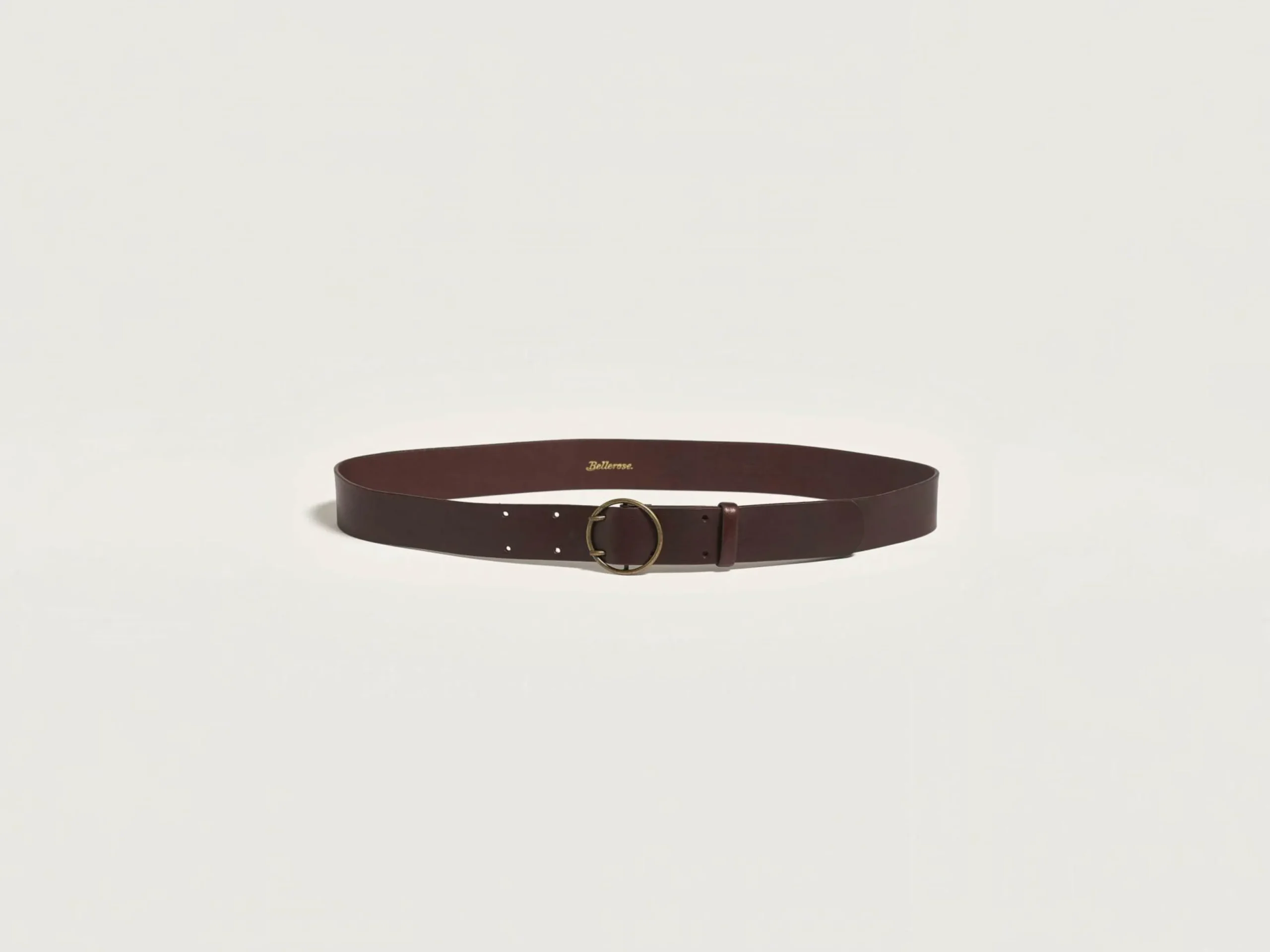 Ceinture classique en cuir lisse bordeaux avec boucle circulaire en laiton vieilli.