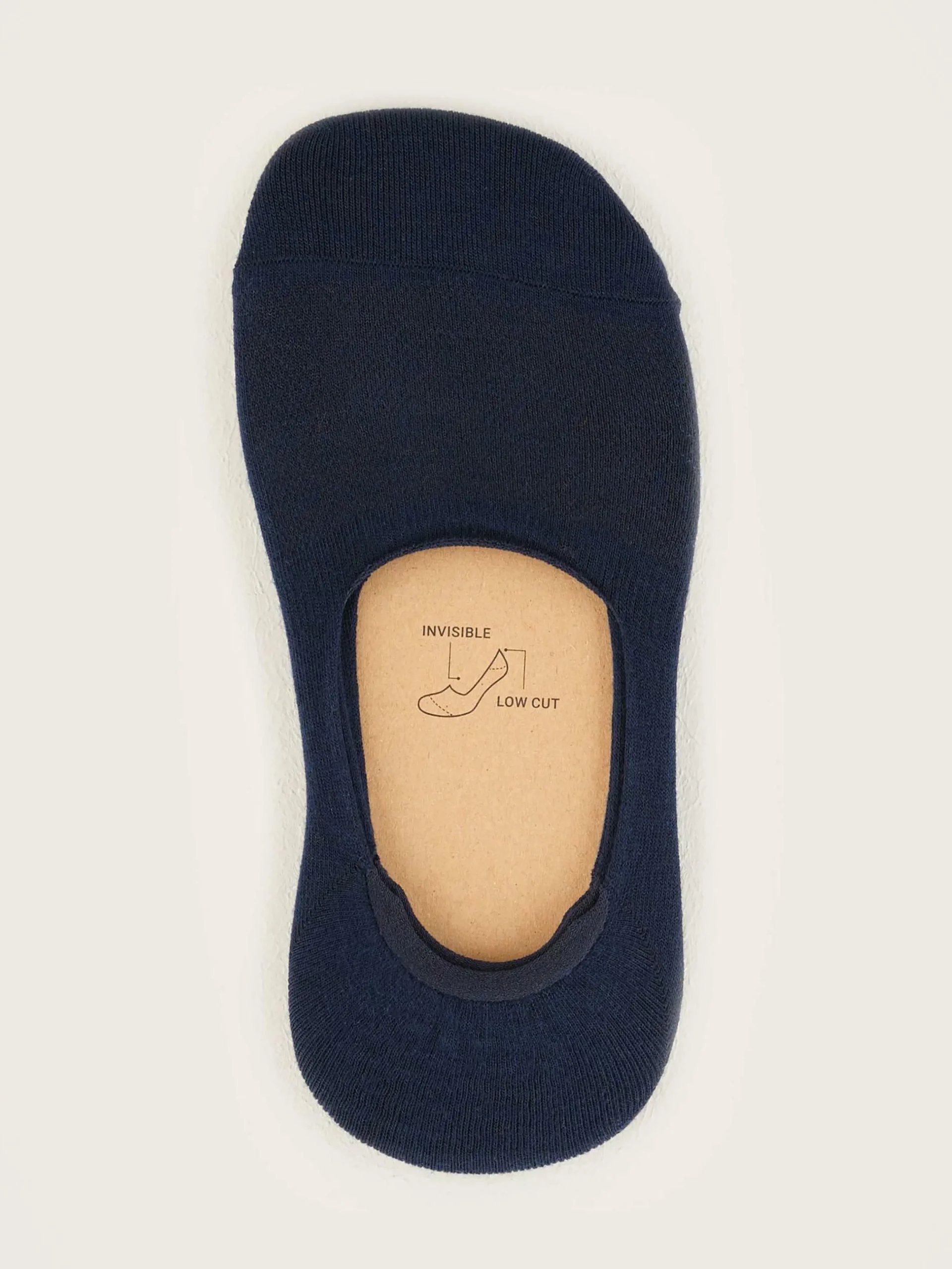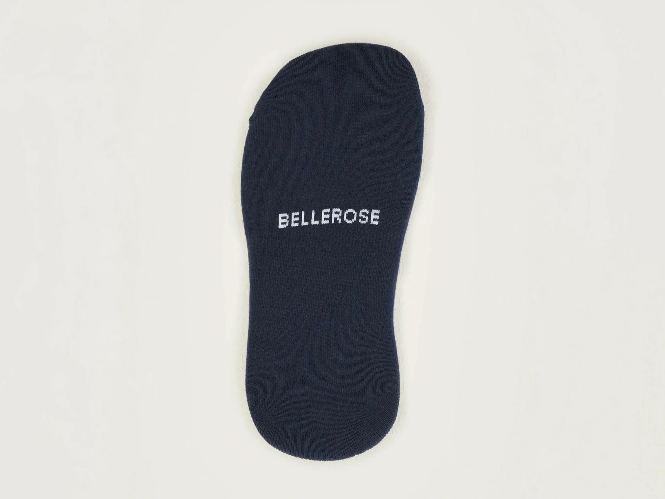 Chaussettes courtes en bleu marine avec tricot côtelé autour du pied et gomme antidérapante derrière le talon.