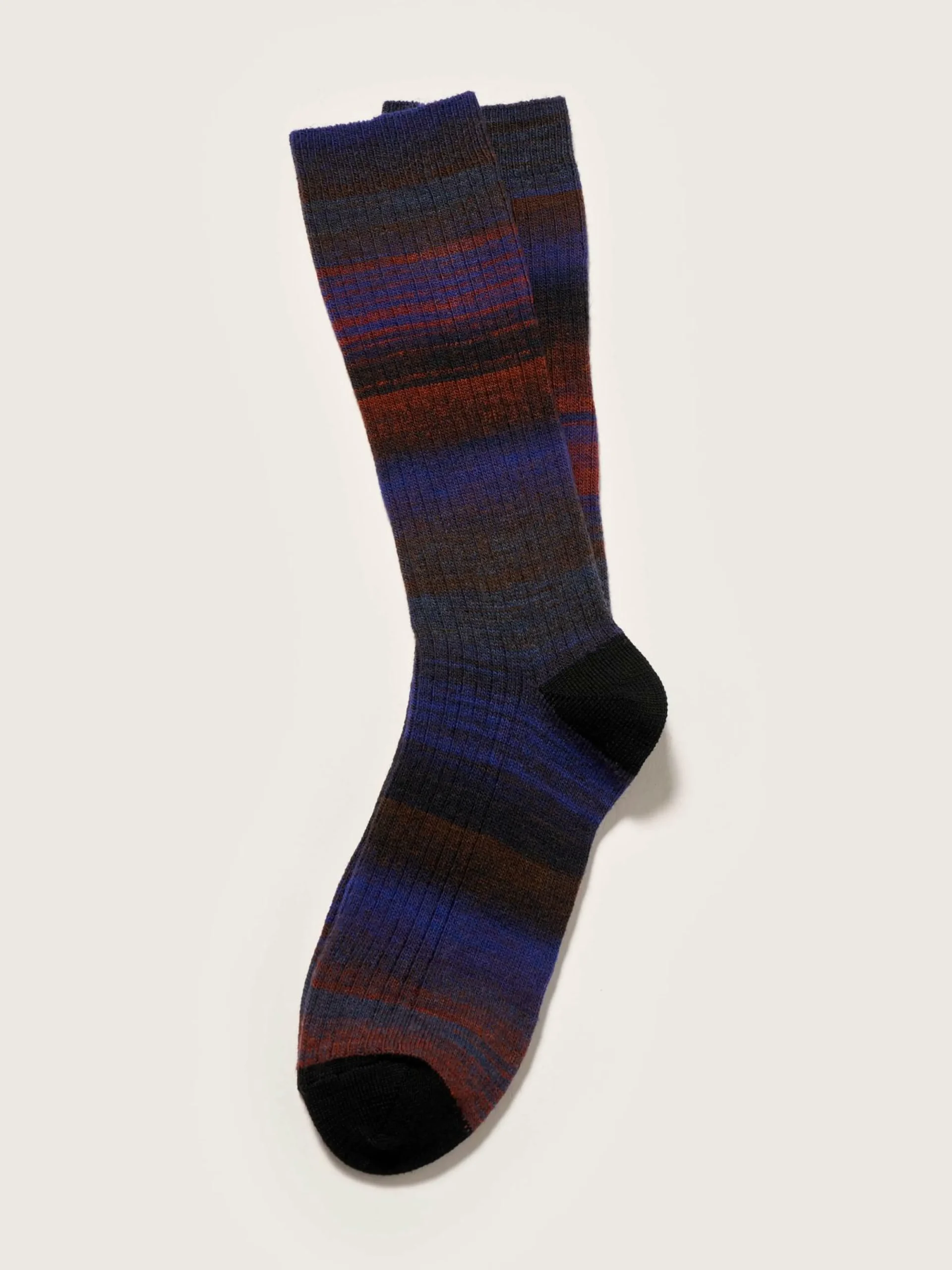 Chaussettes en maille côtelée tricotées en fil imprimé dans des tons violets, avec pointes et talons contrastés.