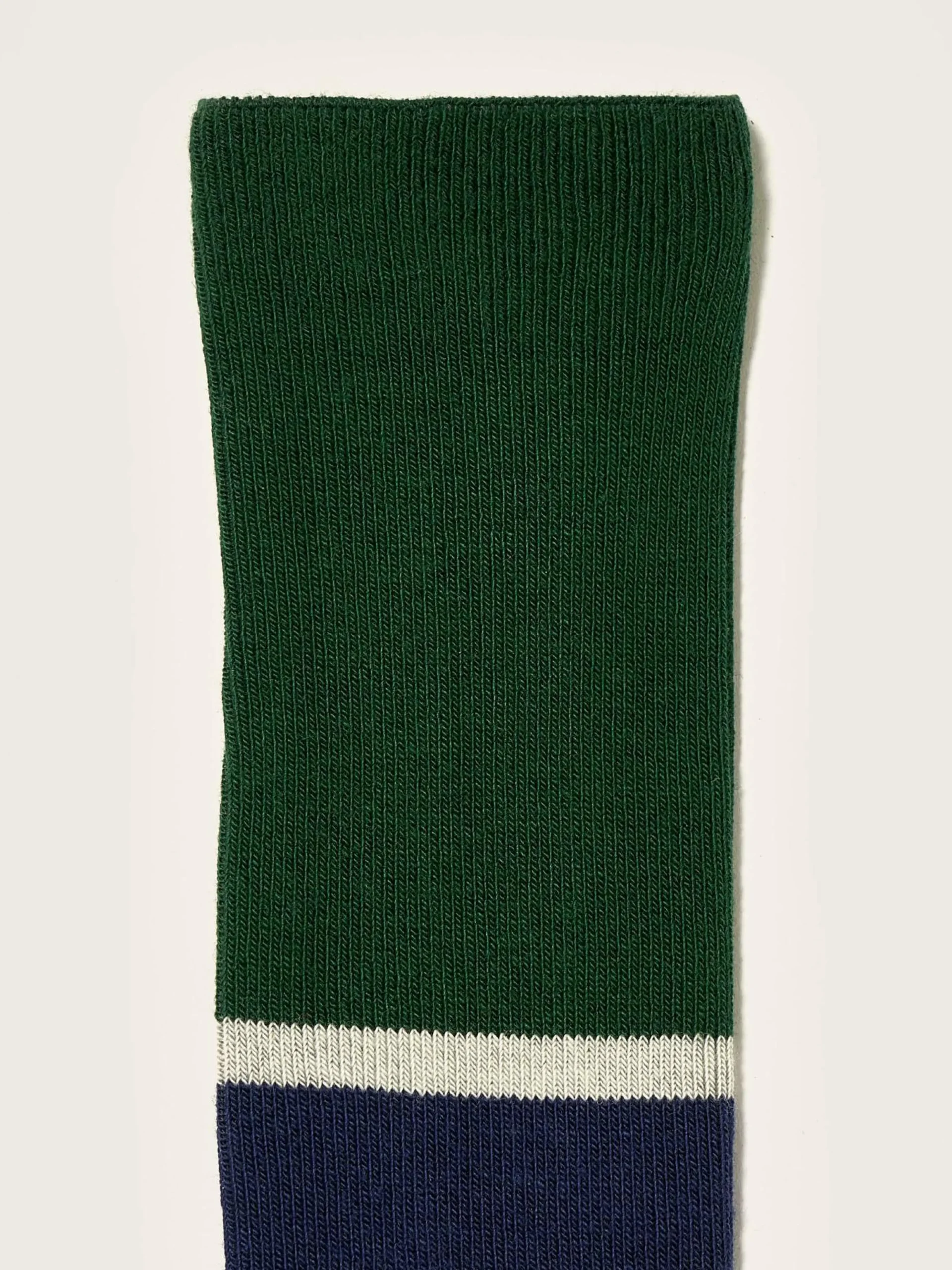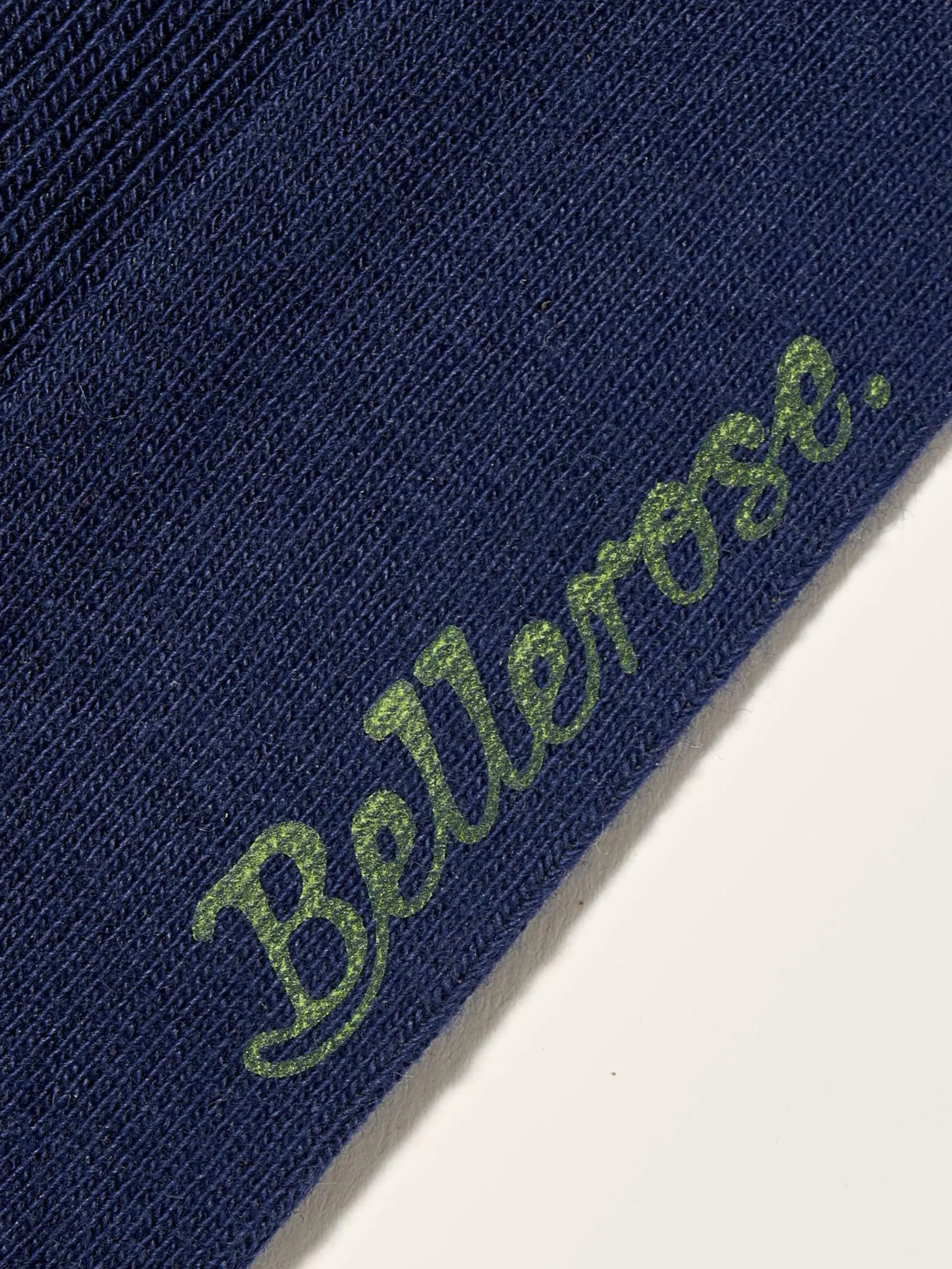 Chaussettes montantes bleues et vertes signées Bellerose sur la semelle.