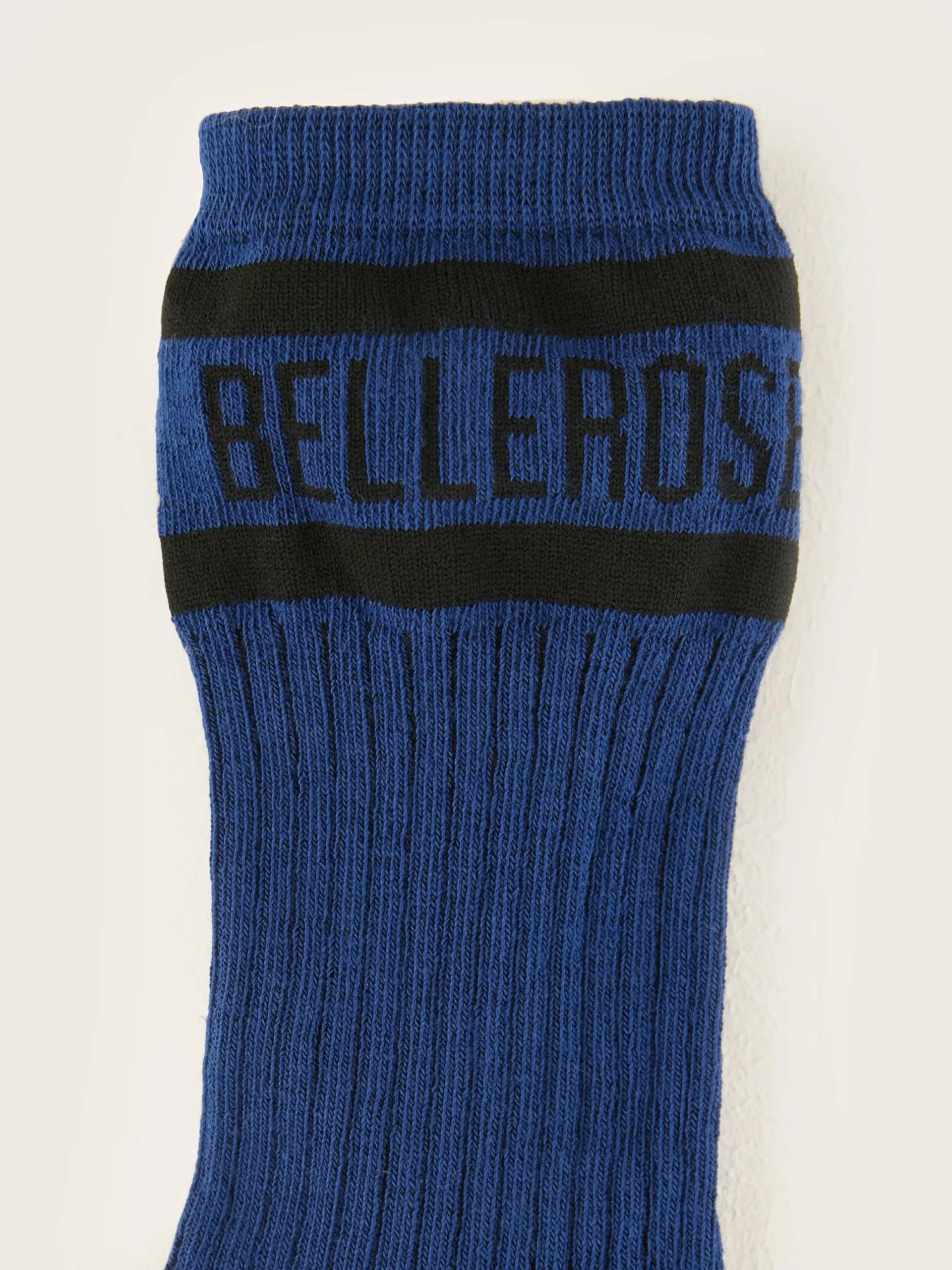 Chaussettes classiques en bleu avec le logo Bellerose en noir sur la cheville.