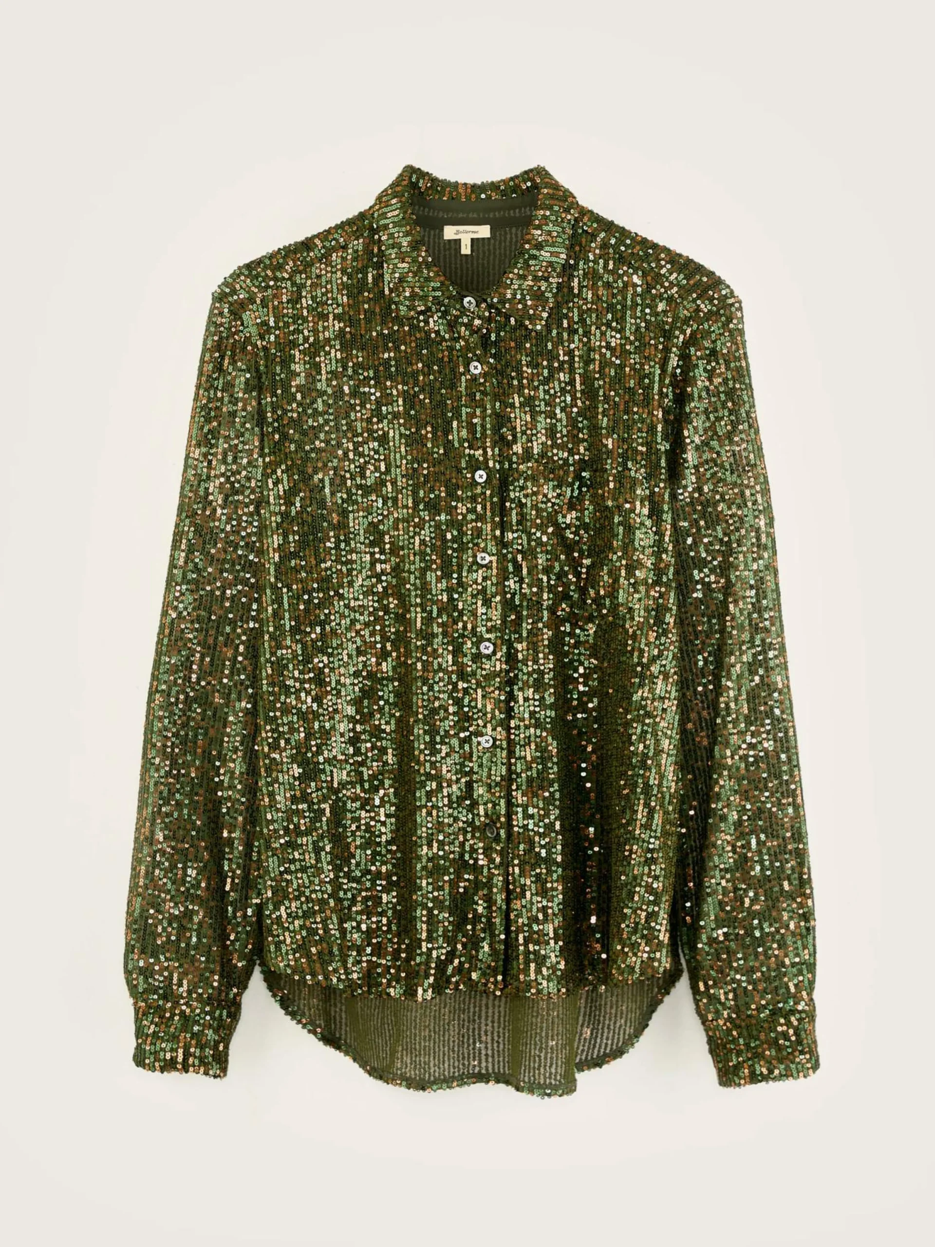 Chemise à coupe longue et droite entièrement brodée de sequins vert mousse.