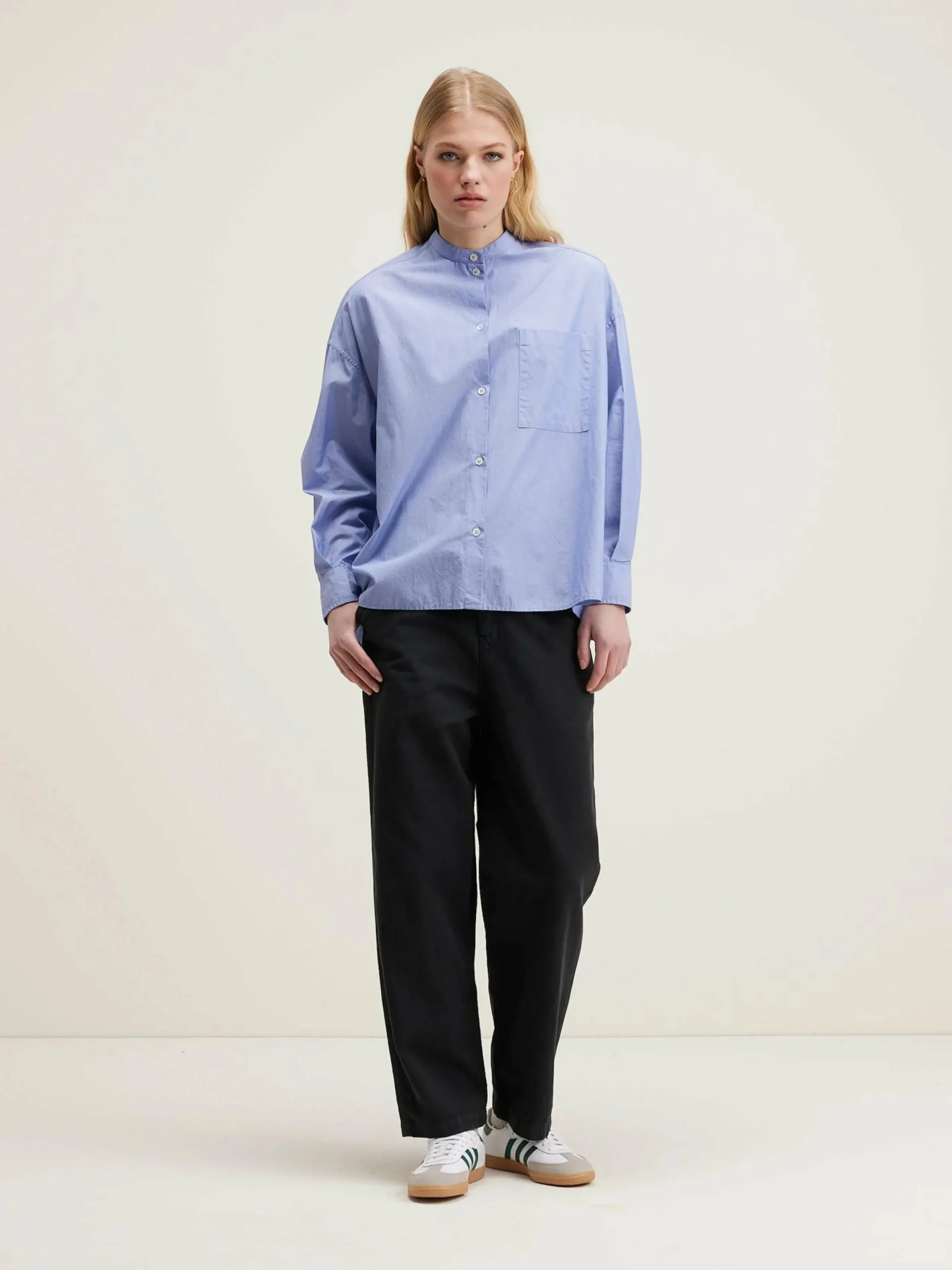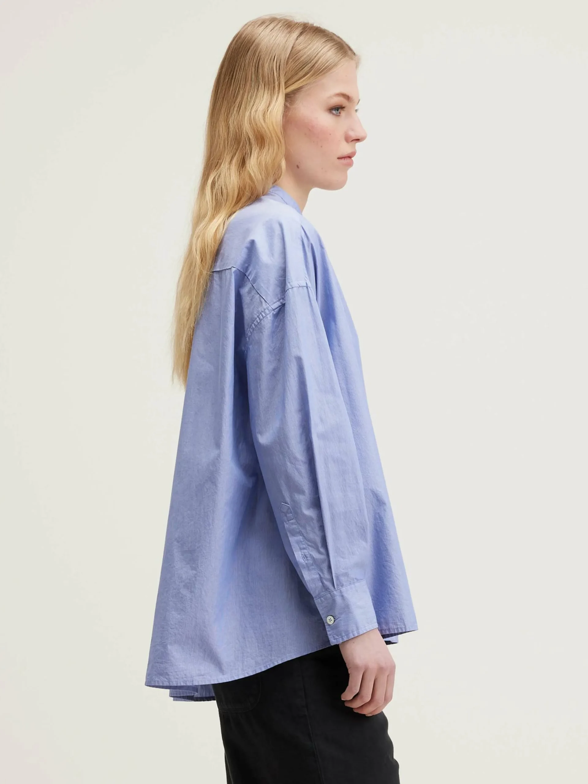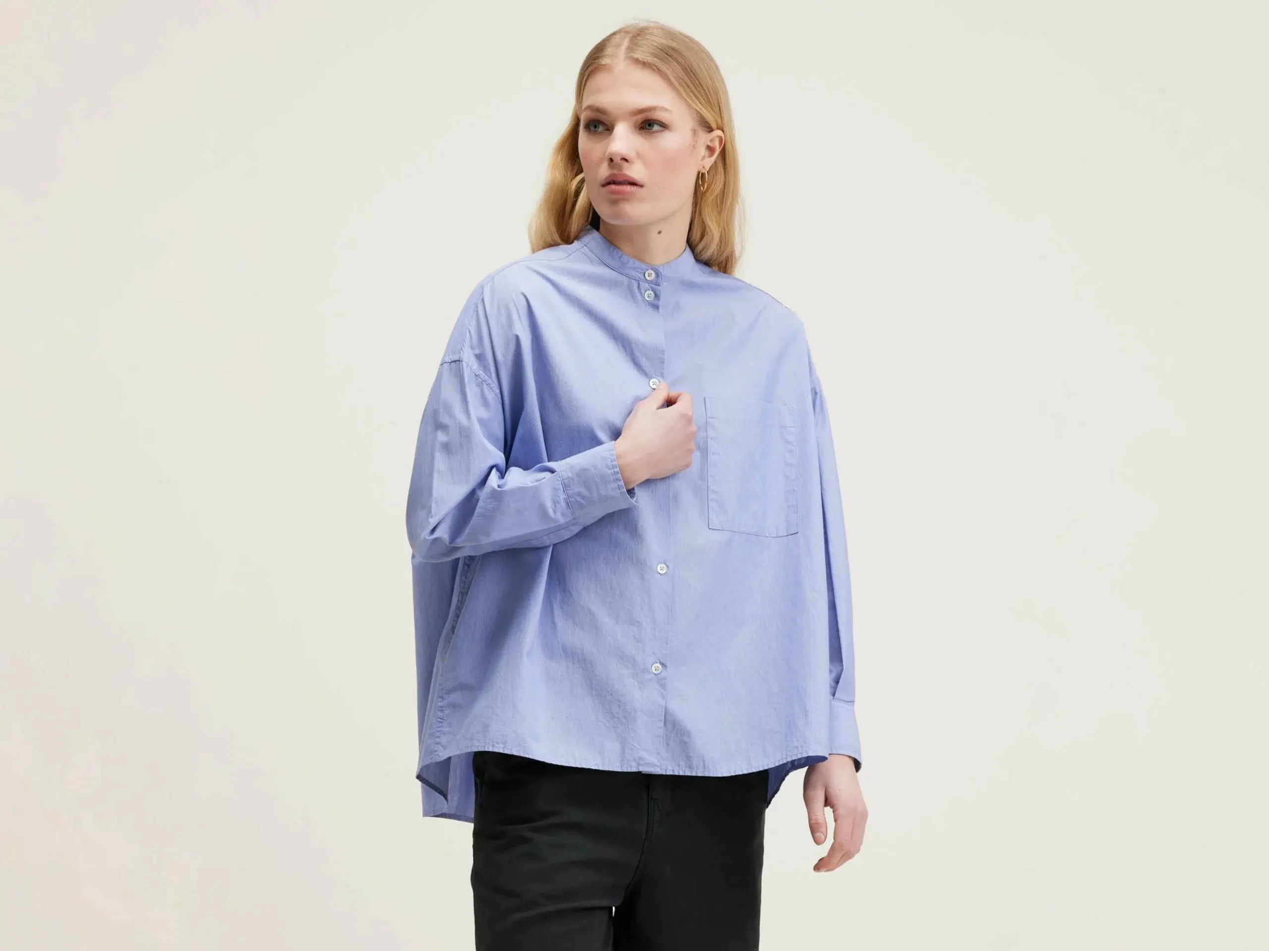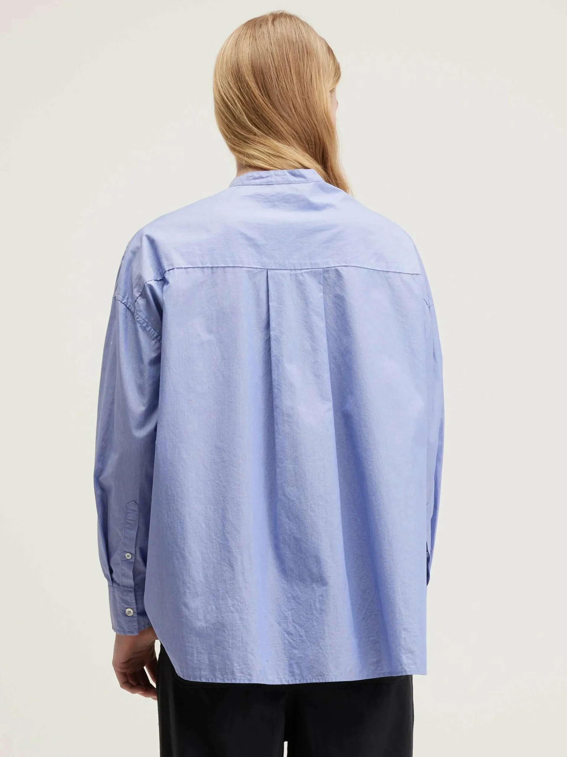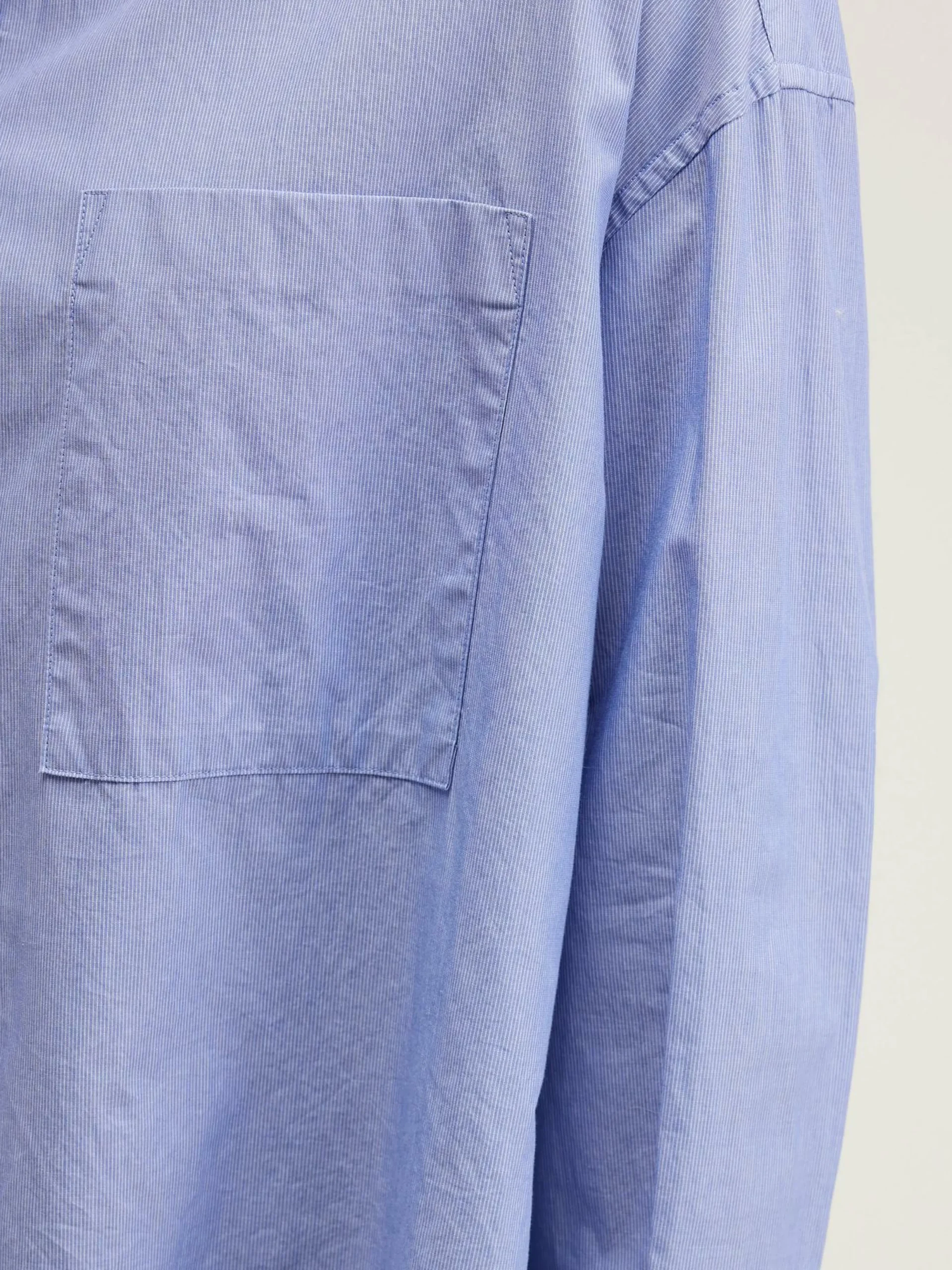 Chemise boutonnée oversize en popeline de coton rayée avec poche plaquée et petit col montant.