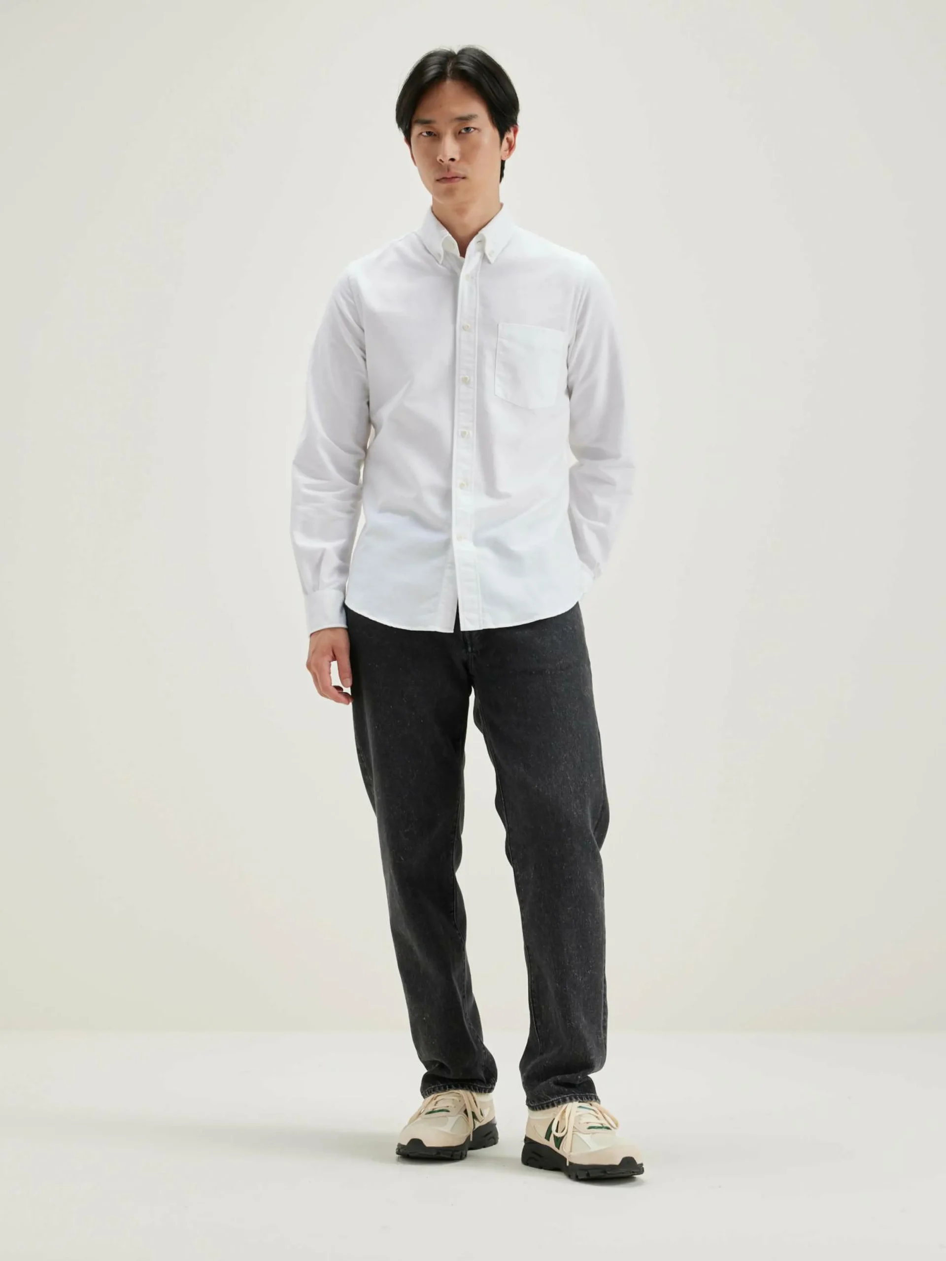 Chemise en popeline de coton blanche, coupe slim et col boutonné.