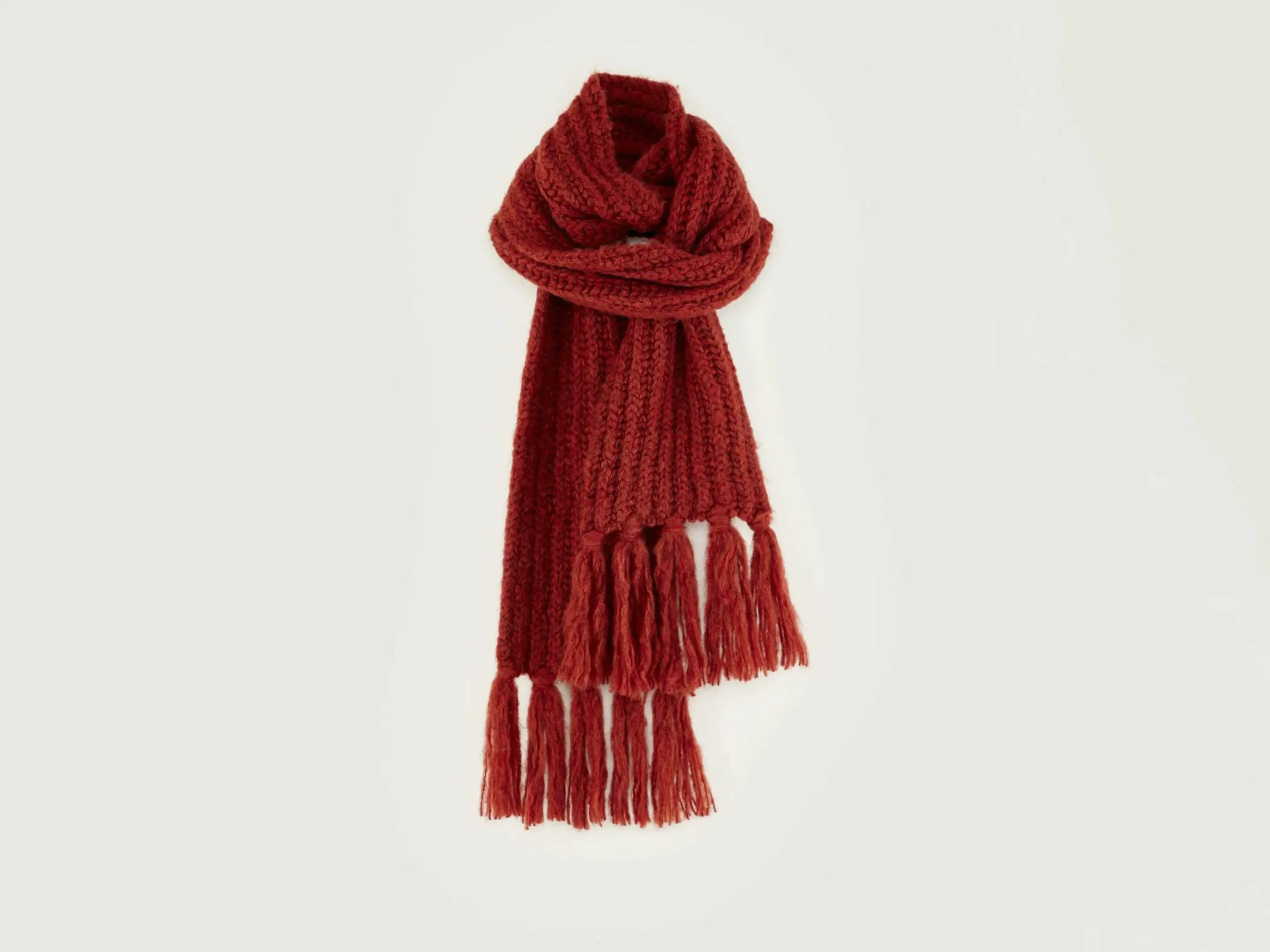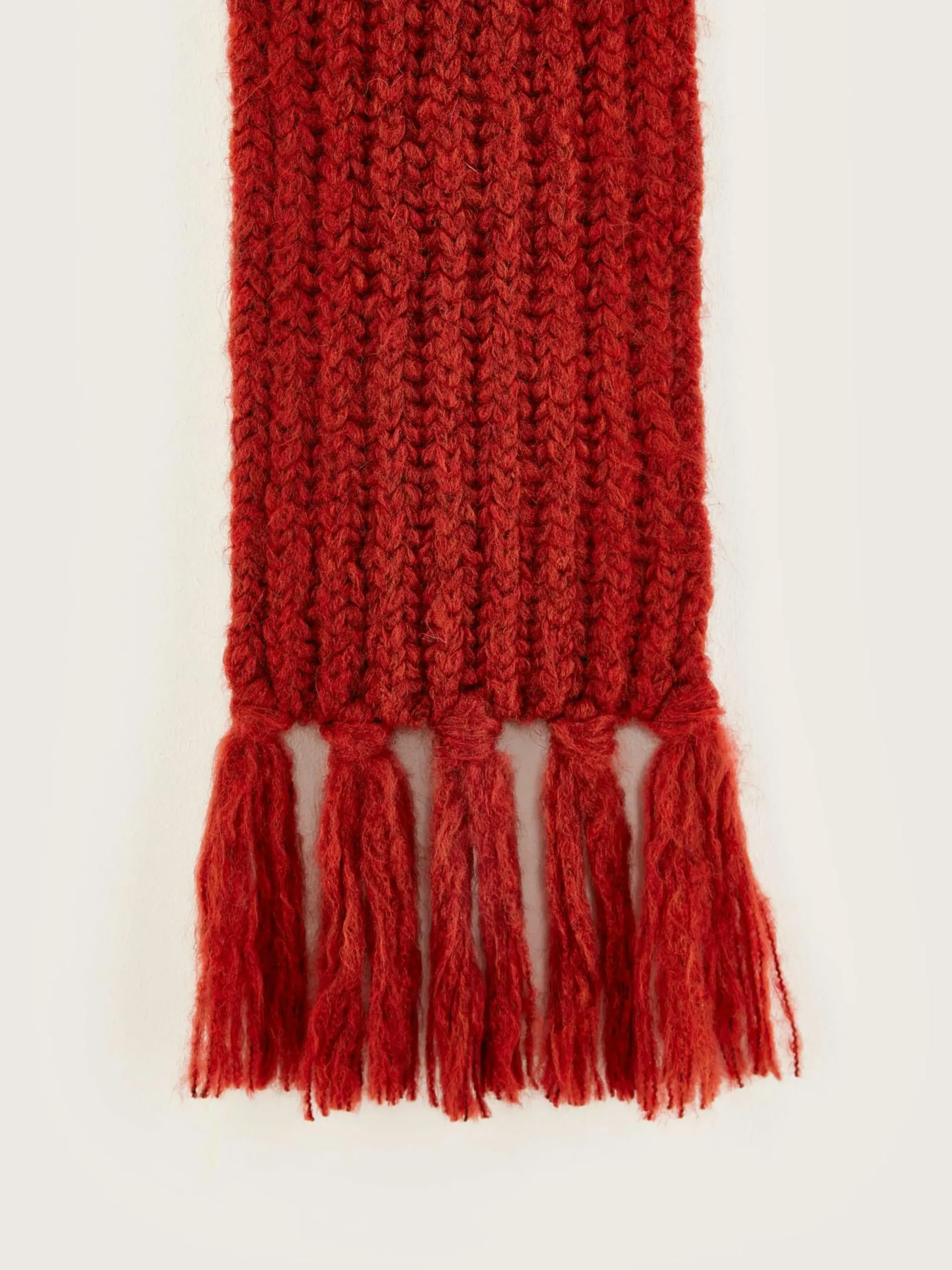 Longue écharpe de couleur brune en maille côtelée avec franges.