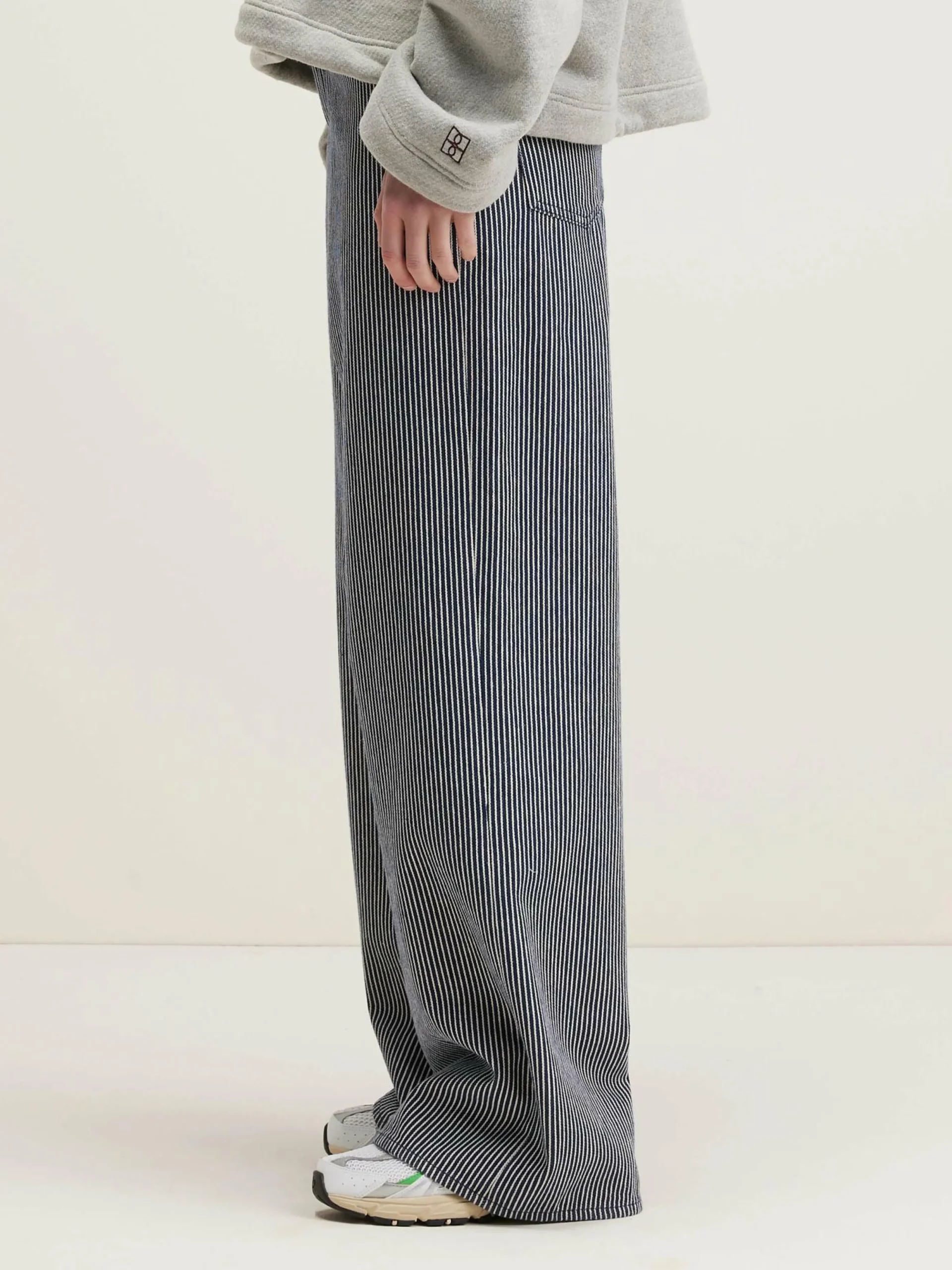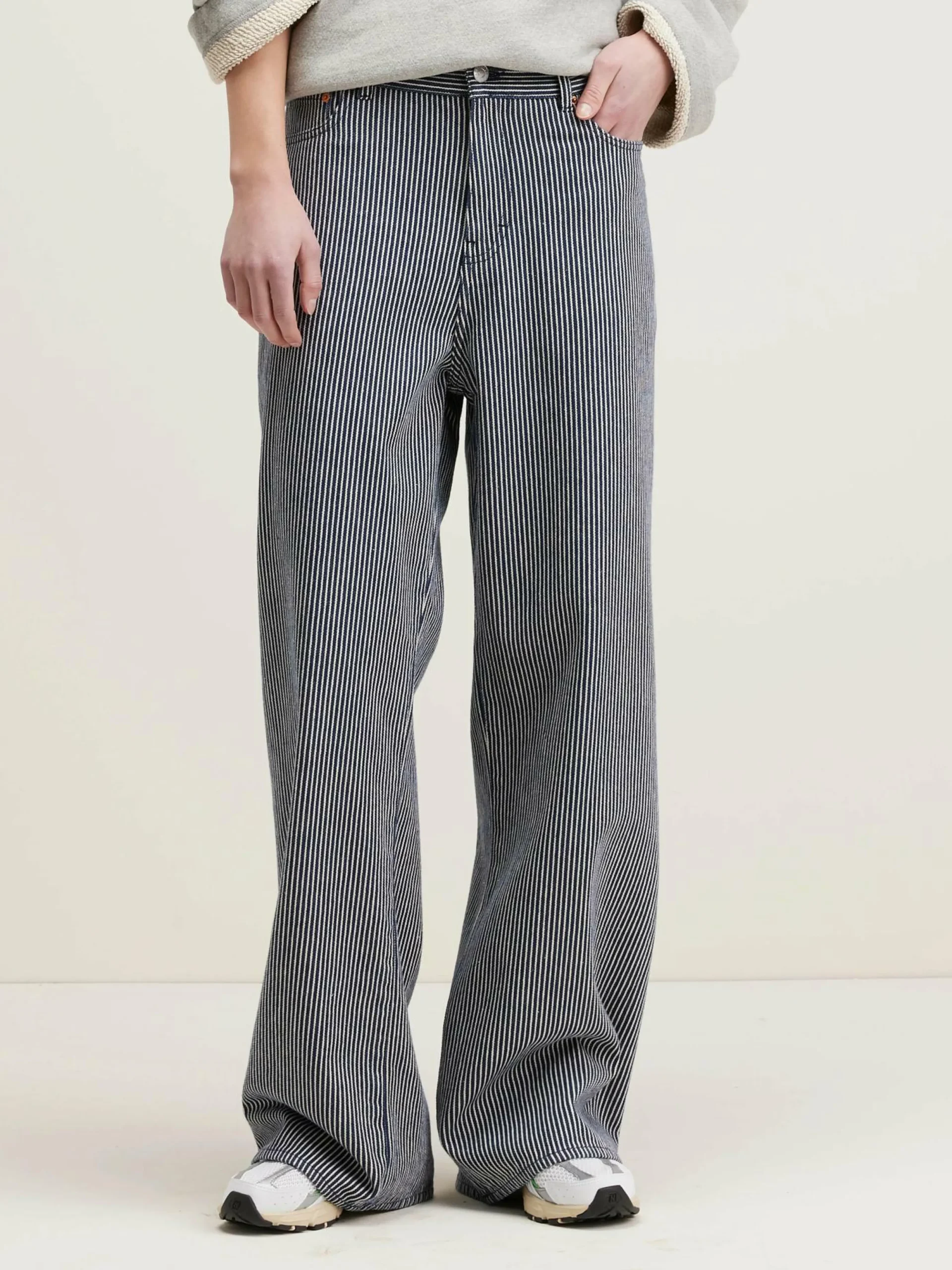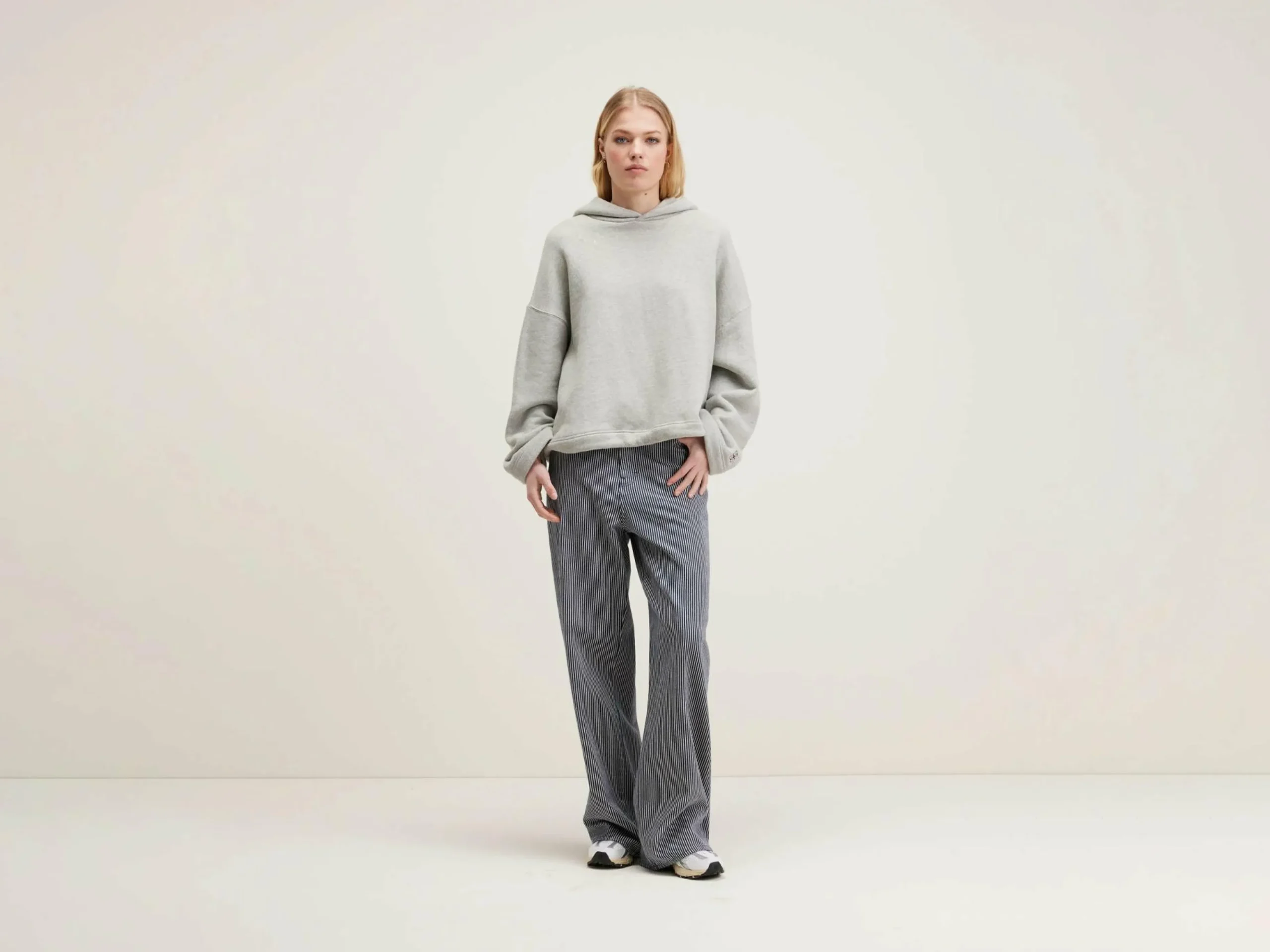 Jean boyfriend taille haute à jambes larges avec détails usés sur l’ourlet, en denim de coton délavé clair.
