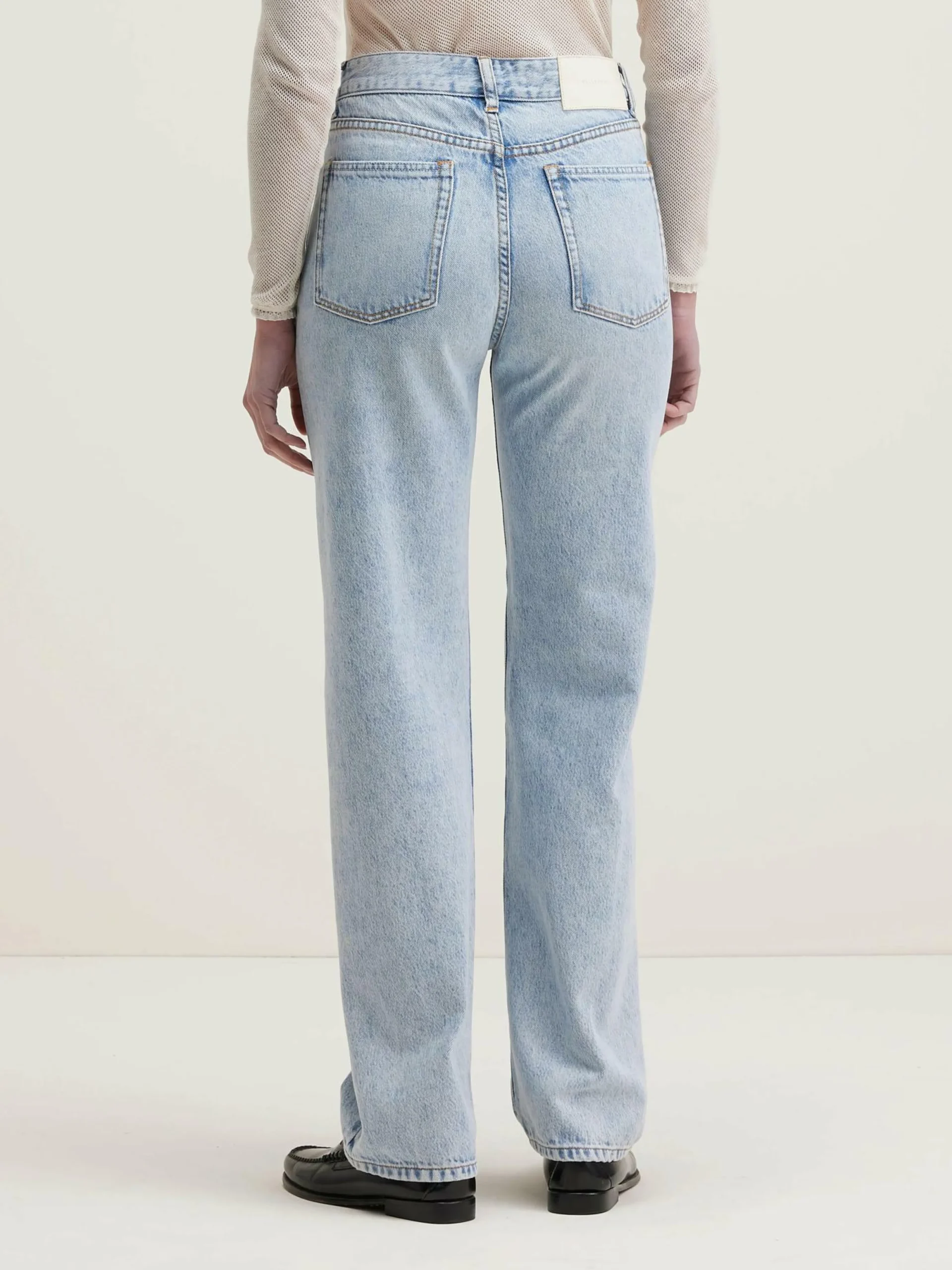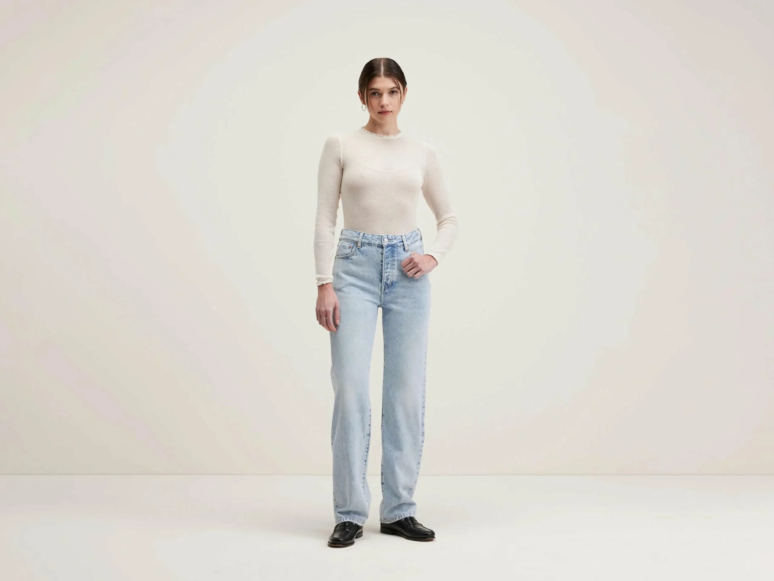 Jean taille haute, jambes droites, en denim de coton bleu clair délavé.