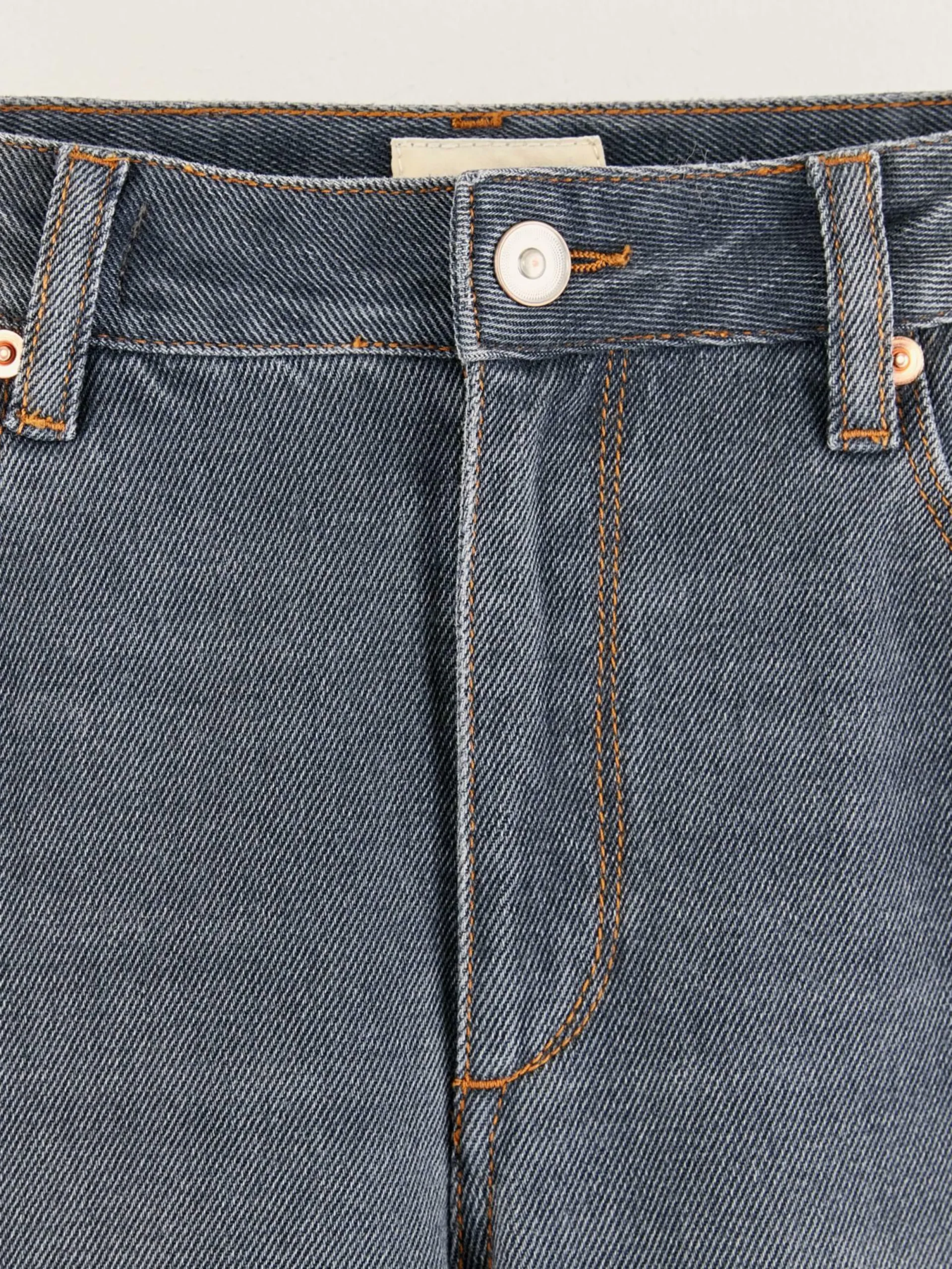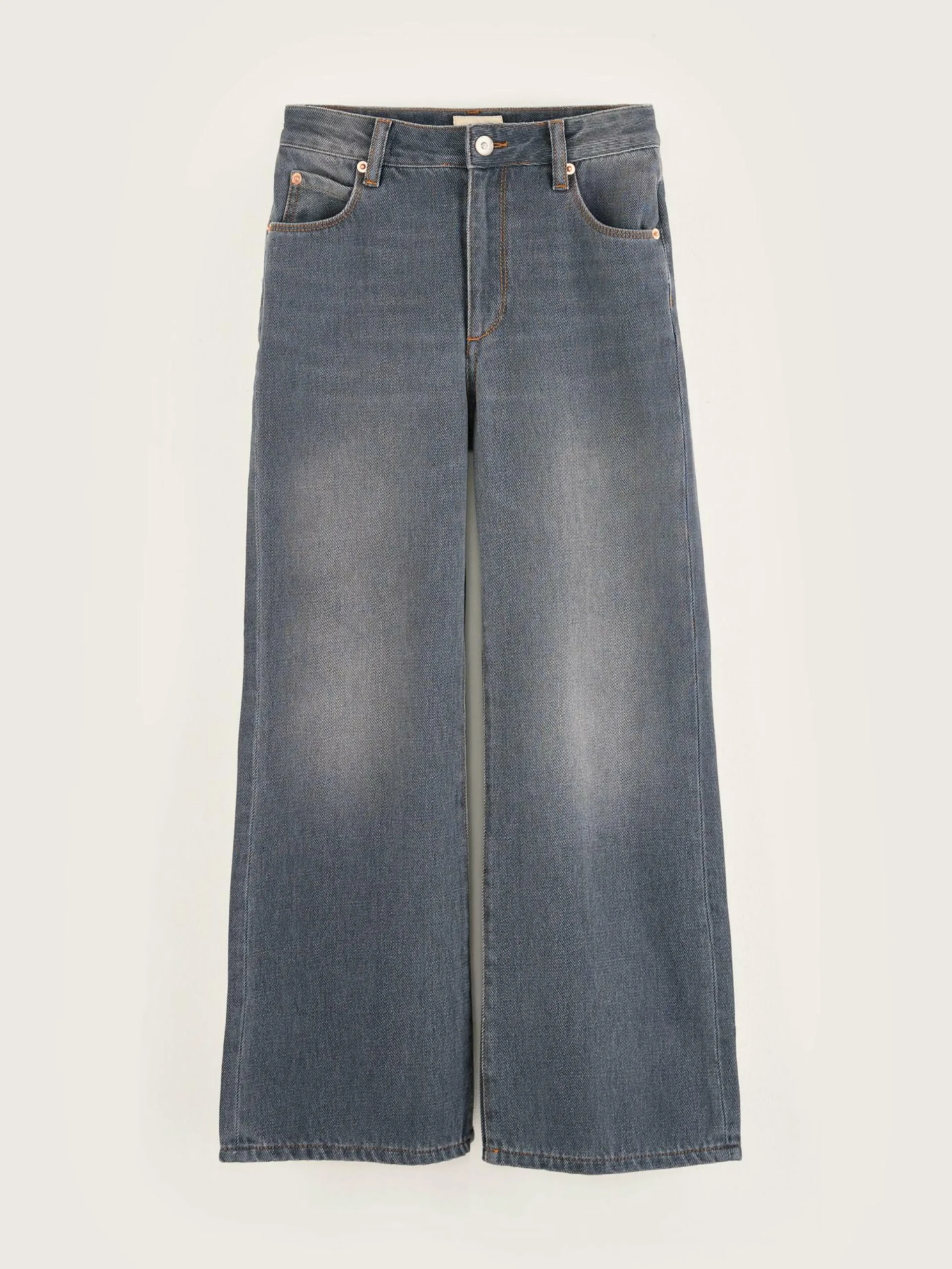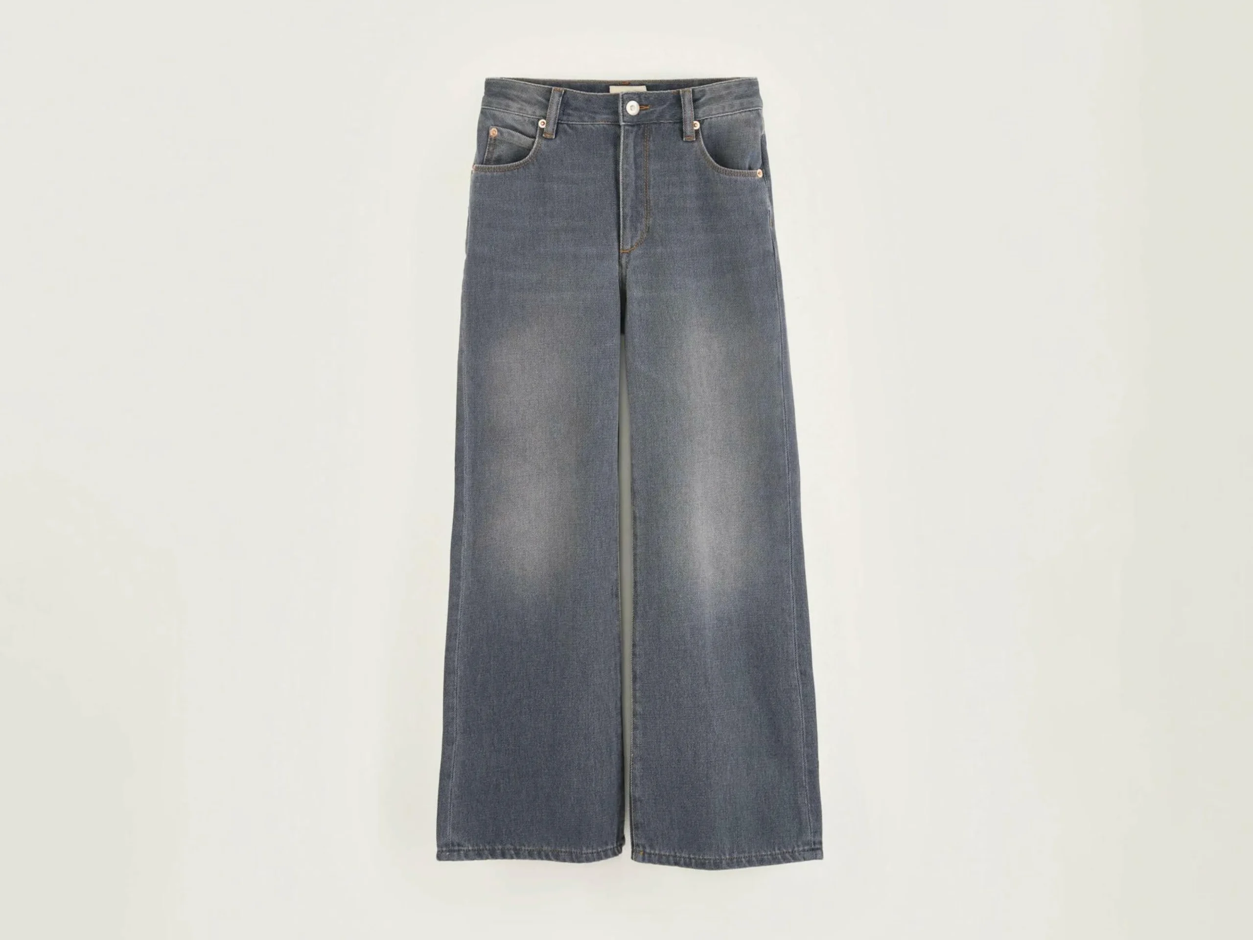 Jean taille haute jambes évasées en denim de coton, lavage used grey.