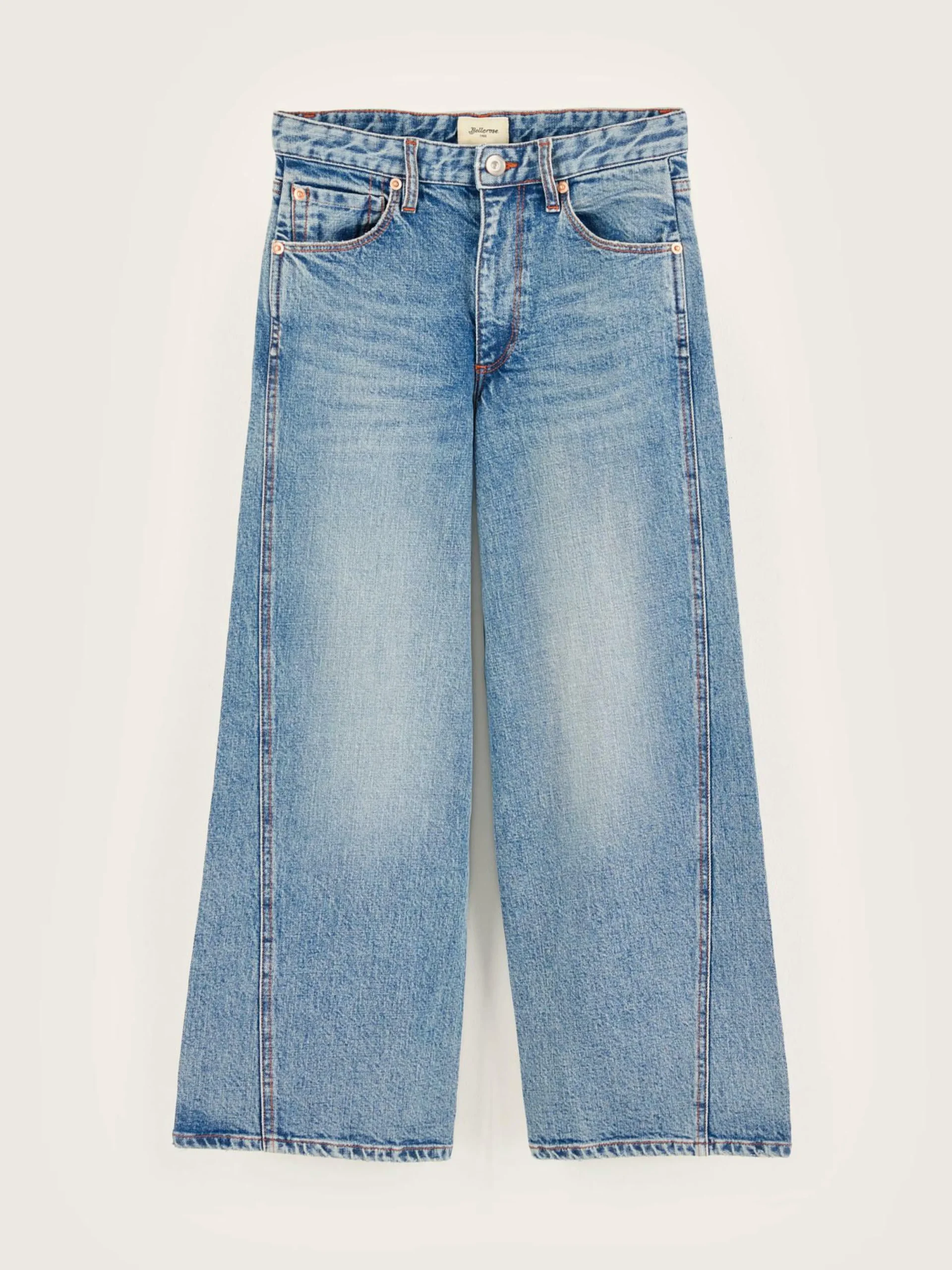 Jean taille basse et jambes évasées lavage coloeur bleu clair.