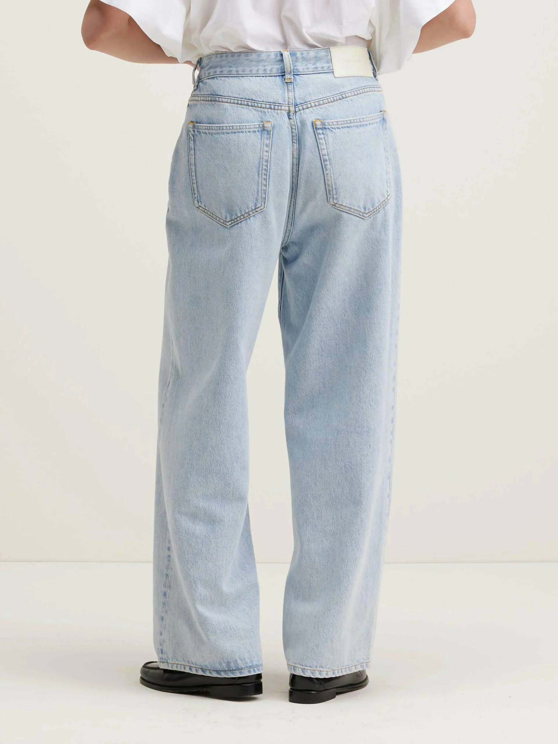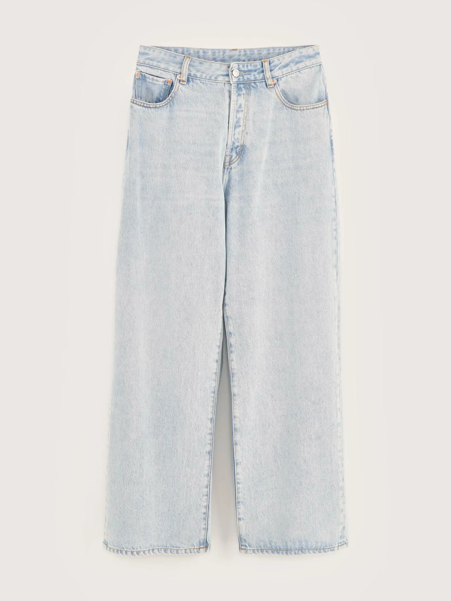 Jean taille régulière, jambes larges, couleur bleu clair délavé.