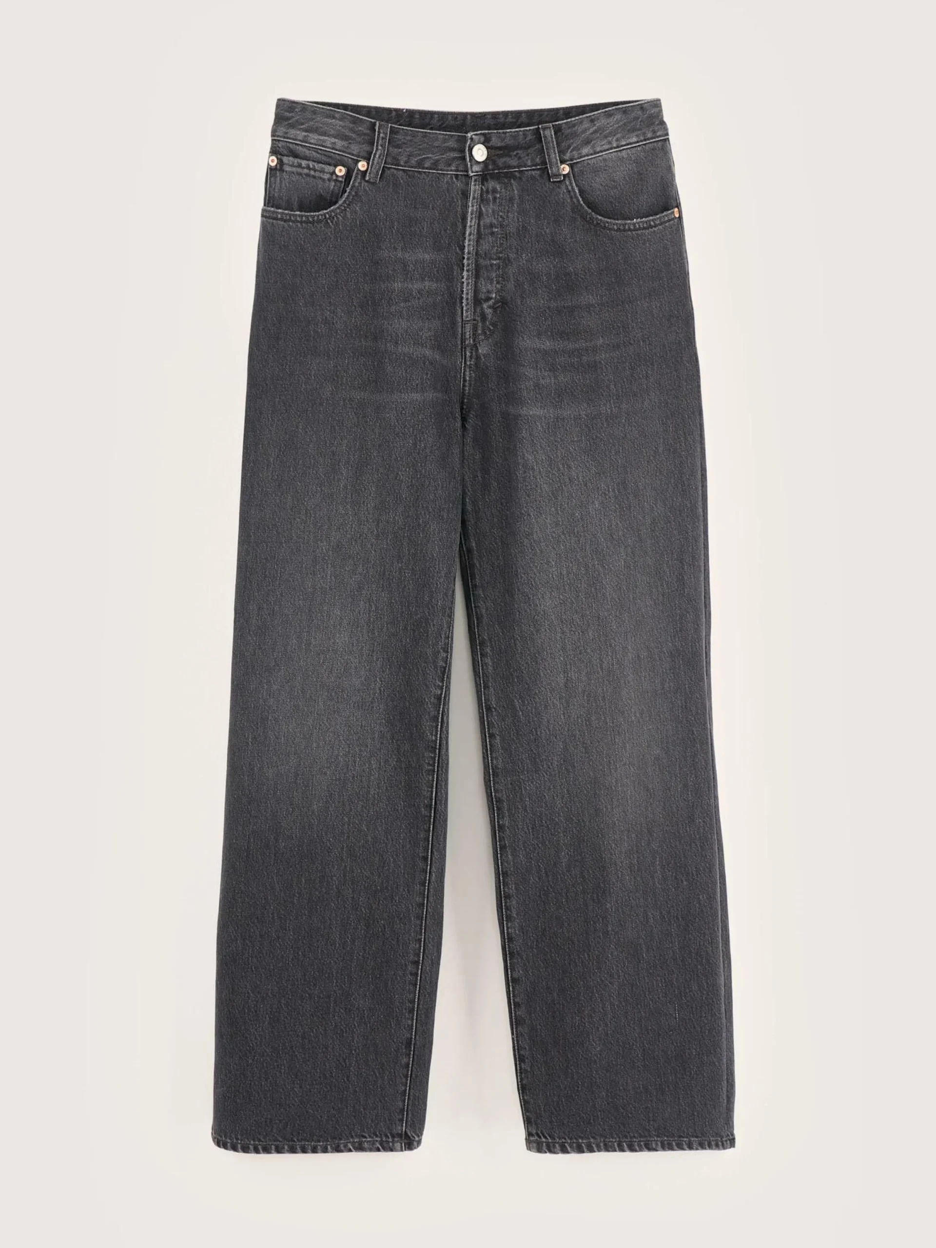 Jean taille régulière, jambes larges, couleur noir usé.