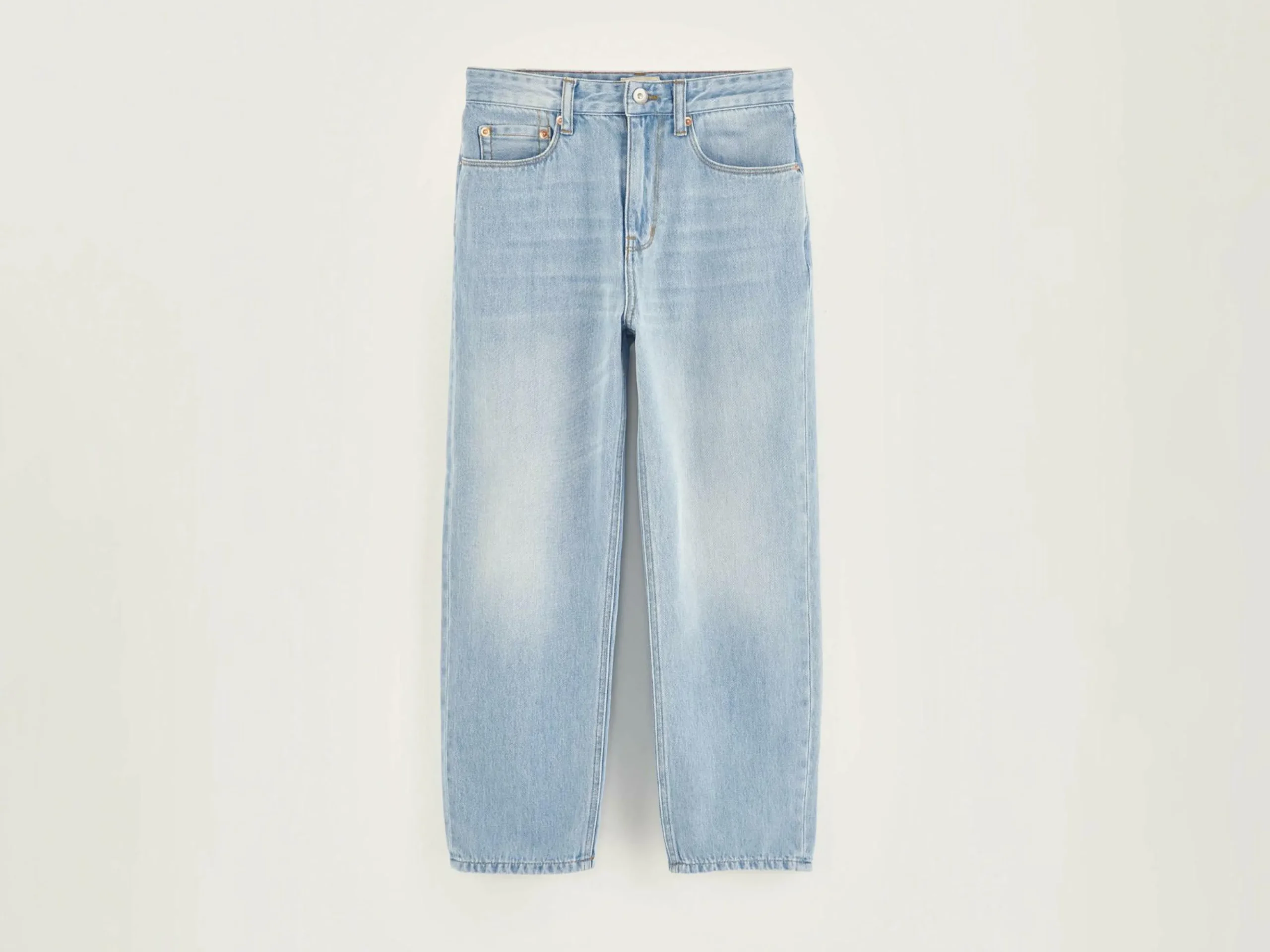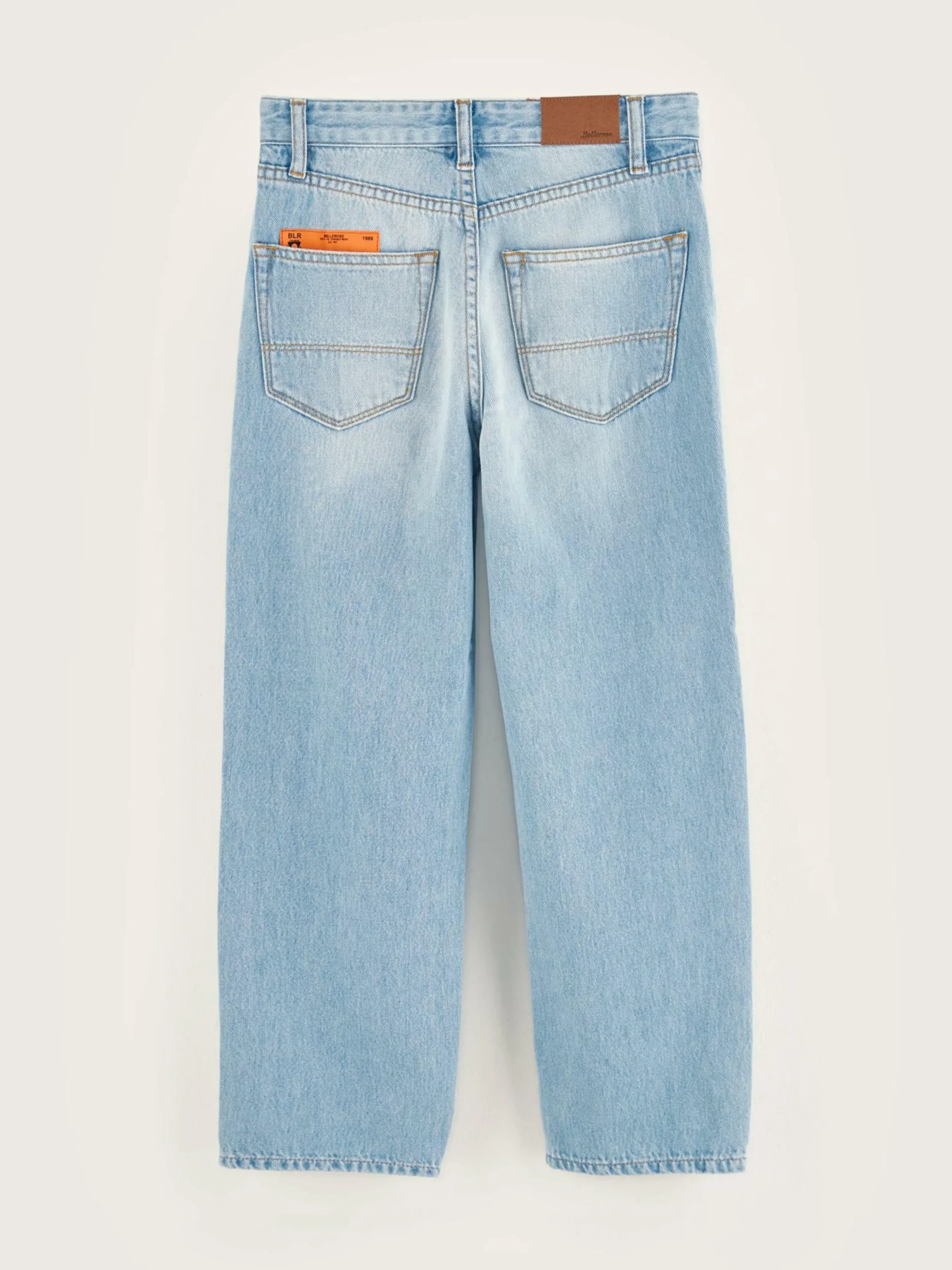 Jean décontracté à jambes larges en denim de coton bleu clair délavé.