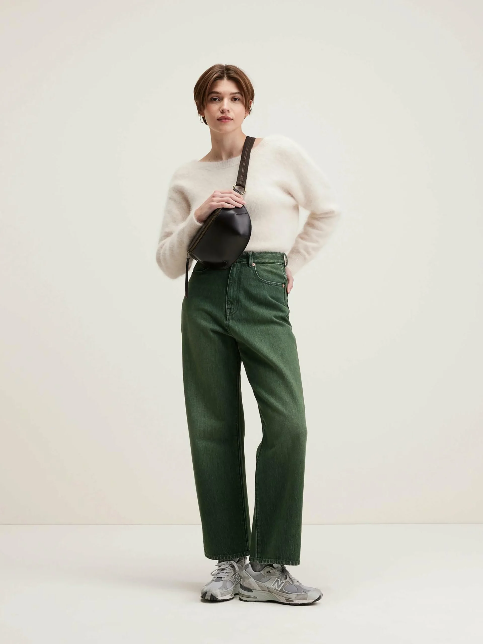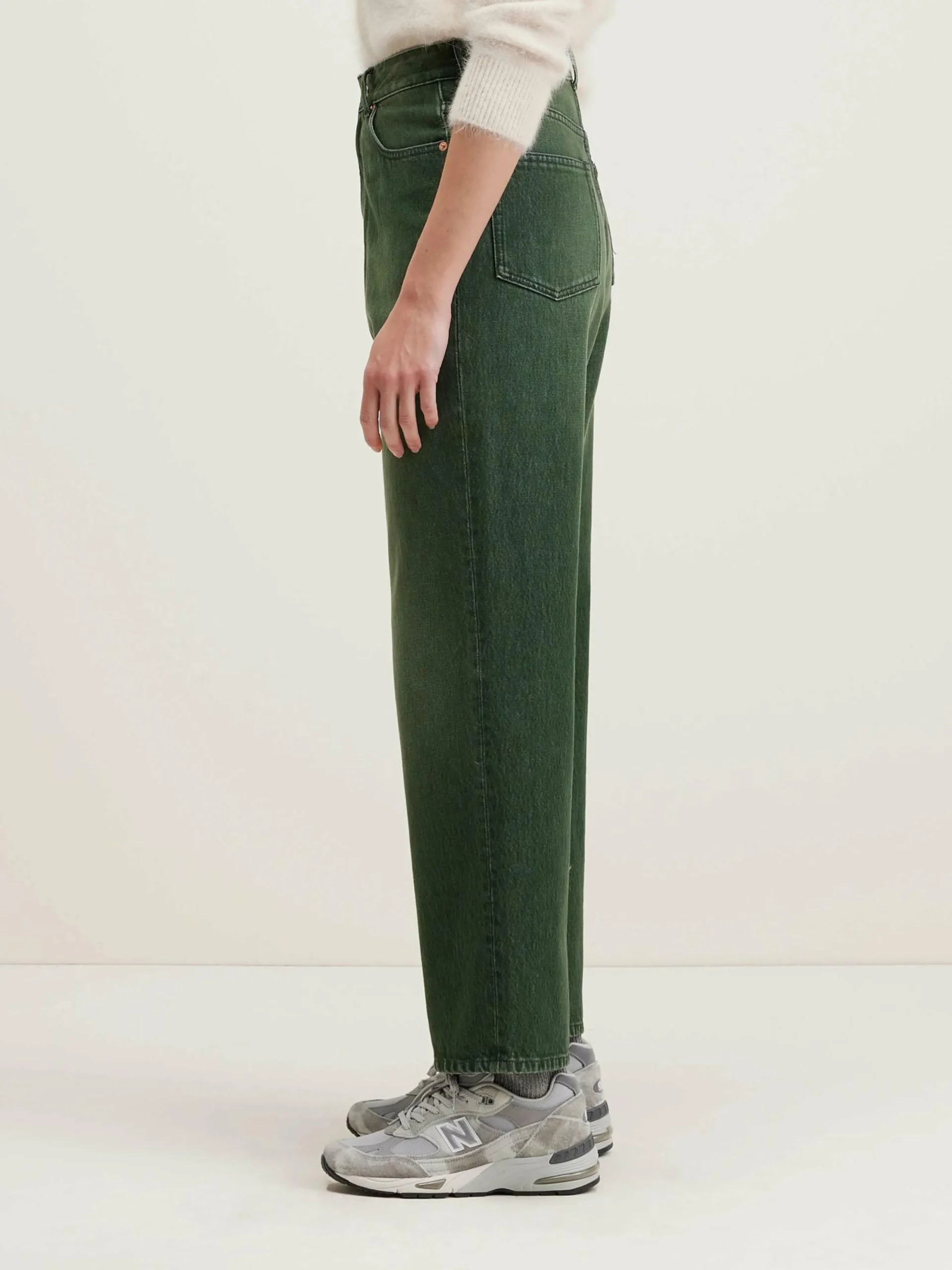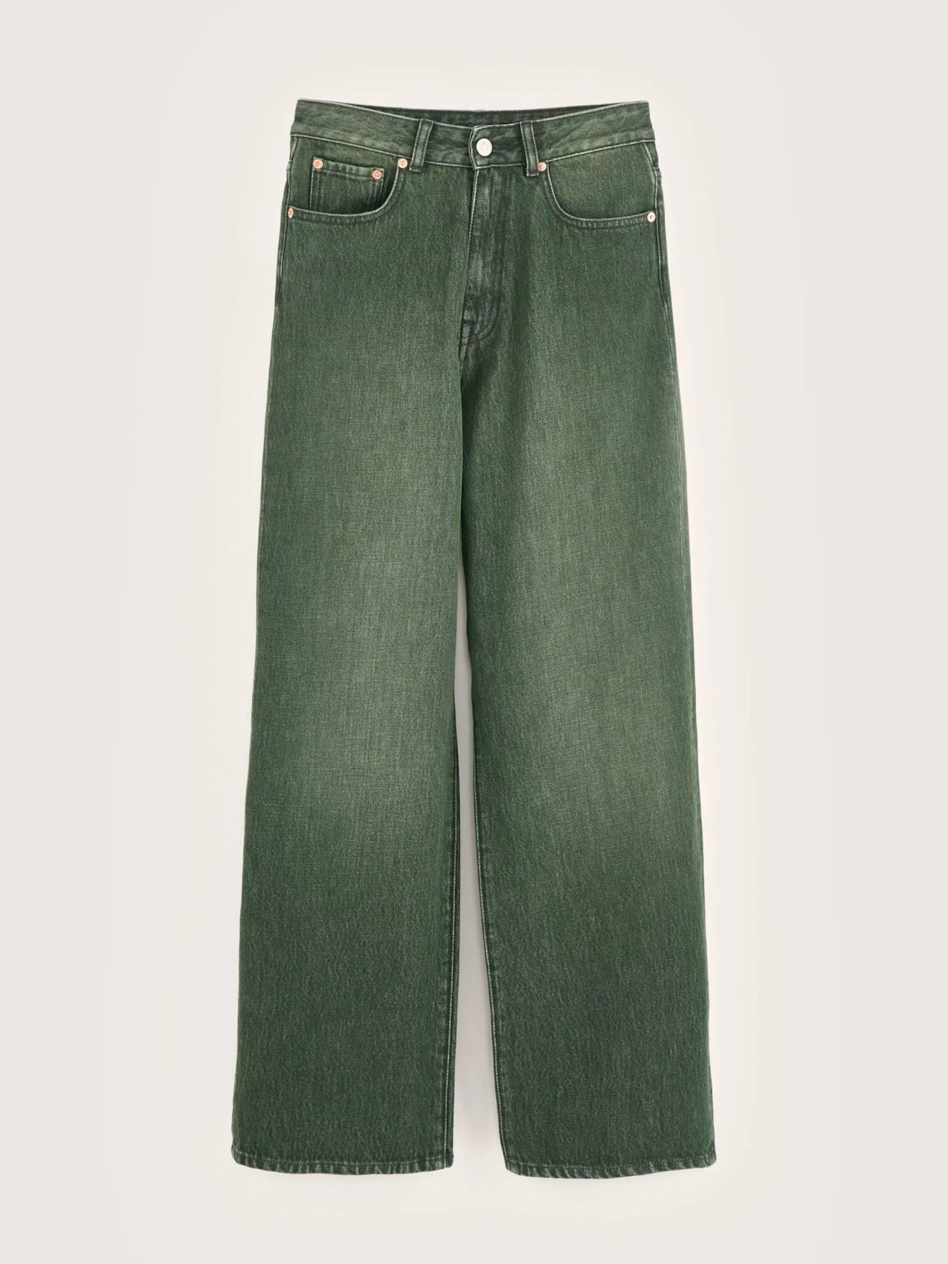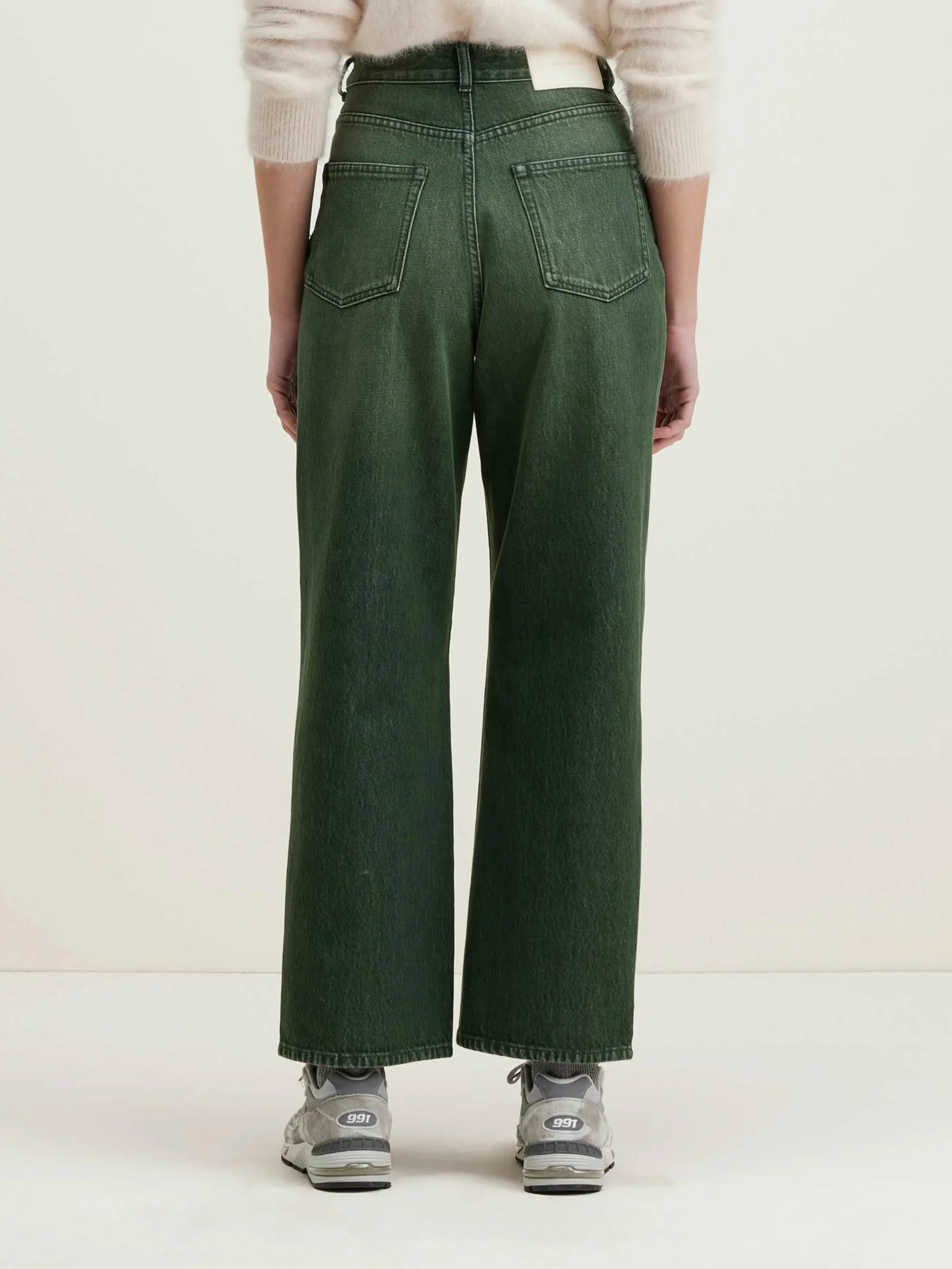 Jean taille haute emboîtante et jambes larges, en denim de coton vert.