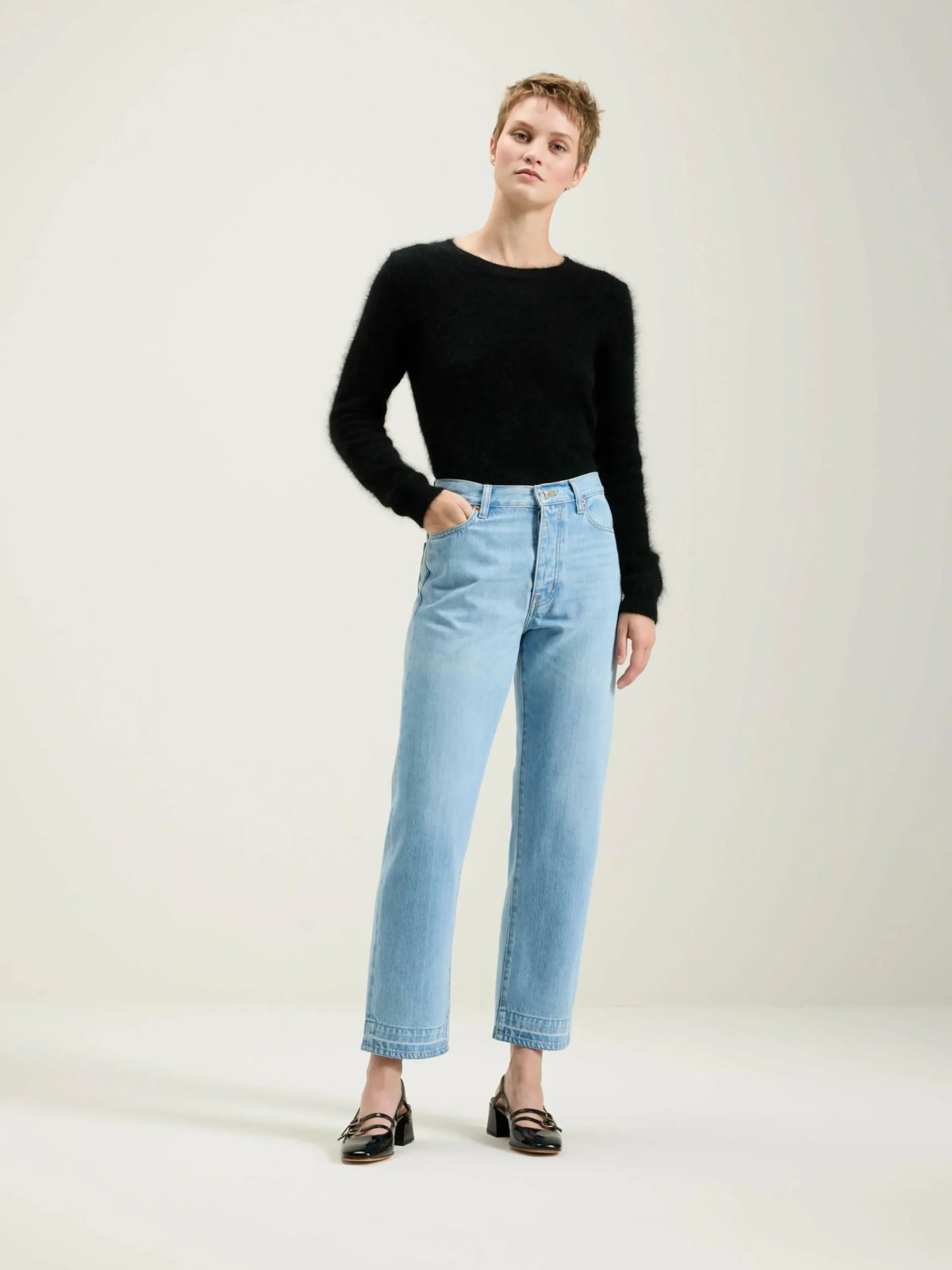 Jean régulier taille haute en denim de coton bleu clair usé.