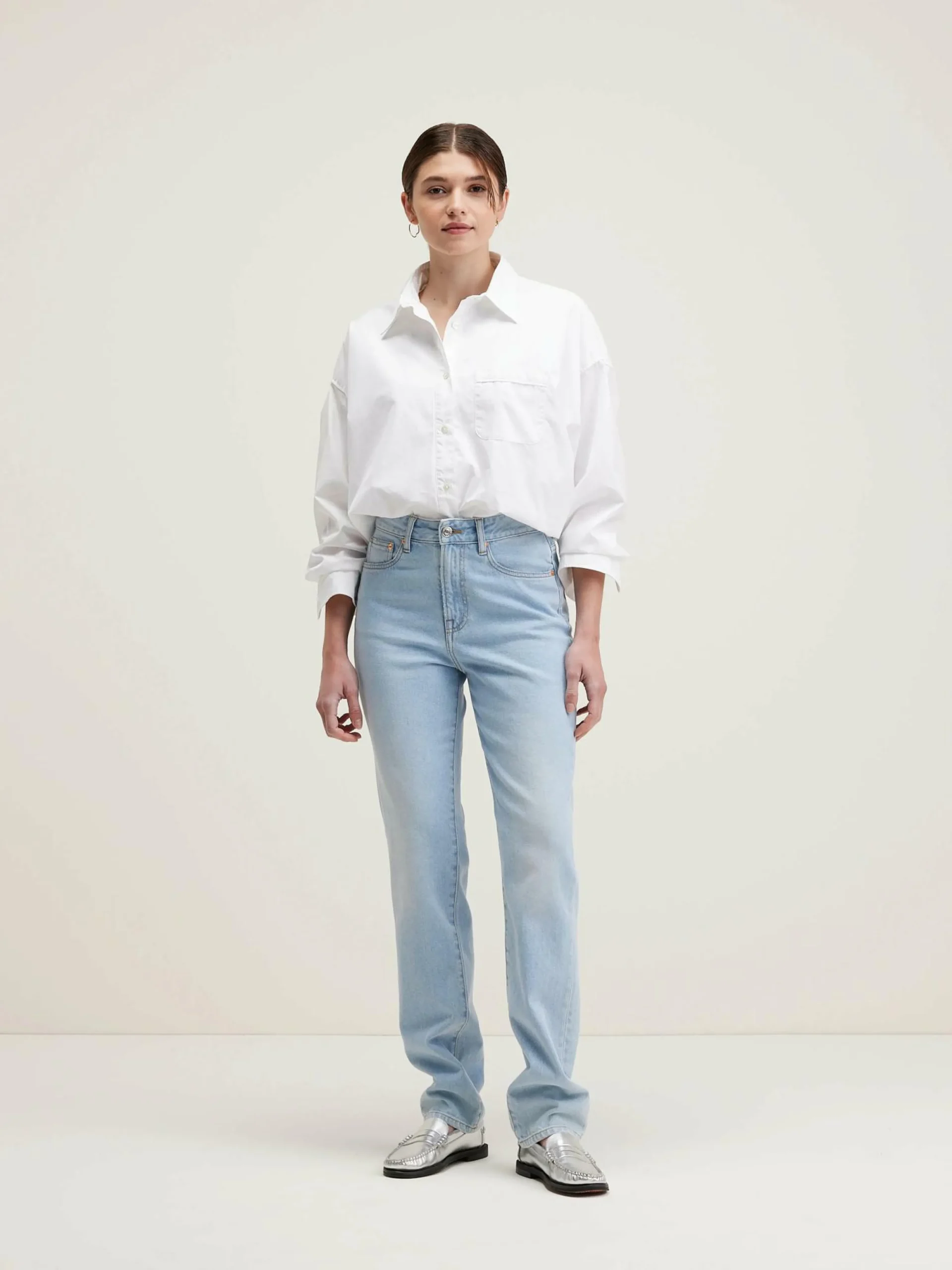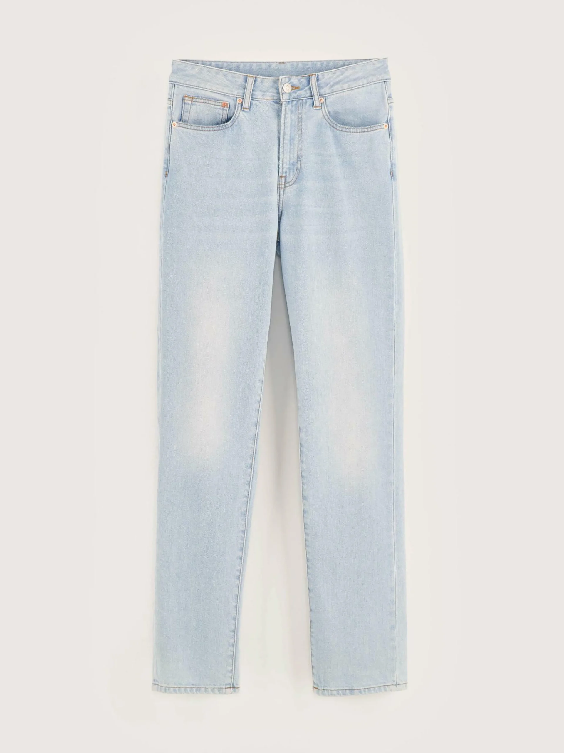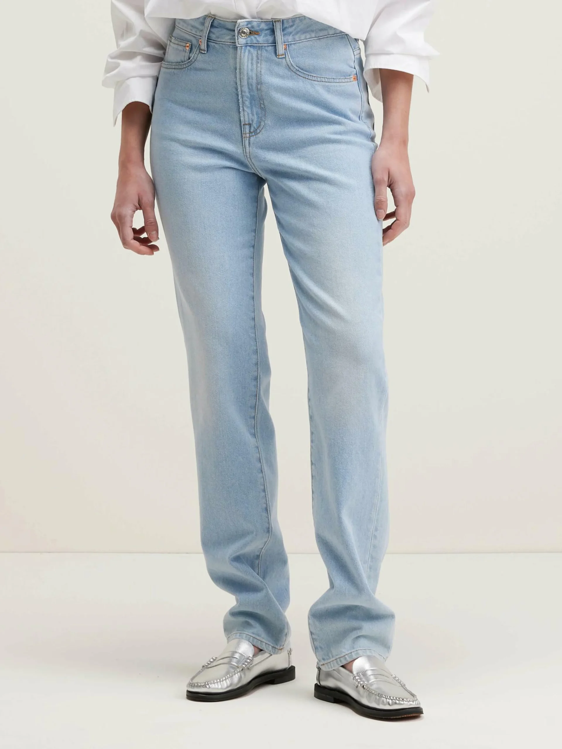 Jean slim taille haute en denim bleu clair délavé.