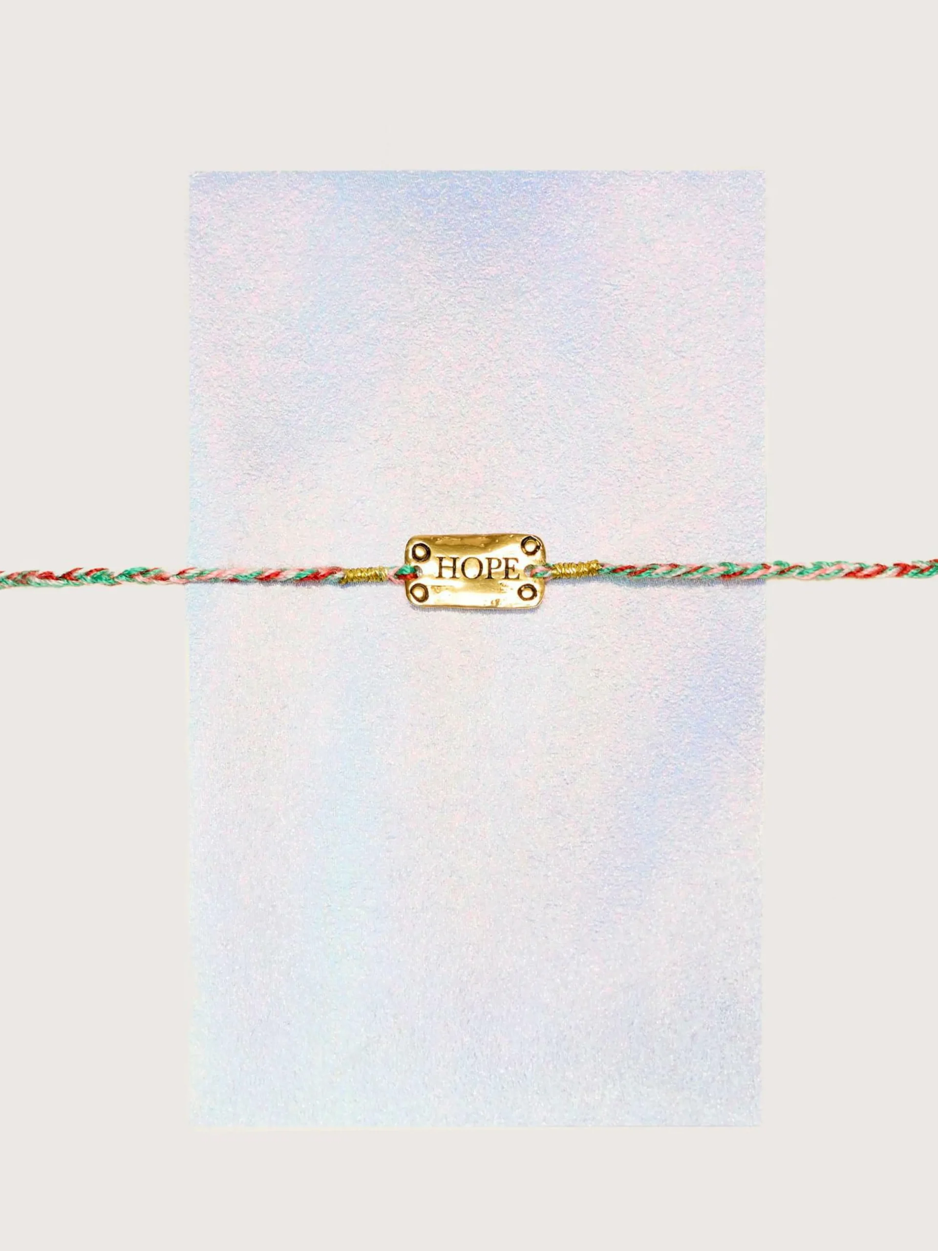 Le bracelet Hope est un tressage ajustable, fabriqué à la main au fil fin, et ornée d’un charm « Hope » plaquée or.