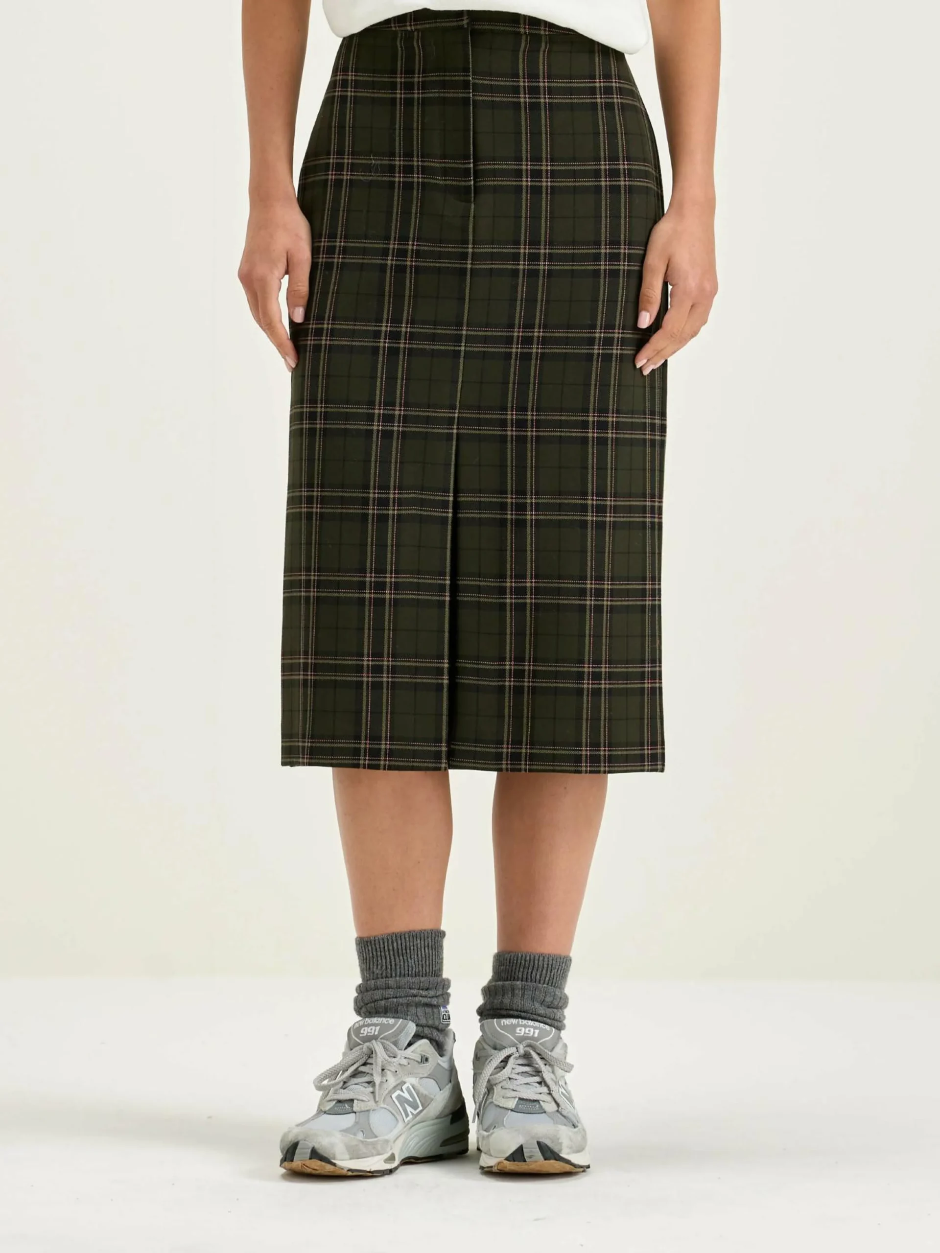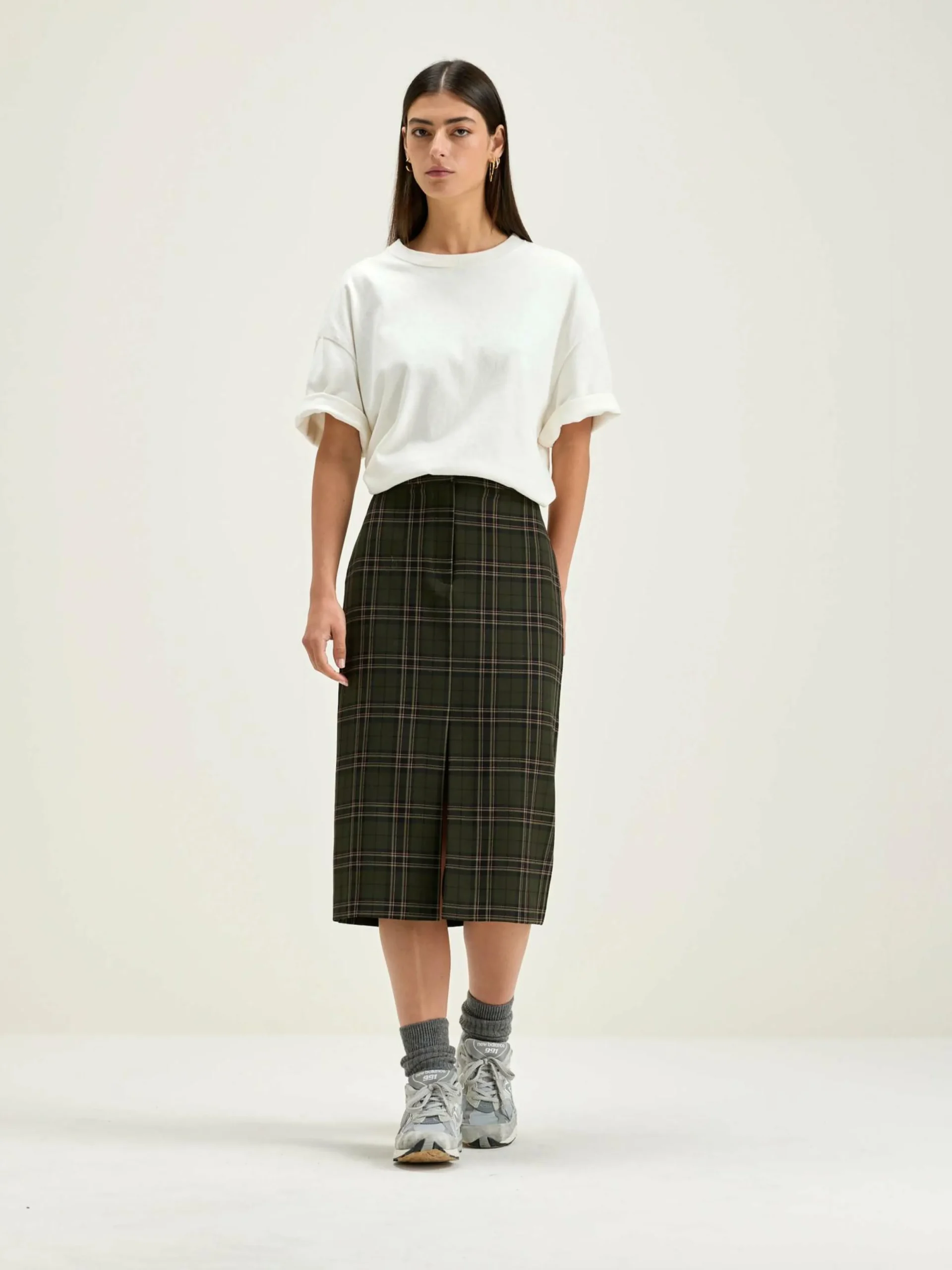 Jupe à carreaux, forme crayon et fendue sur l’avant, taille haute et poches discrètes.