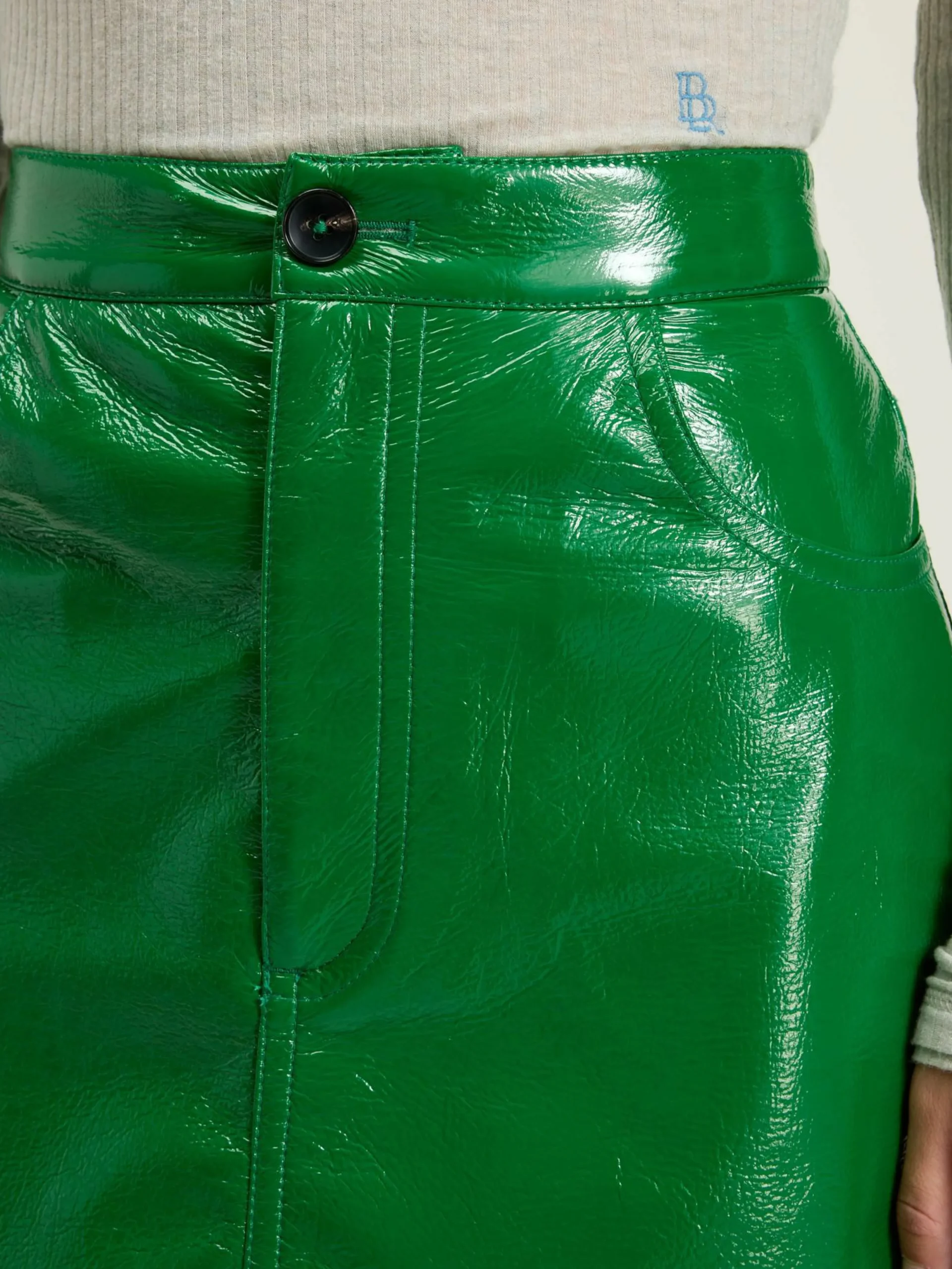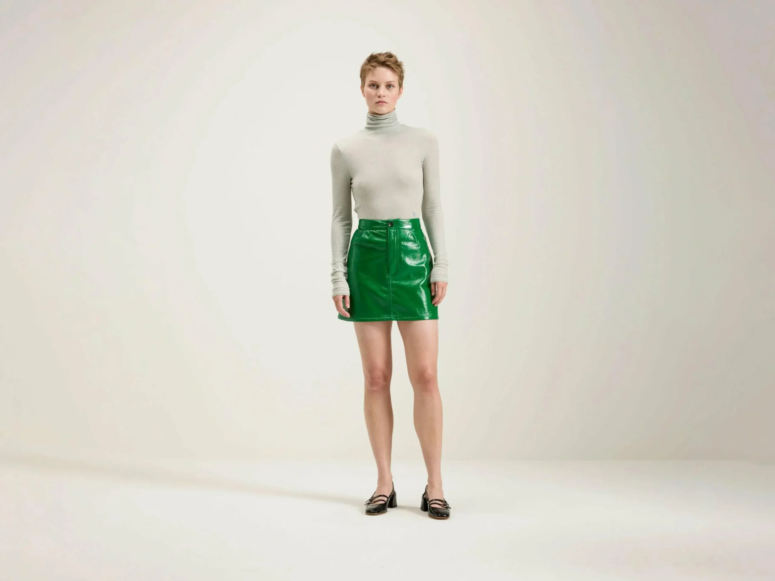 Minijupe en vinyl vert menthe, forme trapèze et style 5 poches.