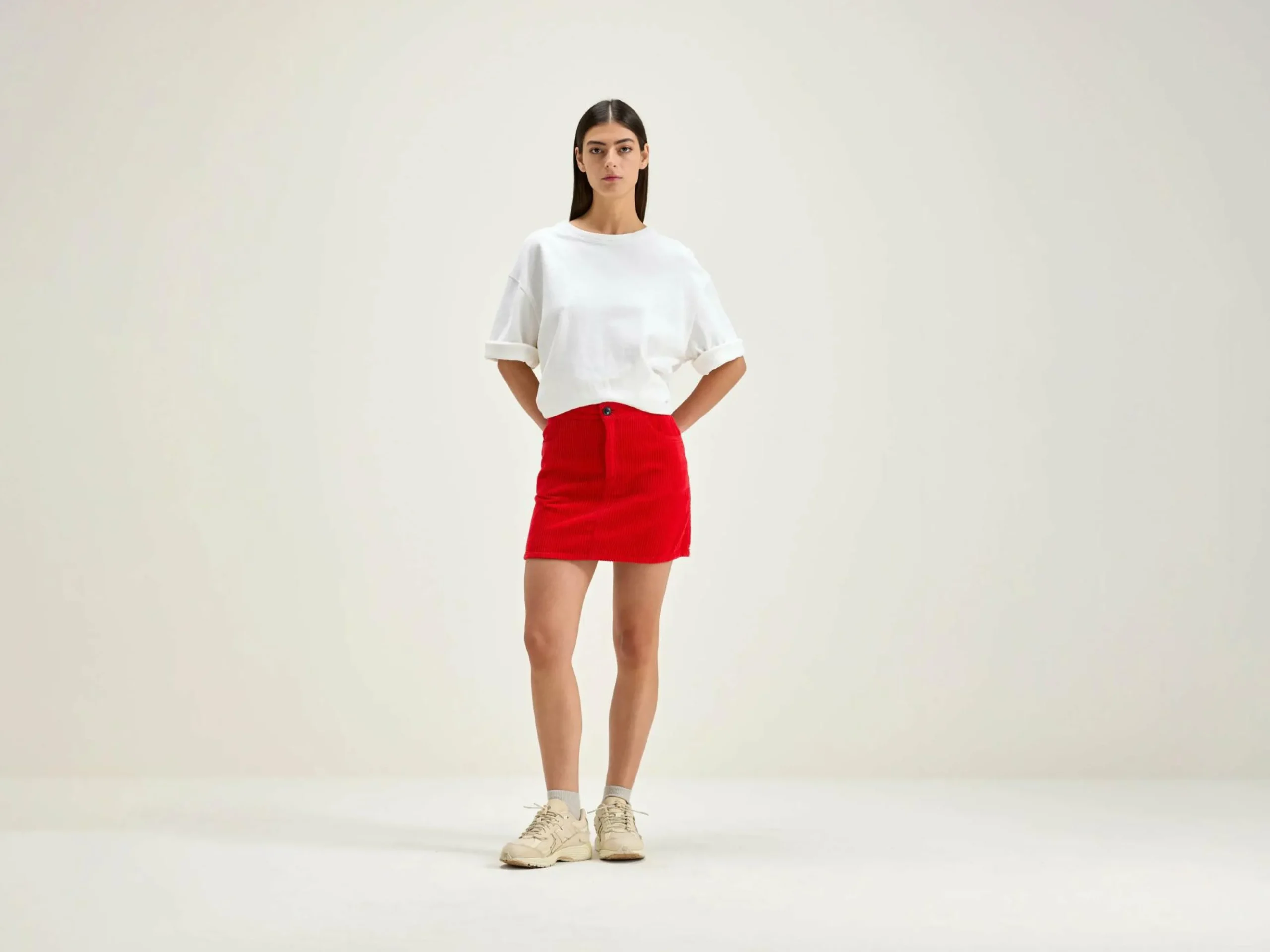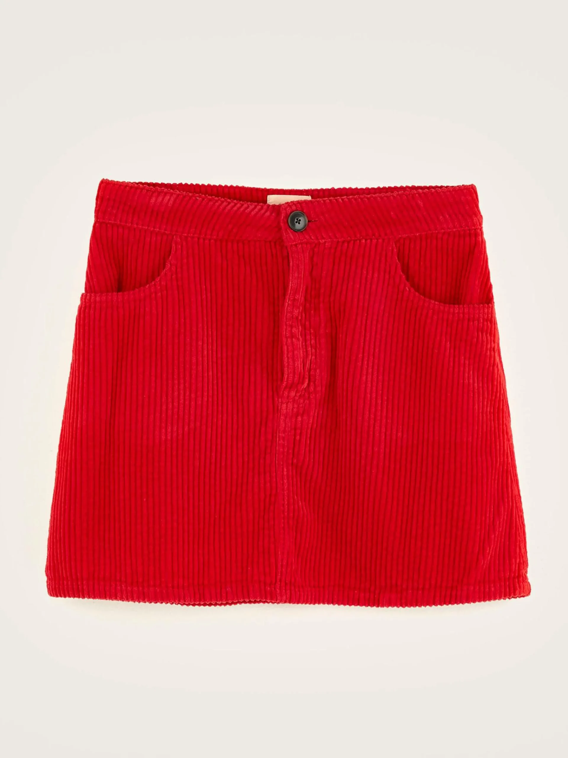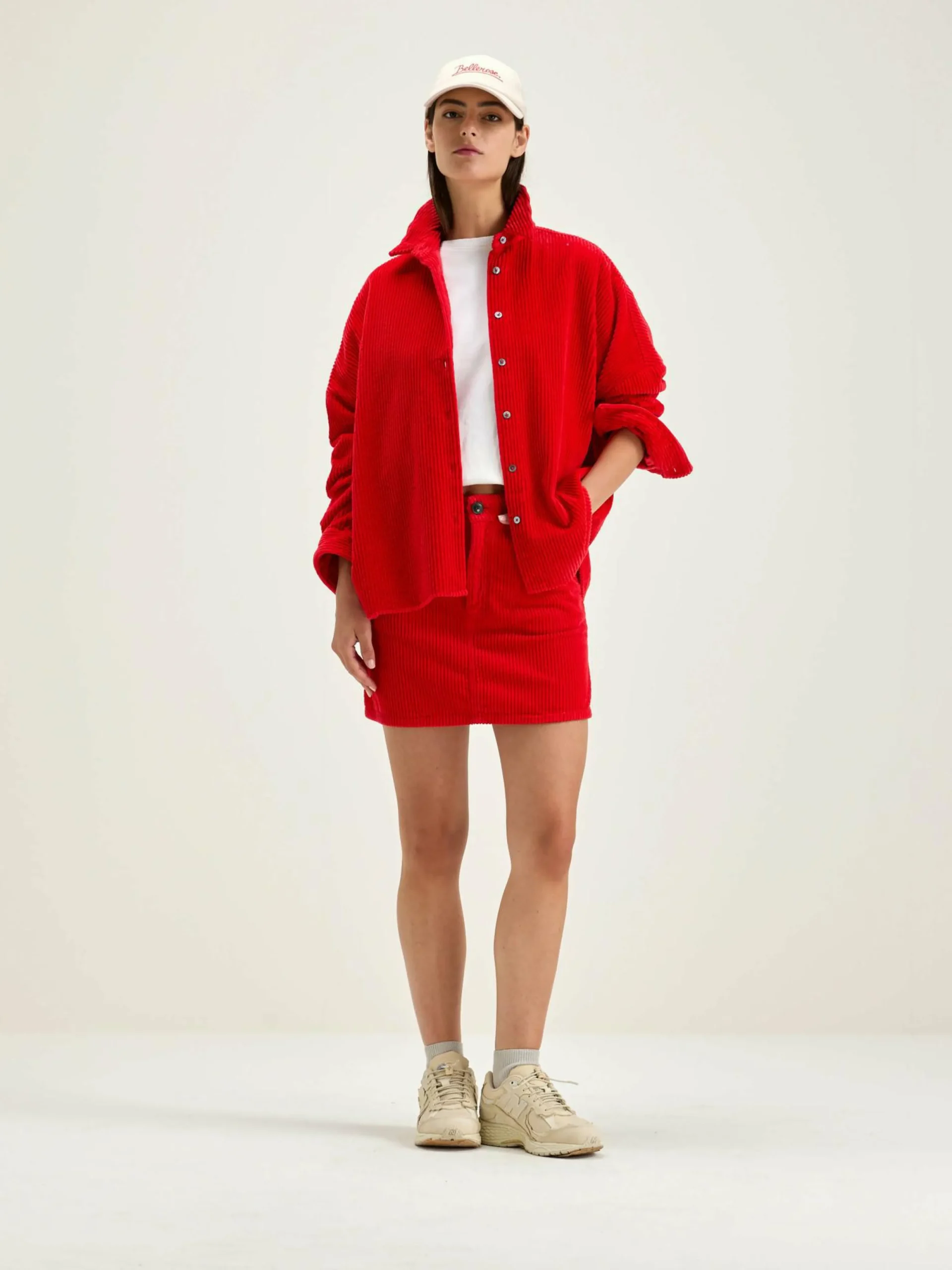 Mini-jupe en velours côtelé rouge, forme trapèze et style 5 poches.