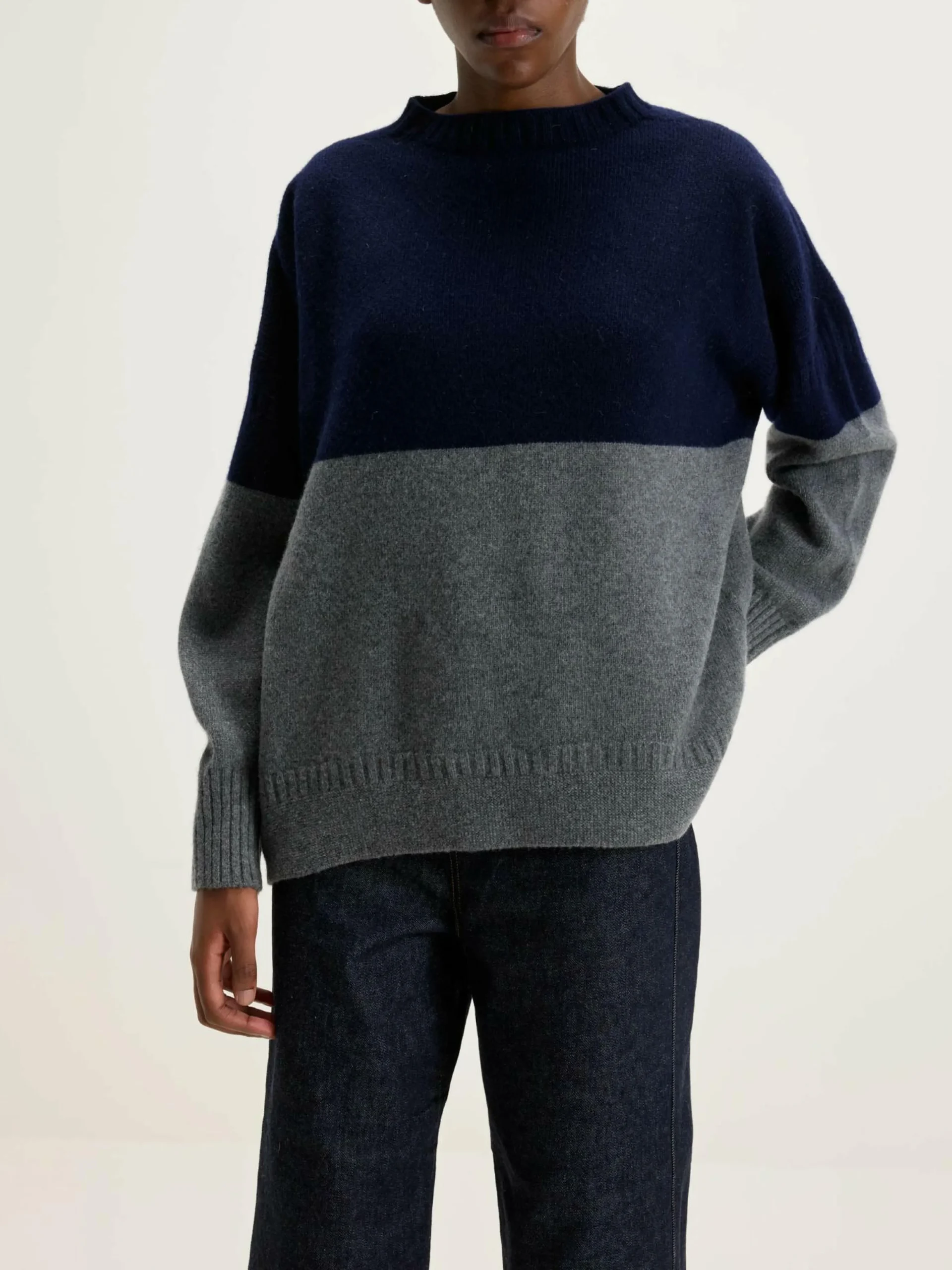 Le pull à col montant Hariot de la marque japonaise de luxe Nicholson & Nicholson présente une coupe polyvalente à enfiler et un col court, réalisés dans un motif de tricot de pêcheur doux.