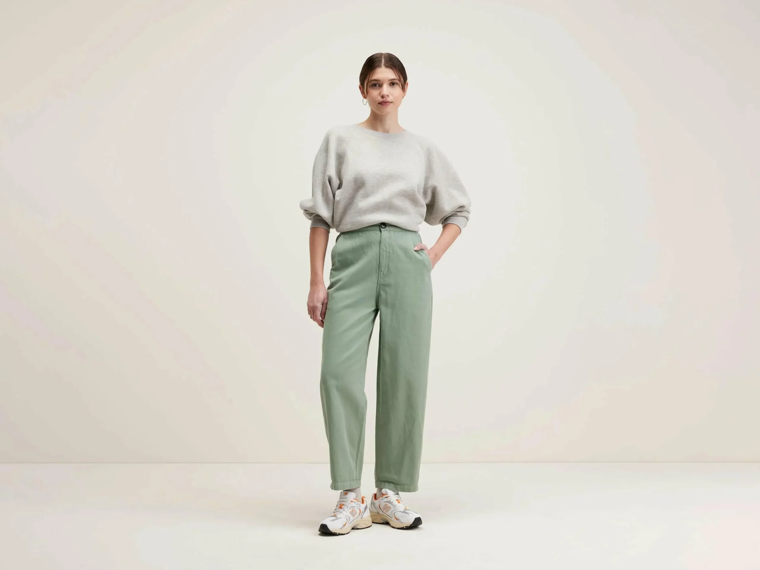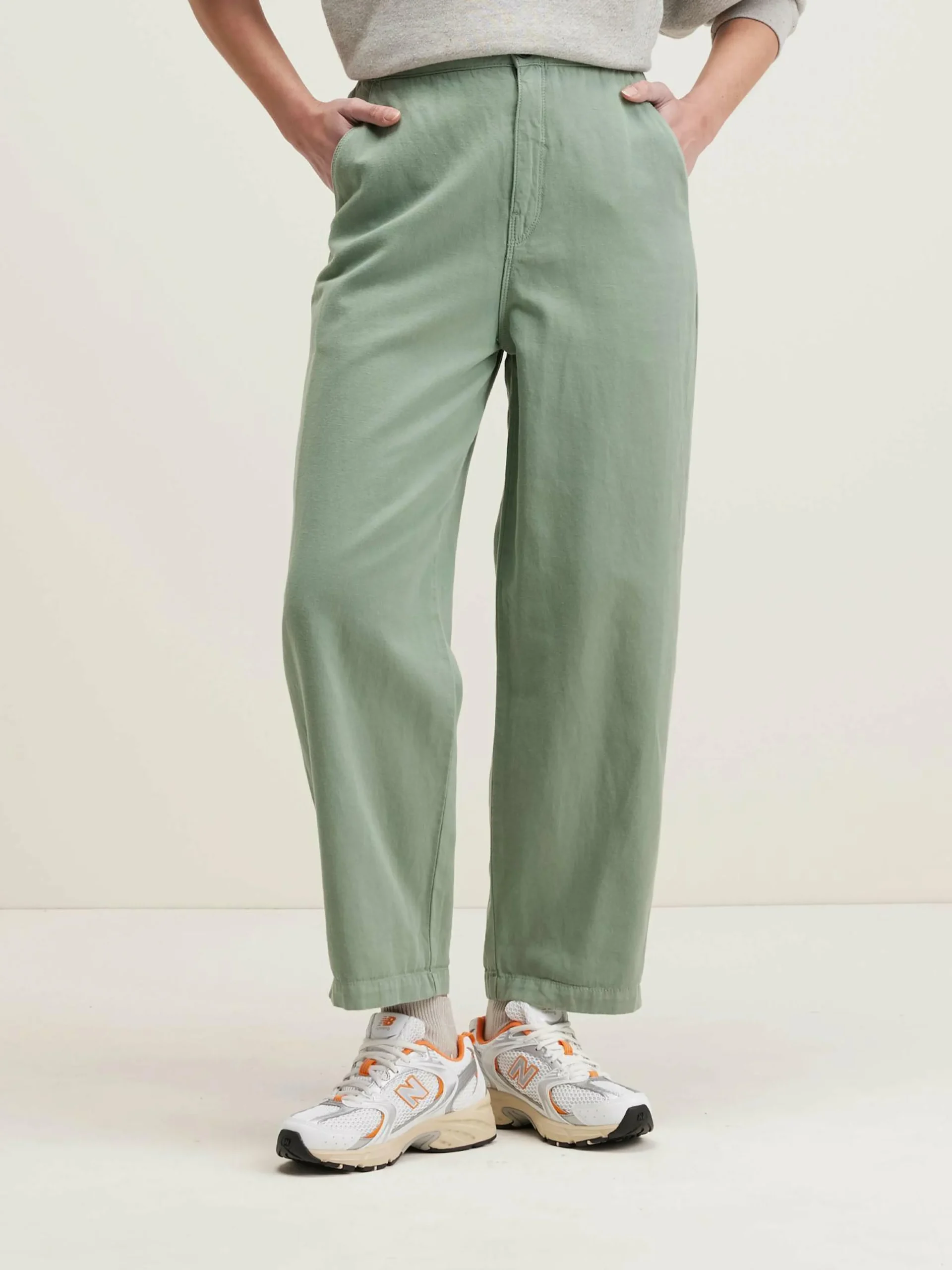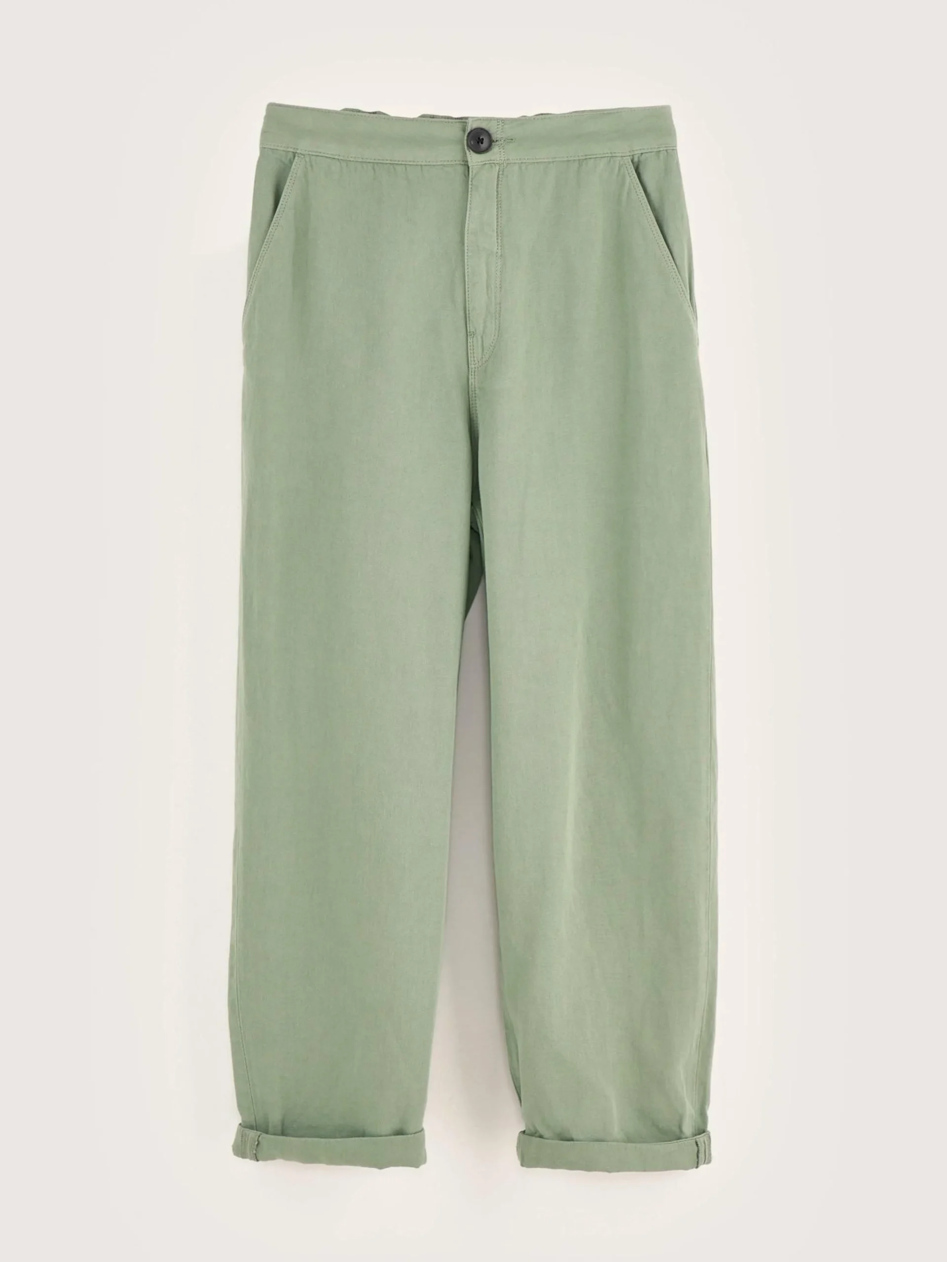 Pantalon décontracté en toile de coton et lin vert eucalyptus.