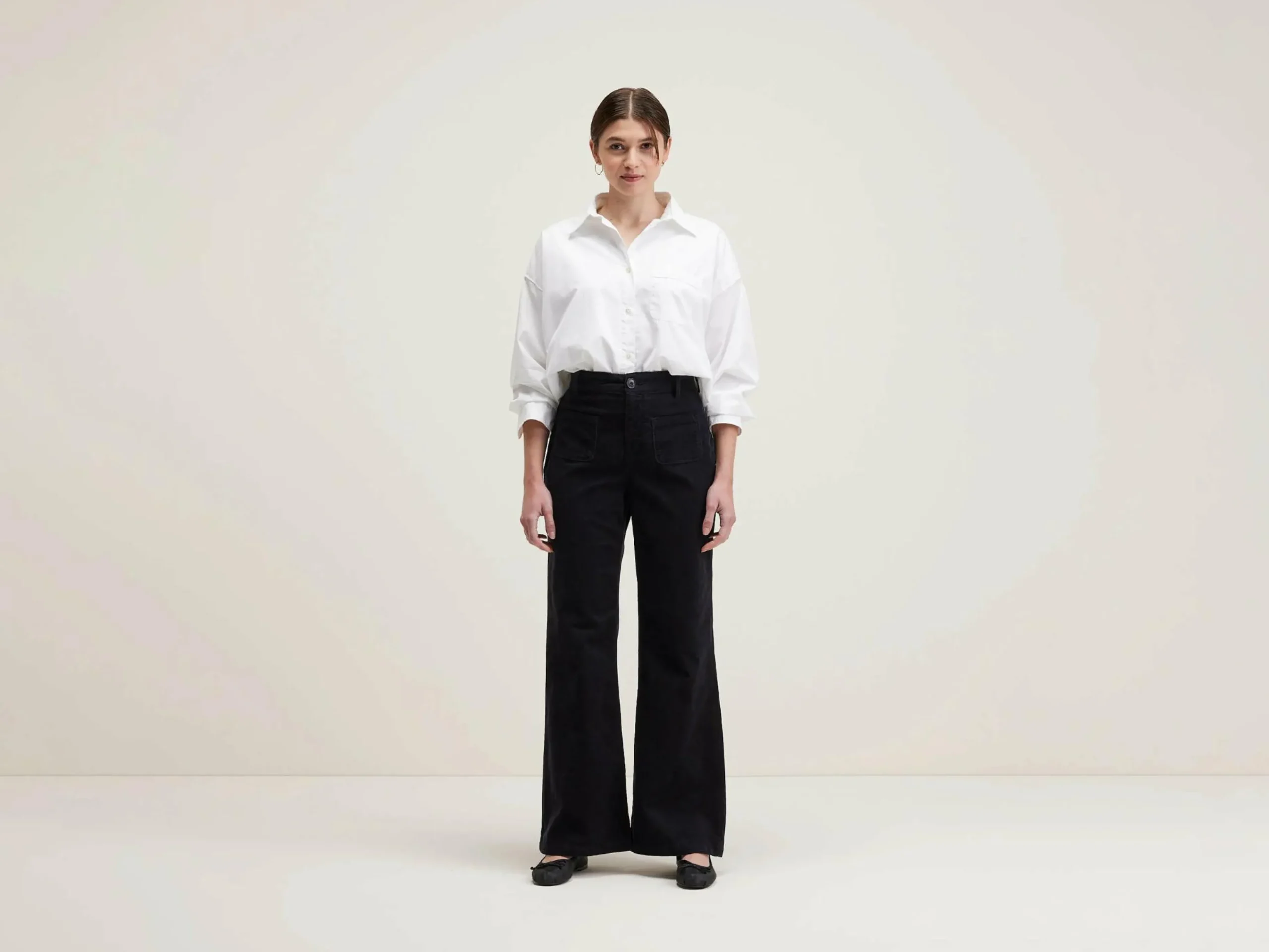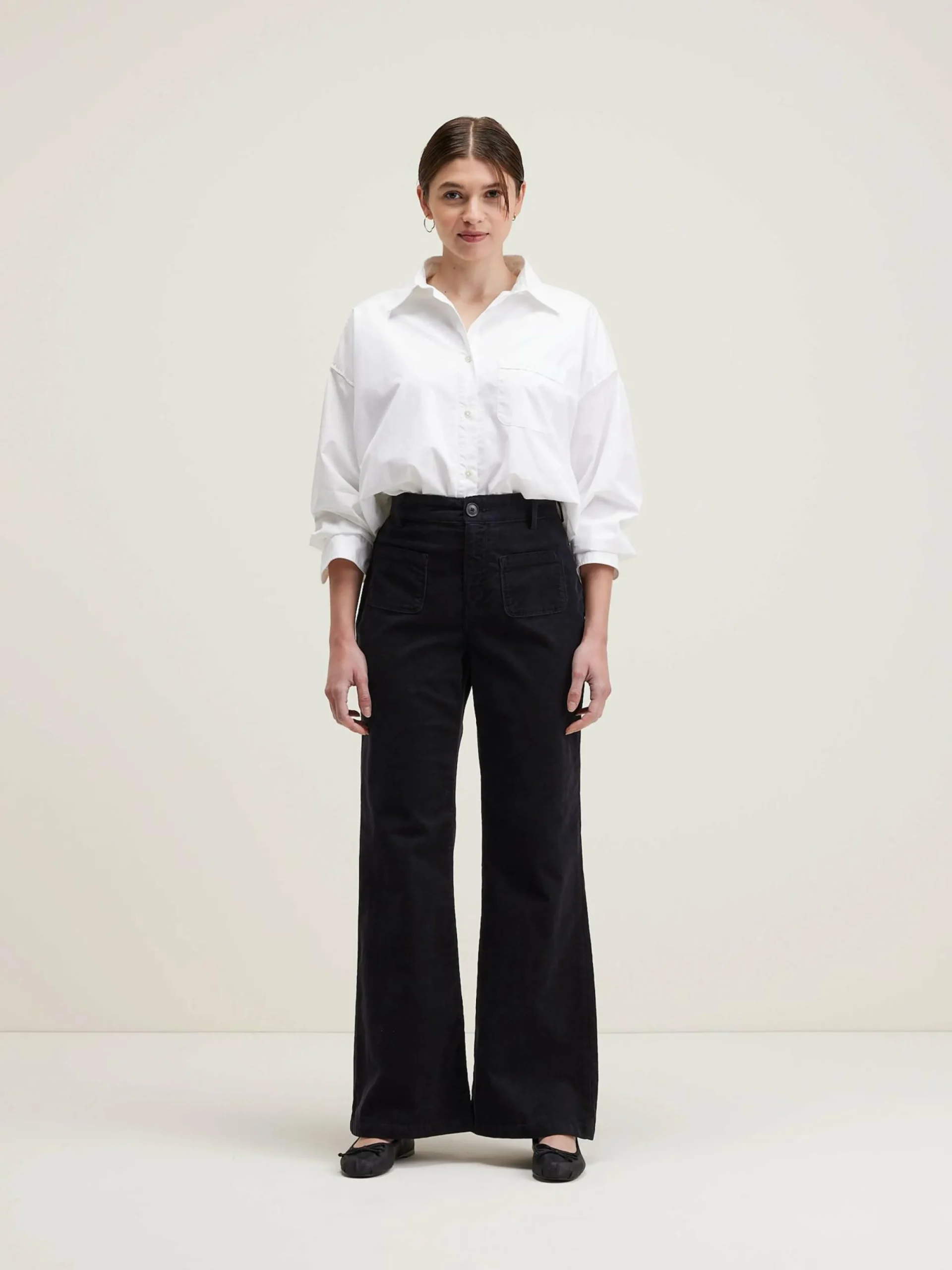 - Taille haute, jambes évasées