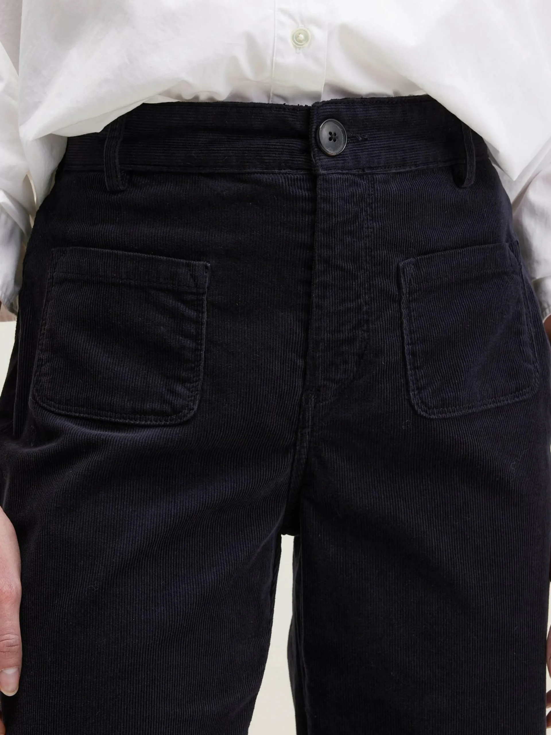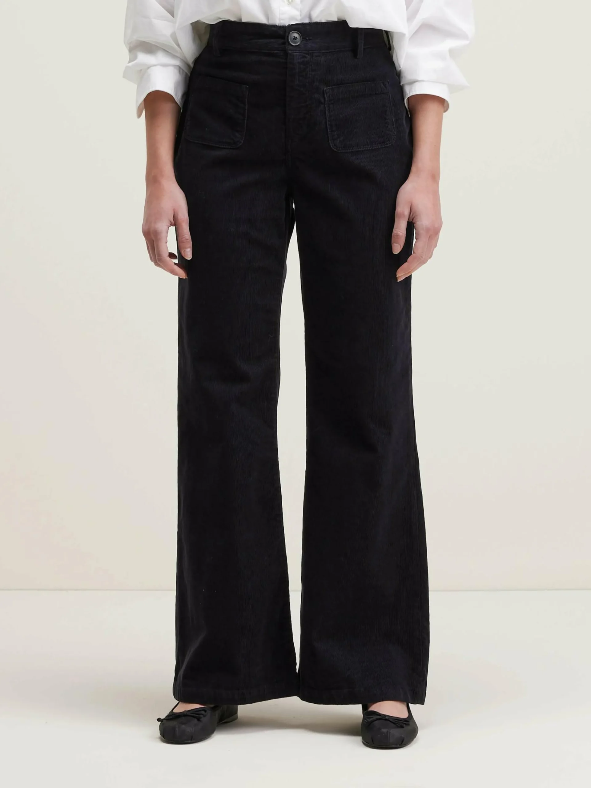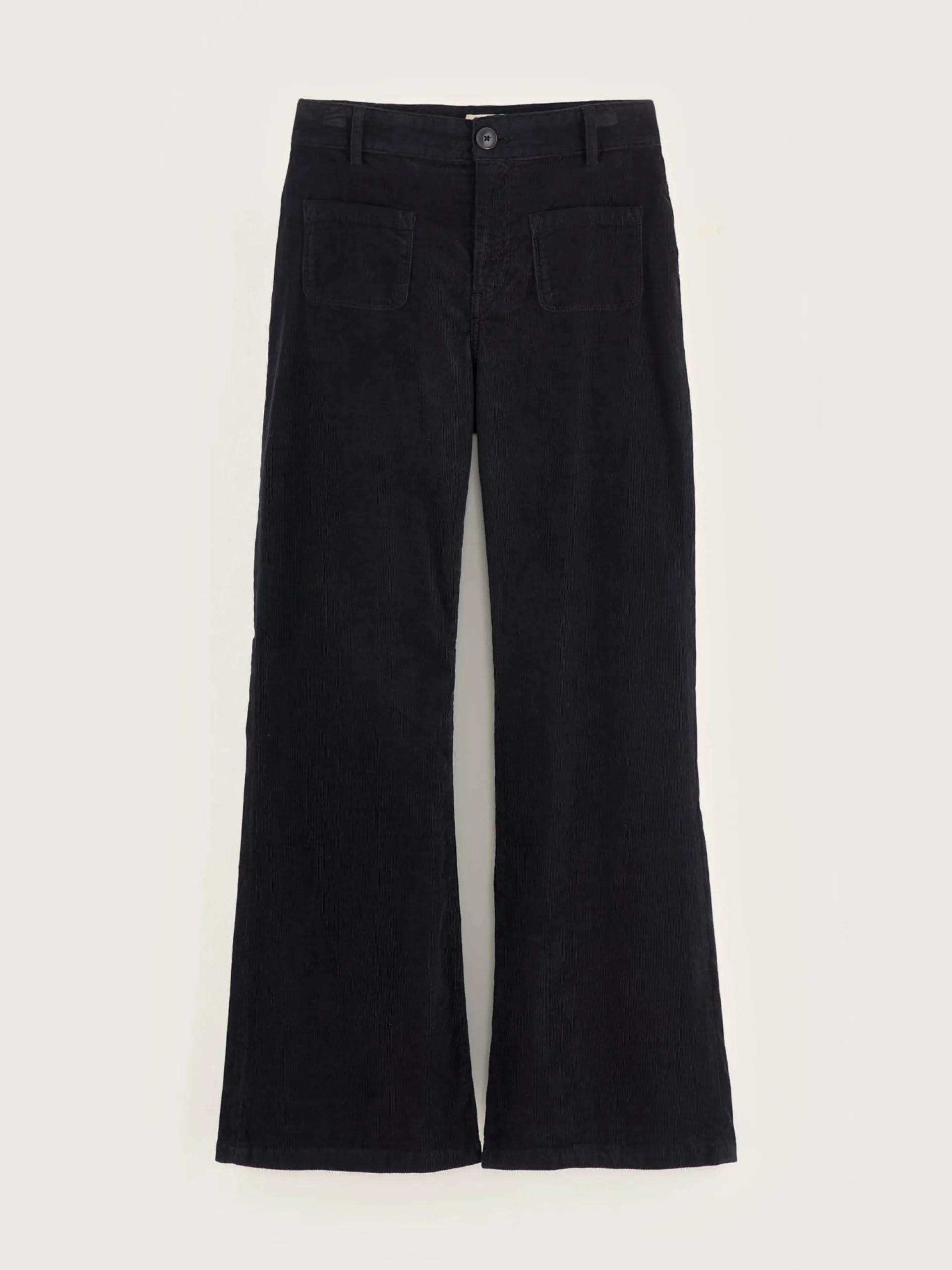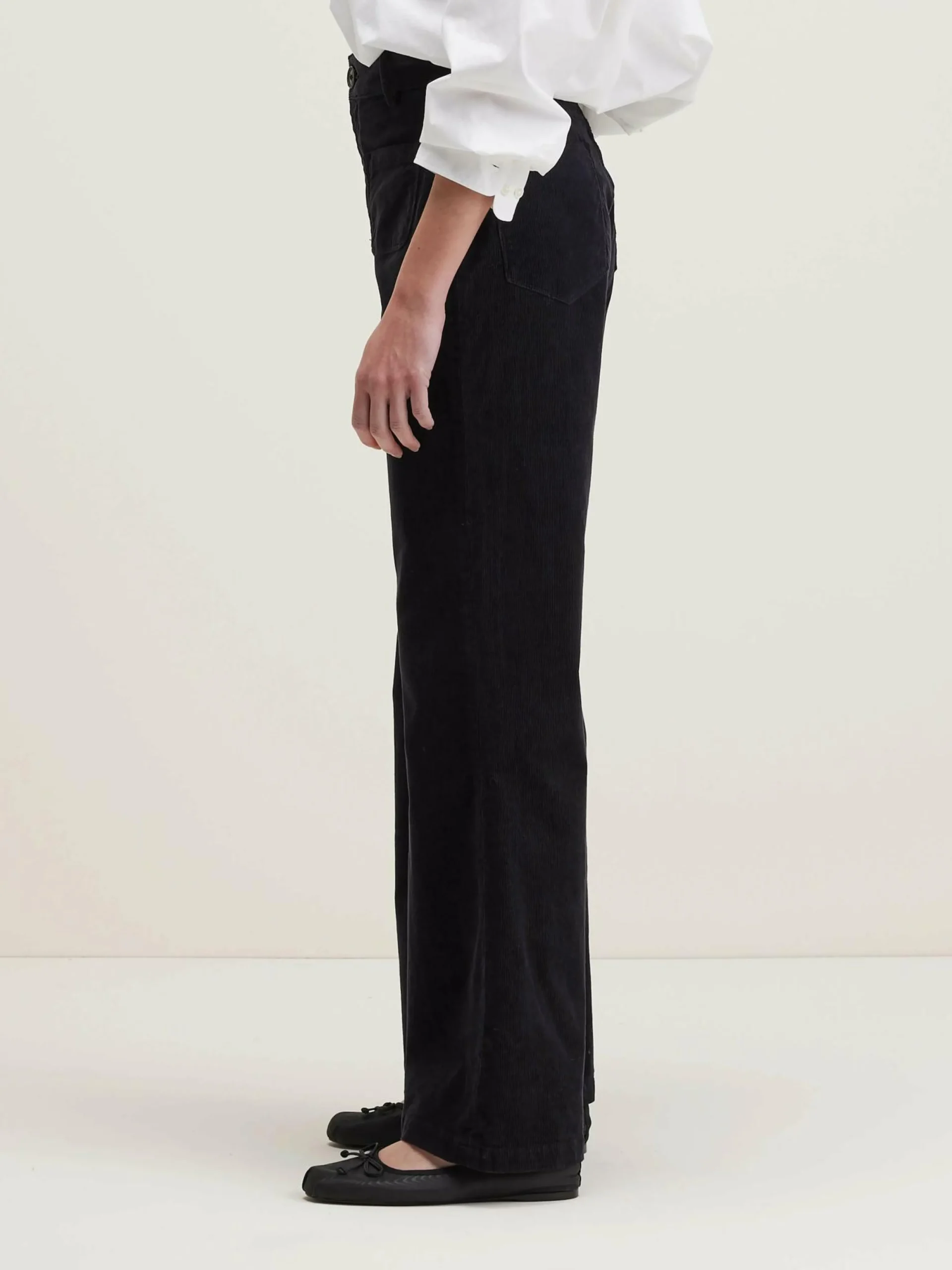 Pantalon taille haute, jambes flared en velours milleraies noir.